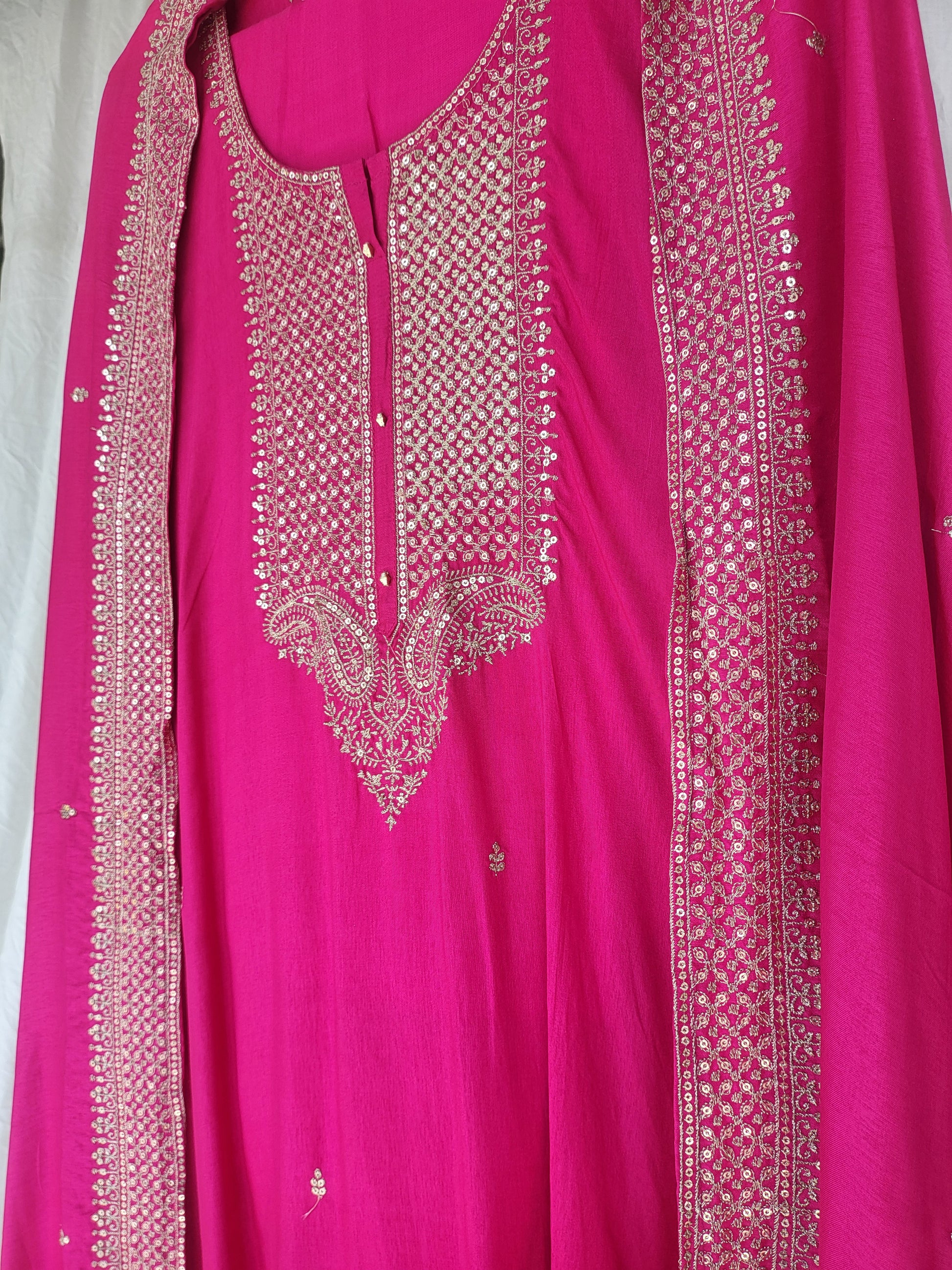 Crafted in premium silk or organza silk, our suits feature intricate handwork and Banarasi weaving, paired with a designer dupatta. The santoon silk bottom ensures comfort, and the semi-stitched design fits XS to 2XL. Perfect for festive and wedding wear, customize it to your style!