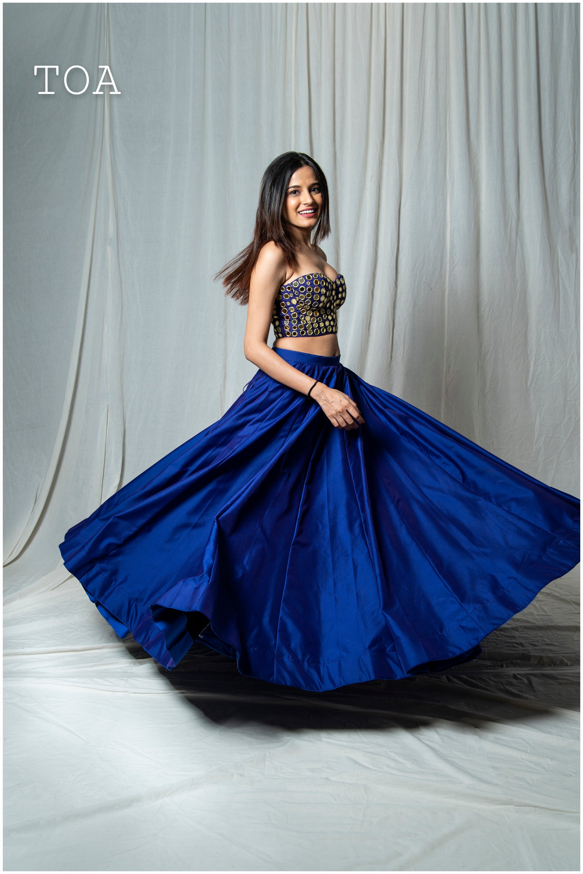 The skirt is crafted from luxurious silk fabric, tailored into 32 beautifully stitched kallis, creating an impressive flare of over 12.5 meters. Complete with functional zip pockets, this plain yet voluminous skirt adds a magical charm with every twirl.