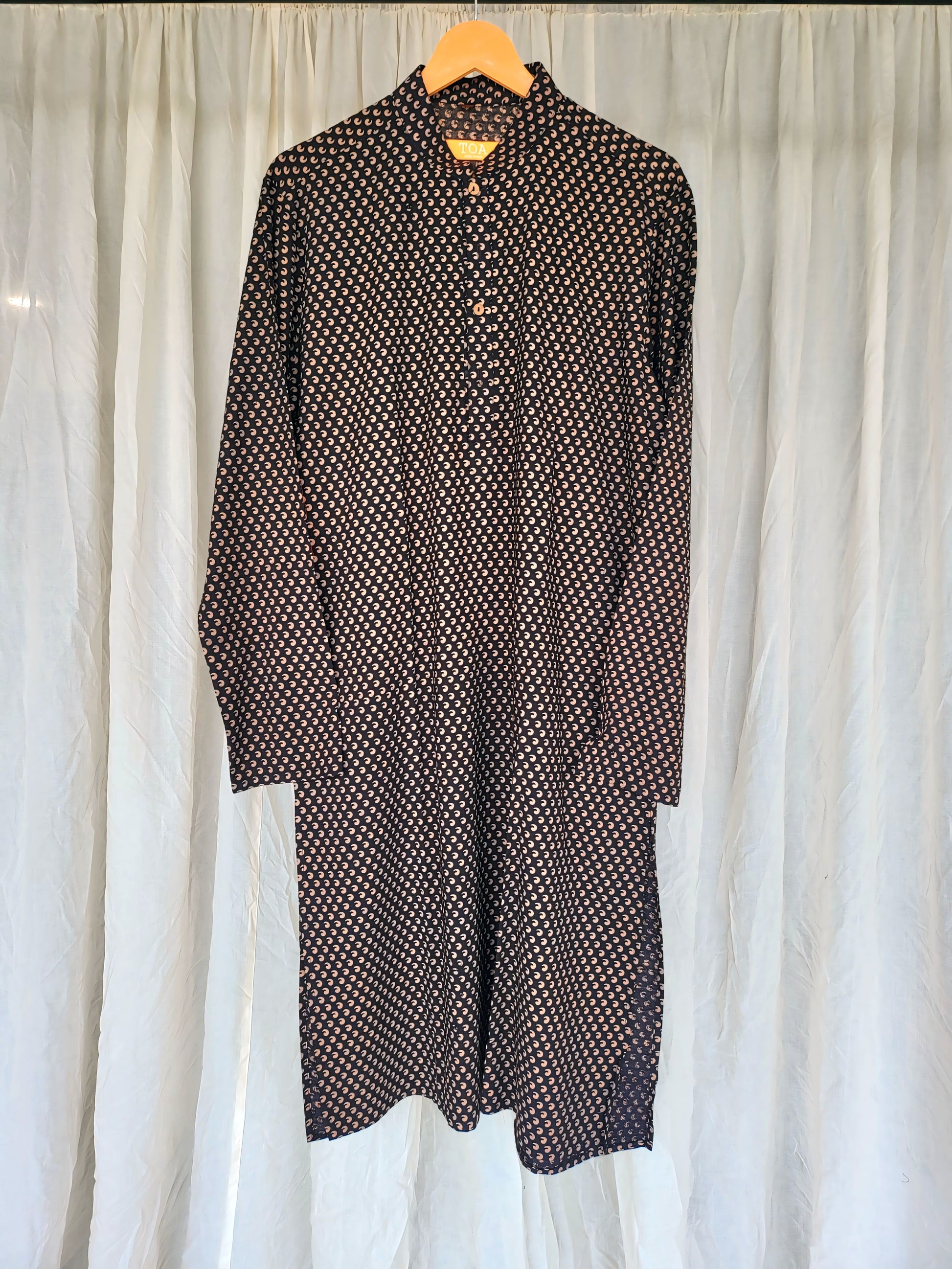Due to high demand for couple matching outfits, TOA is proud to introduce our men's kurta collection for the first time ever. Crafted from pure vegetable cotton with hand block prints, these kurtas are designed for ultimate comfort and style. Each kurta features convenient pockets, wooden buttons, and a round collar, offering a look that is both simple and elegant. Whether for Navratri, a special occasion, or everyday office wear, our kurtas ensure you feel classy and sophisticated.