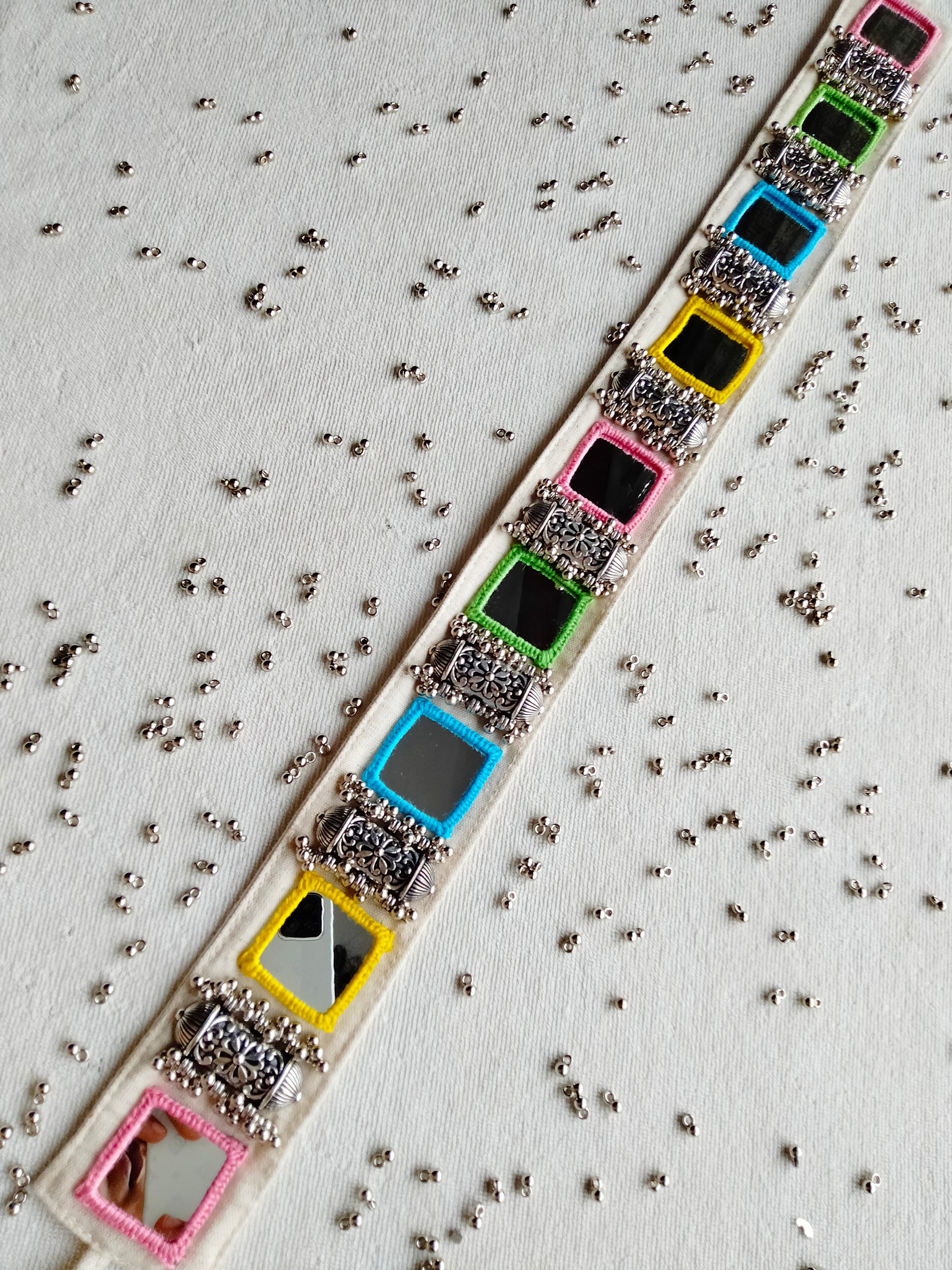 This Mirror Waist Belt features intricate real mirror handwork, extending up to 23 inches in length. Crafted from high-quality oxidised material, it offers durability and a distinctive antique finish. Perfect for adding a traditional yet elegant touch to your outfit, this belt combines craftsmanship with lasting style.