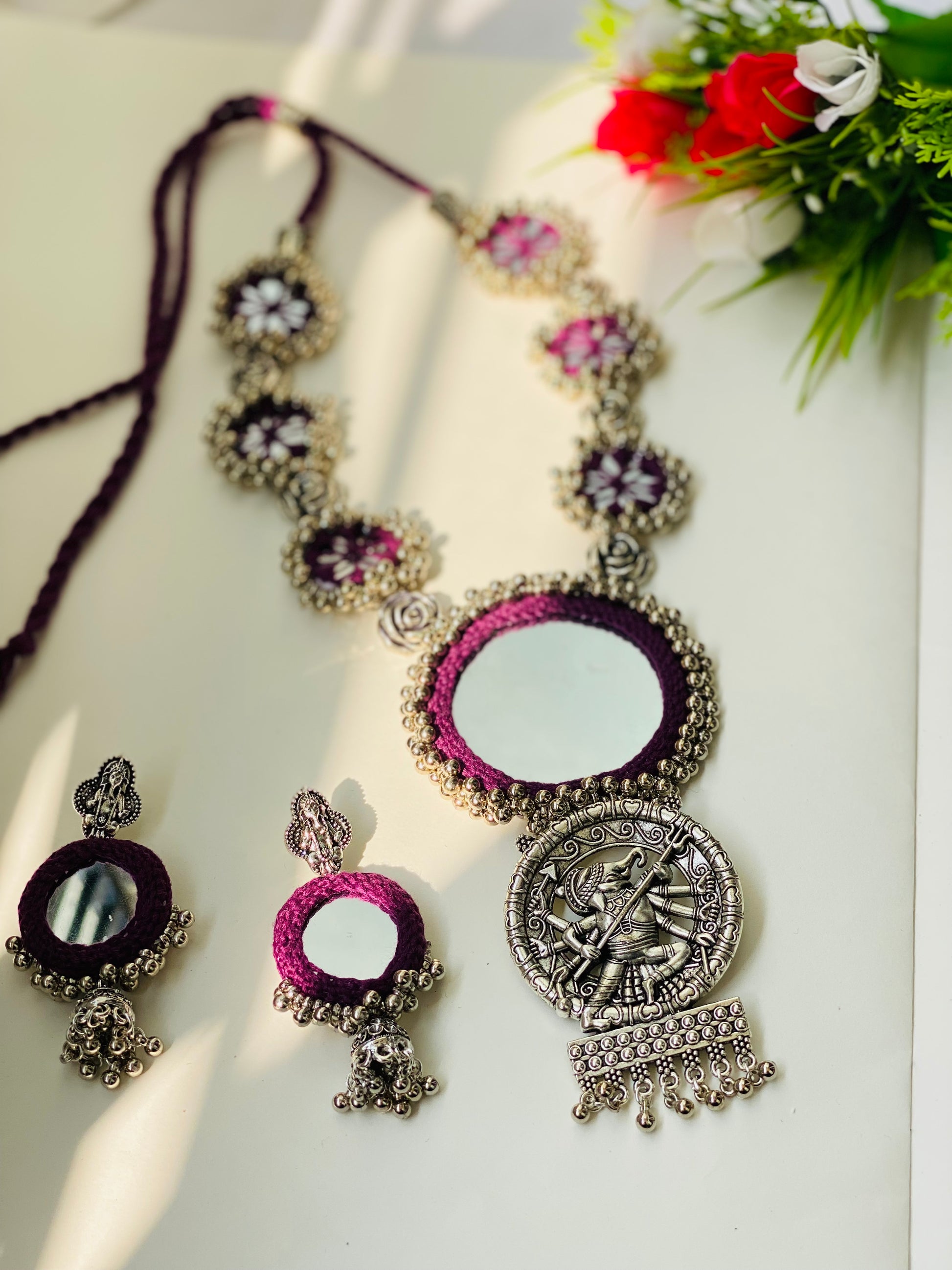 This Black Mirror Oxidized Necklace features detailed mirror embellishments paired with oxidized accents, resulting in a distinctive and fashionable piece. Its adjustable dori allows for a personalized and comfortable fit, perfect for diverse events. Skillfully designed, this necklace enhances your outfit with elegance while providing both versatility and sophistication.