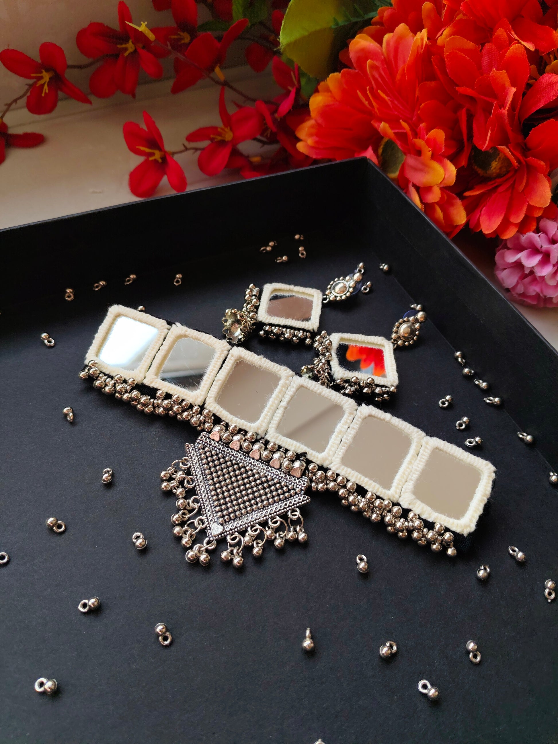 This choker necklace features a round flower design with intricate hand-embroidered mirrors, accented by silver-polished plastic ghughri and natural cowrie shells. It includes an adjustable dori for a perfect fit, measuring 7 inches in length and 1.7 inches in width. The lightweight earrings complement the set with a length of 1.6 inches, combining traditional craftsmanship with comfortable wear.
