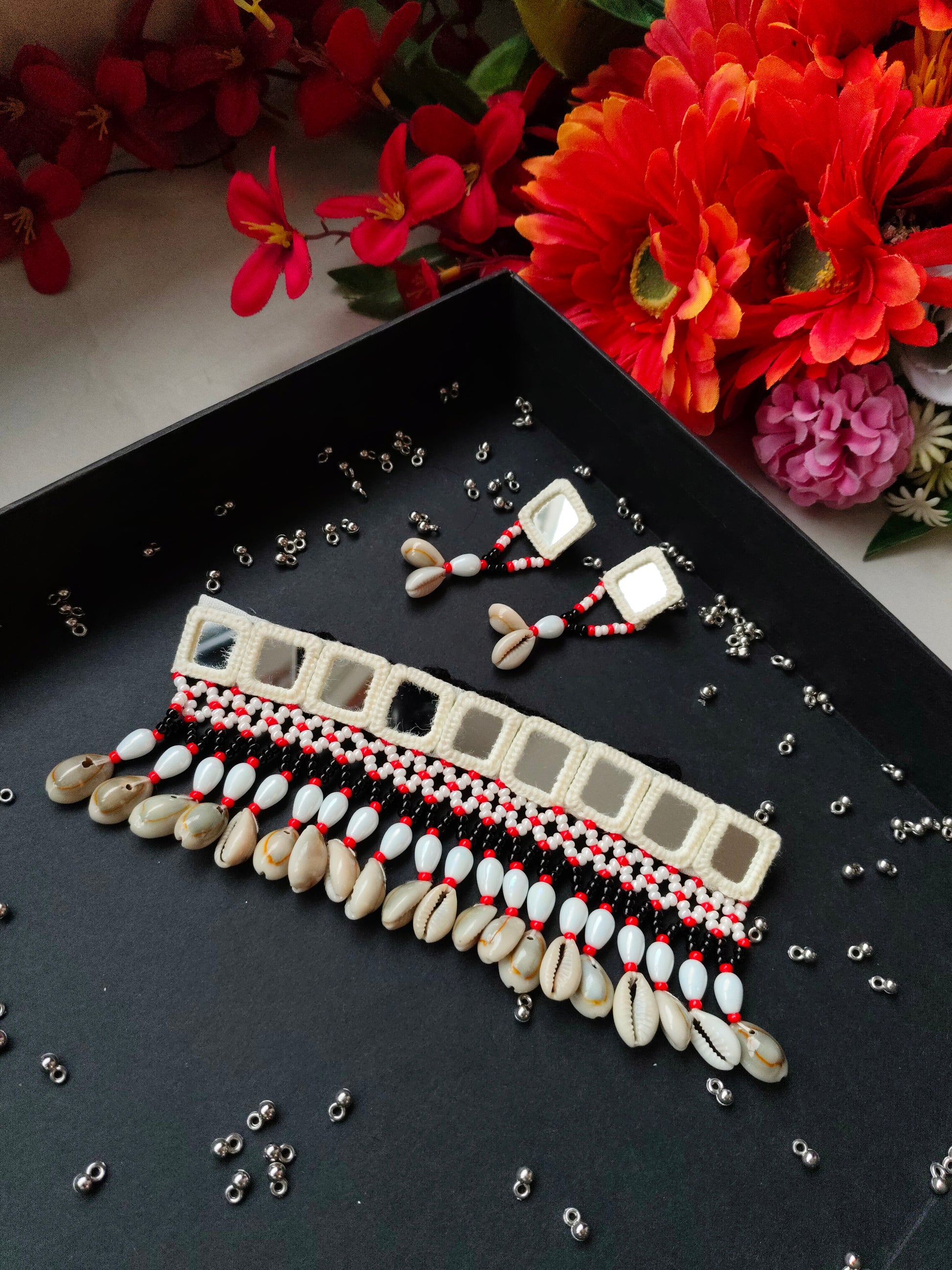 This choker necklace showcases vibrant multicolor mirror work, complemented by an adjustable dori and crafted with shells. It measures 7 inches in length and 1.3 inches in width, with matching lightweight earrings measuring 2.5 inches, offering both style and comfort.