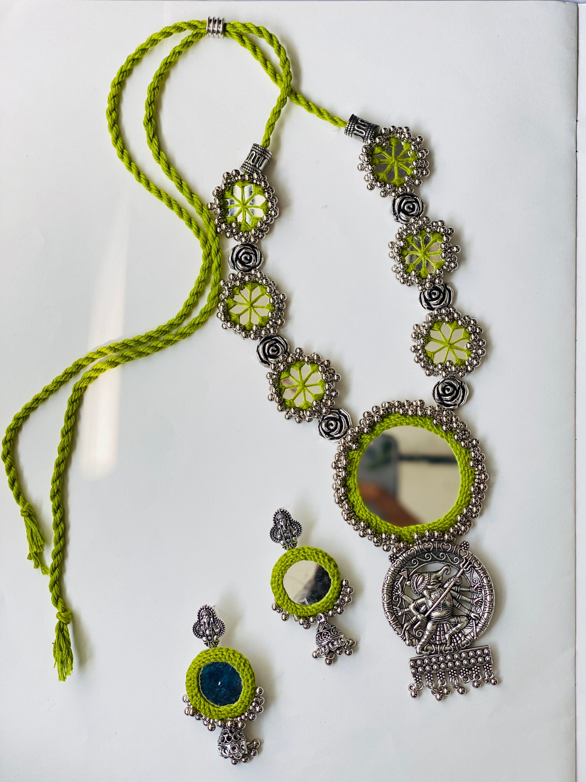 This Black Mirror Oxidized Necklace features detailed mirror embellishments paired with oxidized accents, resulting in a distinctive and fashionable piece. Its adjustable dori allows for a personalized and comfortable fit, perfect for diverse events. Skillfully designed, this necklace enhances your outfit with elegance while providing both versatility and sophistication.