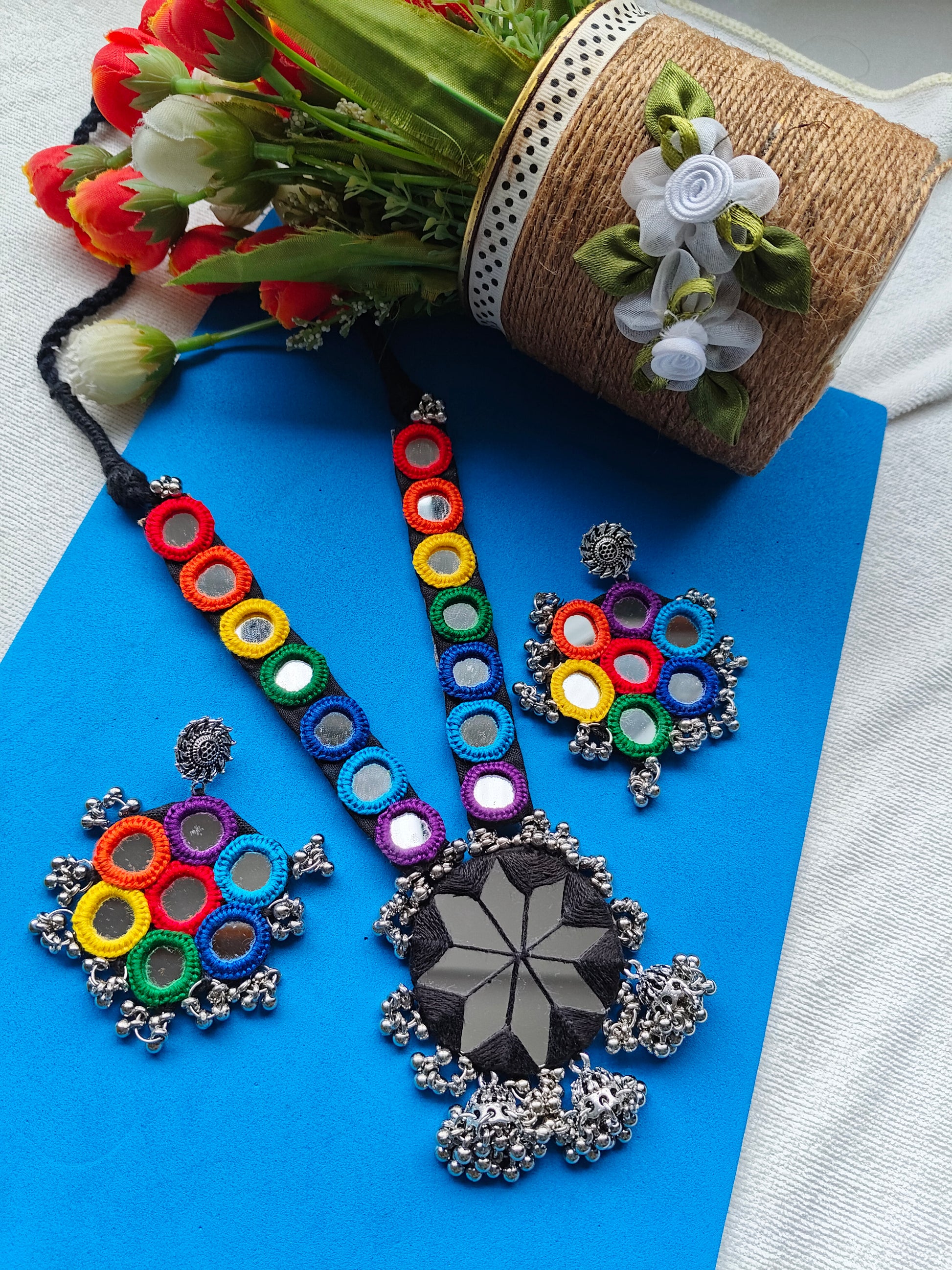 This multi-coloured choker necklace features an 8-inch length adorned with a striking black round pendant, complemented by matching 2.6-inch rainbow earrings. Crafted with oxidised detailing, the set offers a unique vintage appeal. The adjustable dori ensures a comfortable and customizable fit, making it a versatile accessory for various occasions.