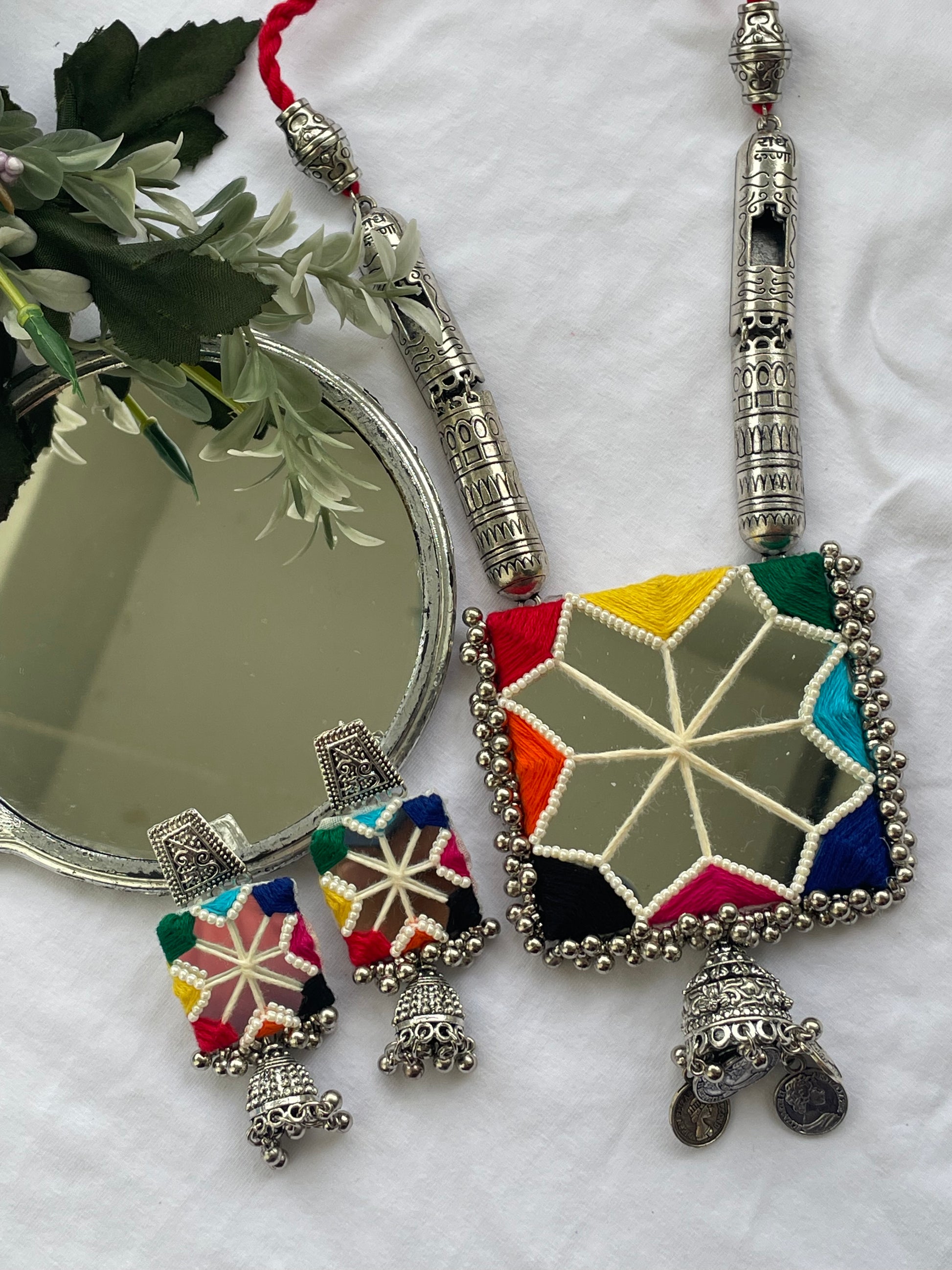 This multi thread Mirror Oxidized Necklace features detailed mirror embellishments paired with oxidized accents, resulting in a distinctive and fashionable piece. Its adjustable dori allows for a personalized and comfortable fit, perfect for diverse events. Skillfully designed, this necklace enhances your outfit with elegance while providing both versatility and sophistication.
