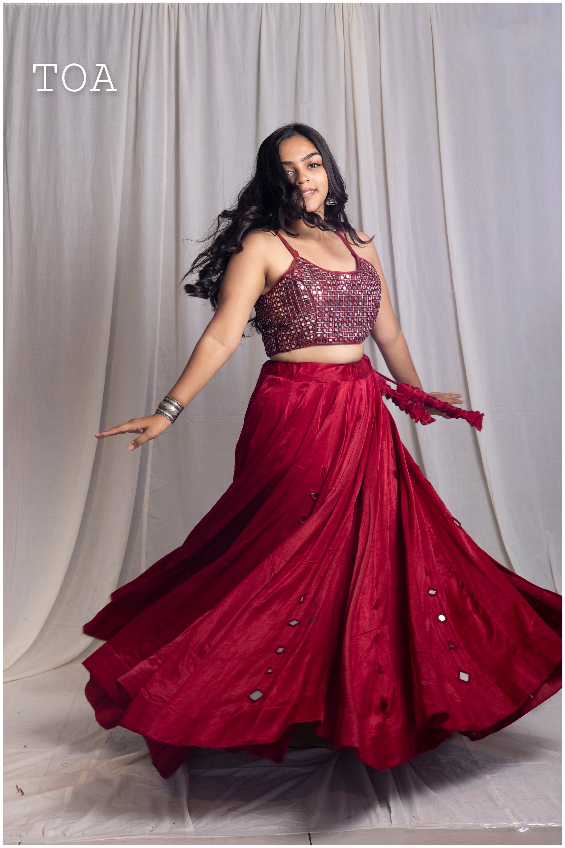 Crafted from luxurious gaji silk fabric, this skirt features 24 panels (kallis) and boasts an impressive 9+ meters of flare. Adorned with exquisite hand mirror work in a designer up-and-down pattern on each kalli, it also includes a convenient zip pocket. Perfect for any occasion, this skirt lets you flaunt your style like a diva.