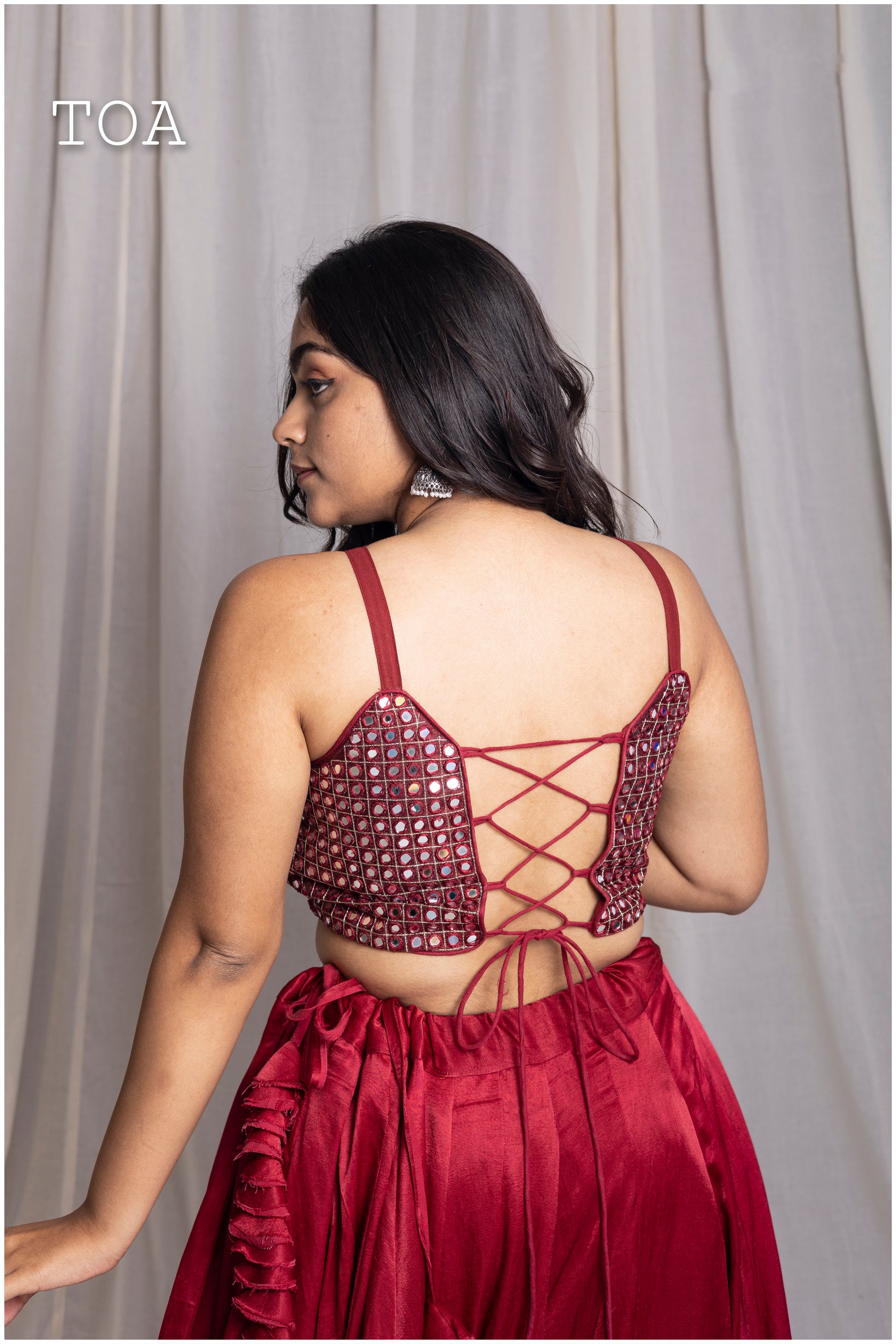 Also made from gaji silk fabric, the blouse is embellished with delicate hand mirror work and intricate aari work. The checks pattern adds a rich and elegant touch. Versatile and stylish, this blouse pairs beautifully with other sarees or lehengas.