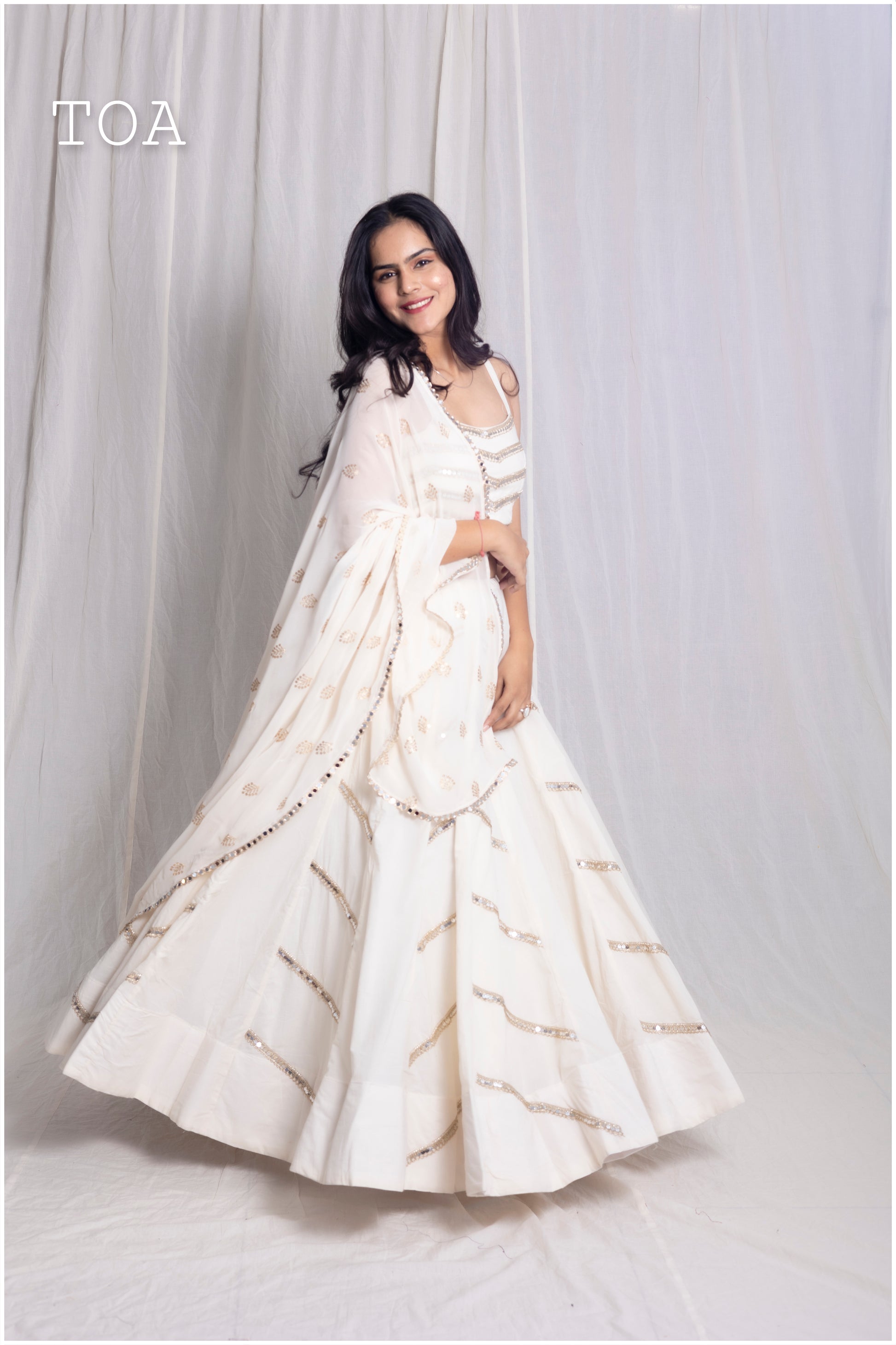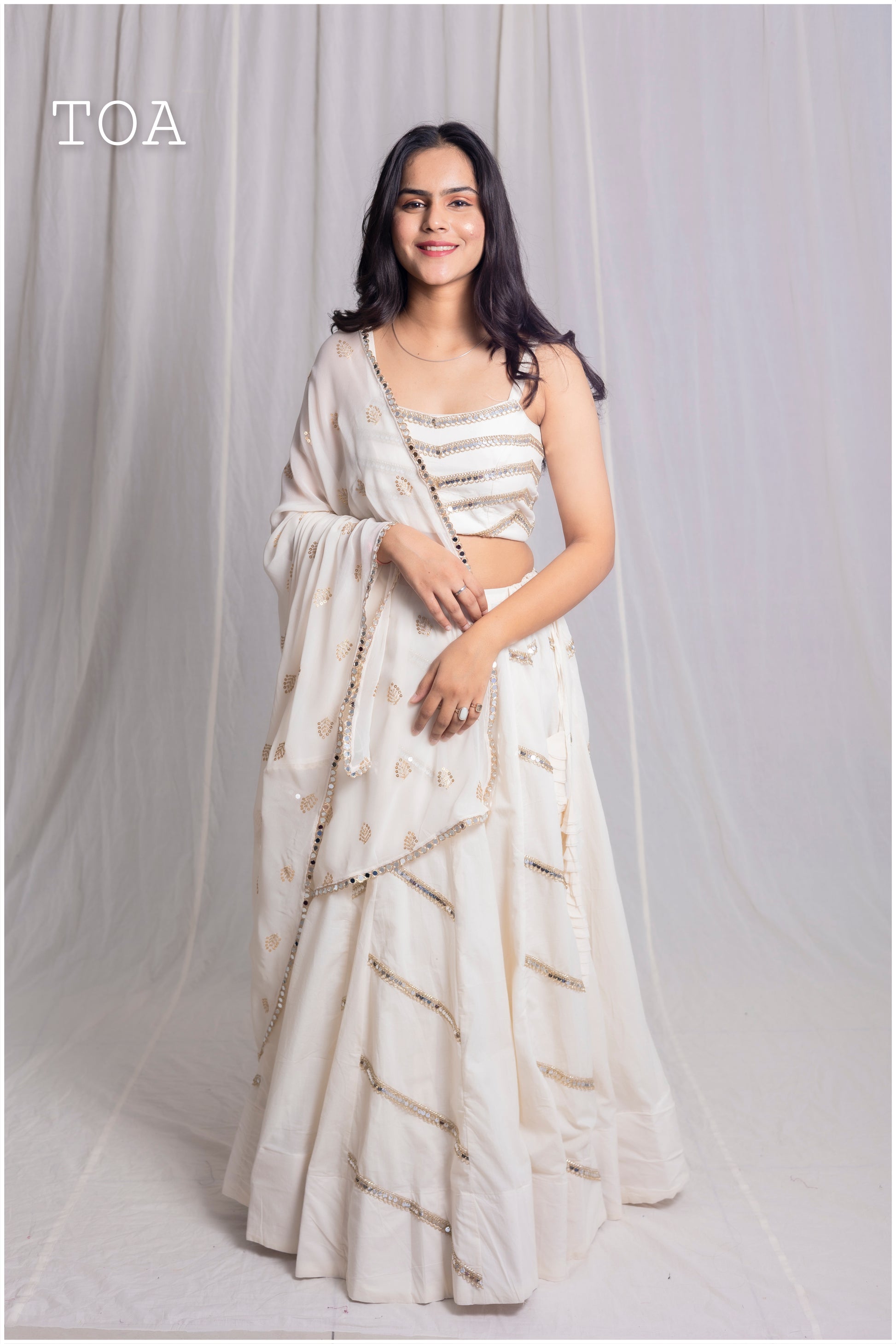 • Dupatta: Available in georgette with all-over sequin buttis and a real mirror border. Choose from a monotone self-color or a contrasting color to suit your style. This versatile dupatta adds a touch of elegance to the set.