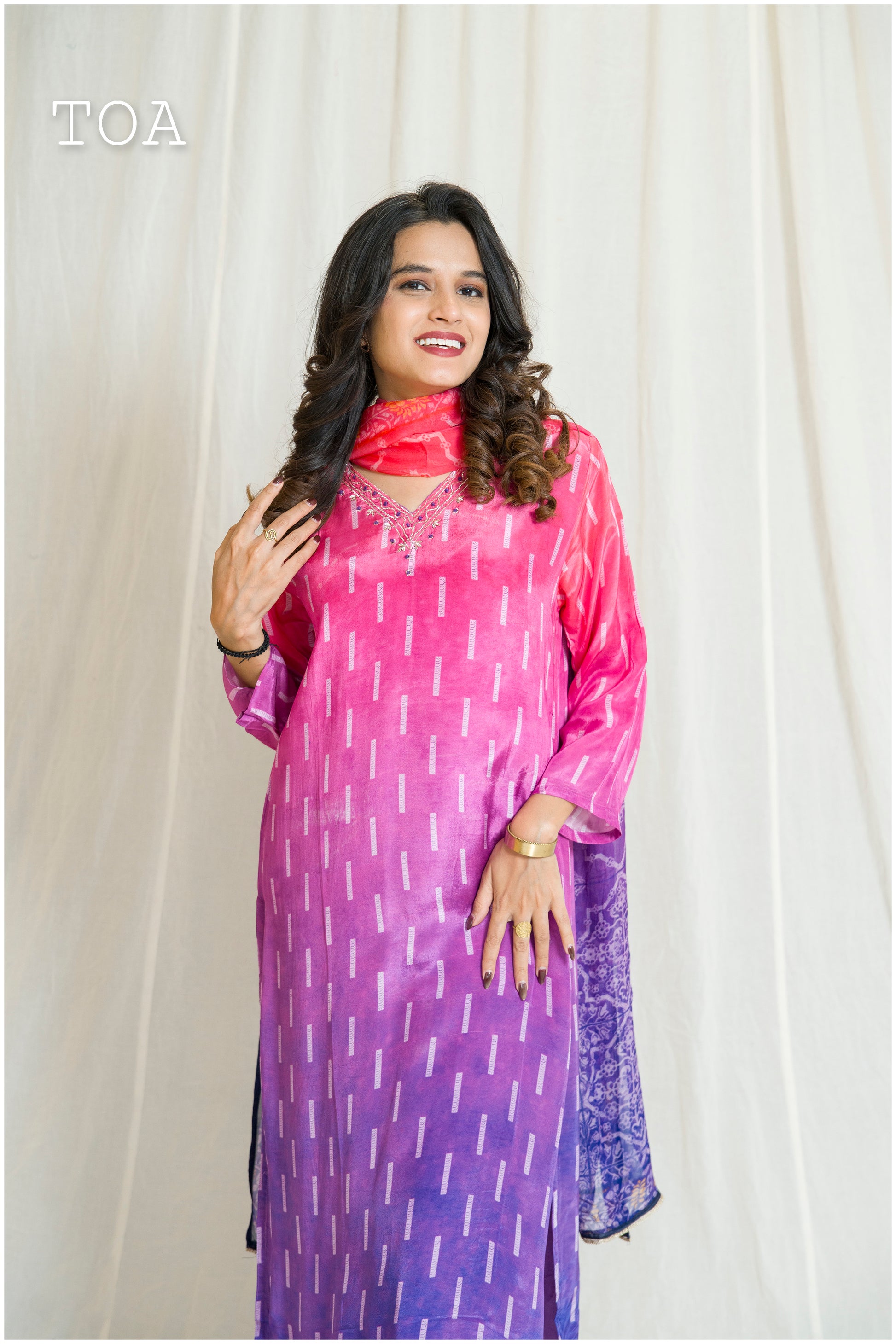 Exquisitely handcrafted, this 3-piece suit set includes a top, bottom, and dupatta. Made from premium natural crepe fabric, the top features delicate handwork on the neckline, adding an elegant touch. Perfect for any festive or special occasion.