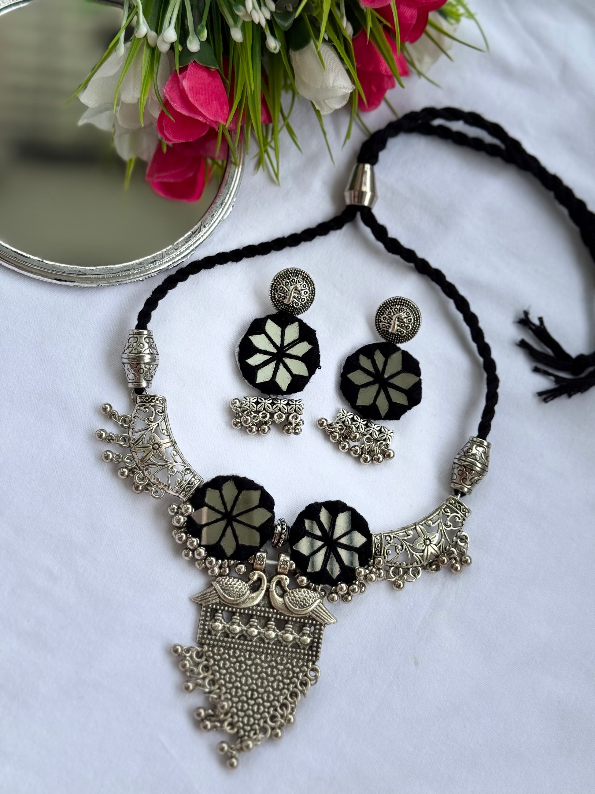 This multi thread Mirror Oxidized Necklace features detailed mirror embellishments paired with oxidized accents, resulting in a distinctive and fashionable piece. Its adjustable dori allows for a personalized and comfortable fit, perfect for diverse events. Skillfully designed, this necklace enhances your outfit with elegance while providing both versatility and sophistication.