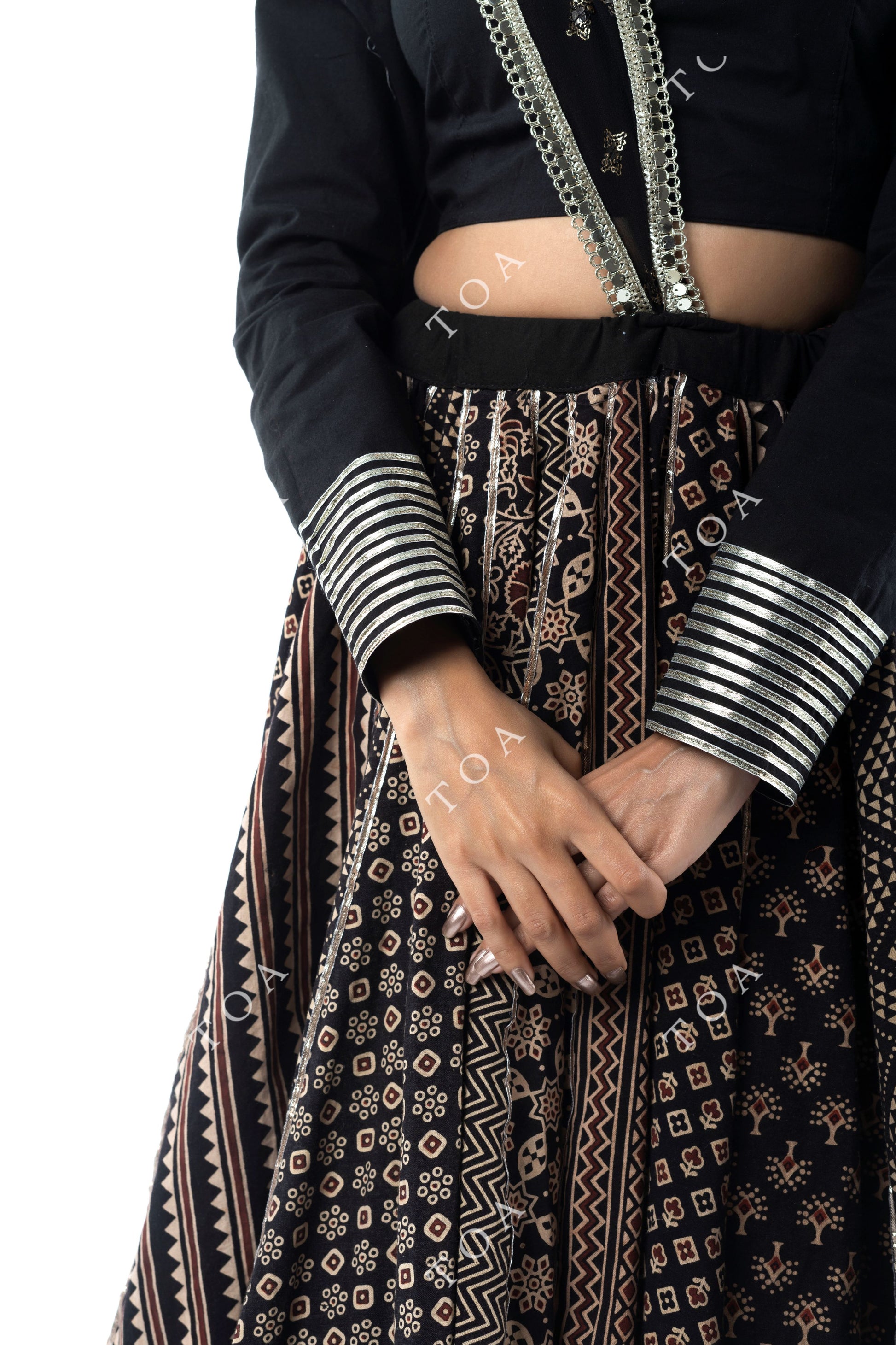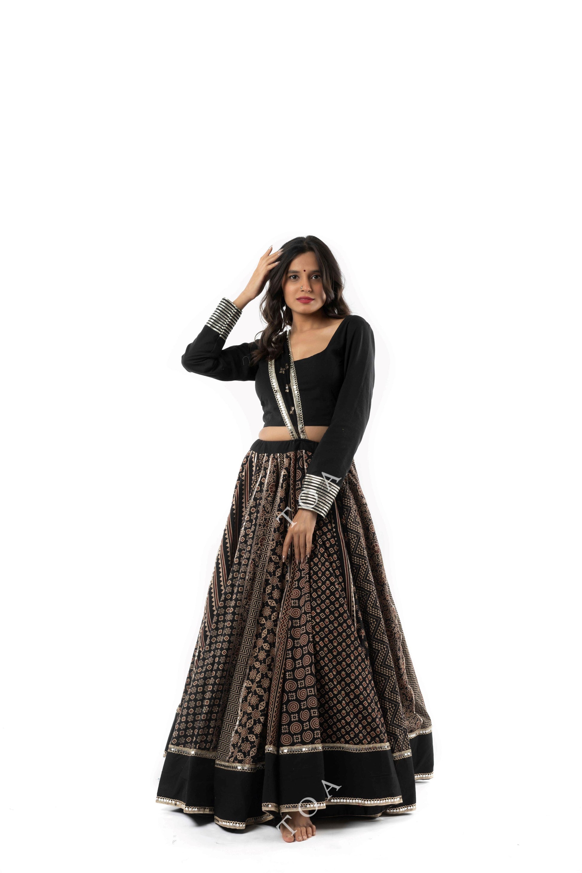 Made from cambric fabric, the blouse is embellished with delicate gota tui work. Versatile and stylish, this blouse pairs beautifully with other sarees or lehengas.