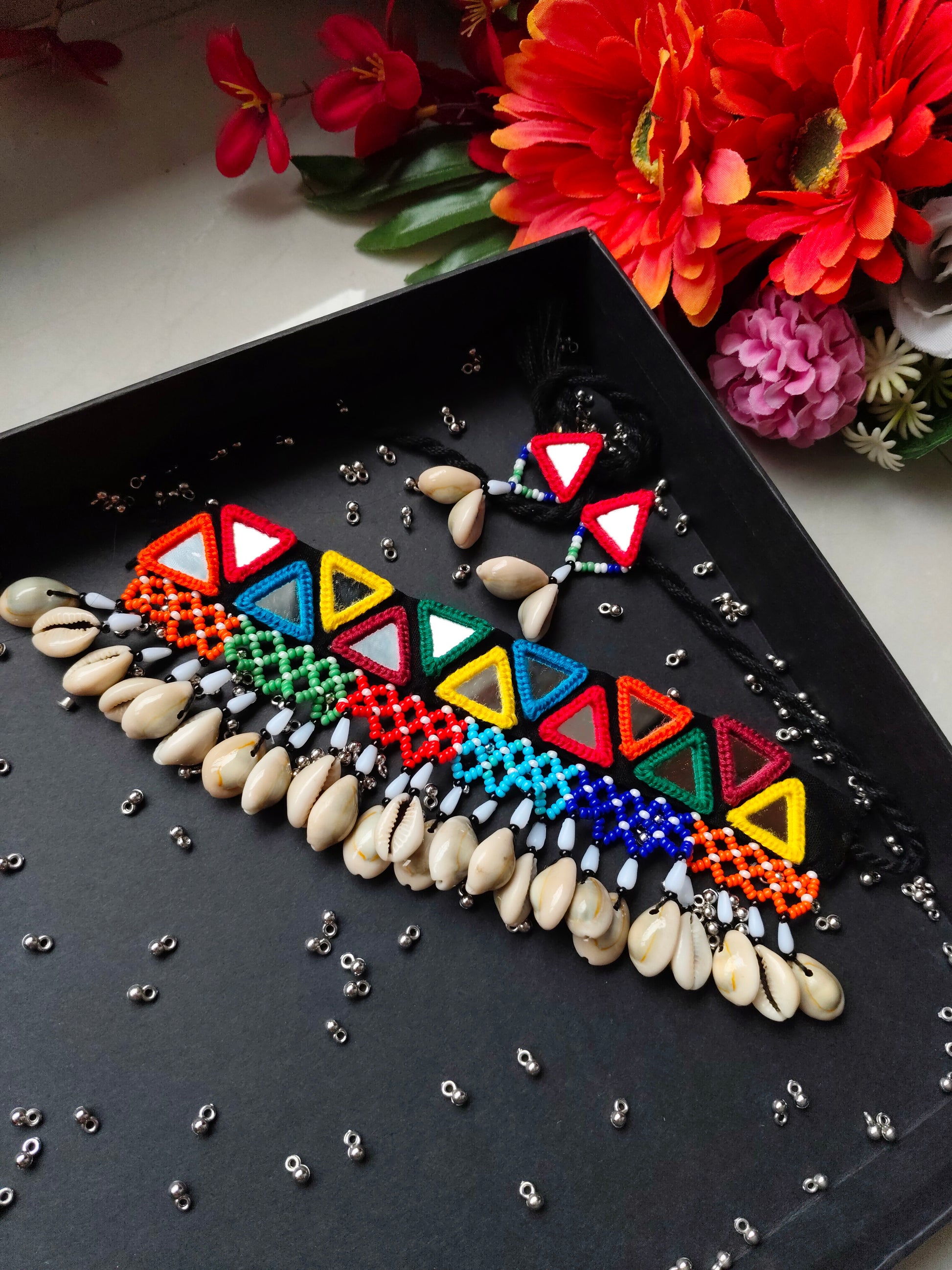 This choker necklace showcases vibrant multicolor mirror work, complemented by an adjustable dori and crafted with shells. It measures 7 inches in length and 1.3 inches in width, with matching lightweight earrings measuring 2.5 inches, offering both style and comfort.