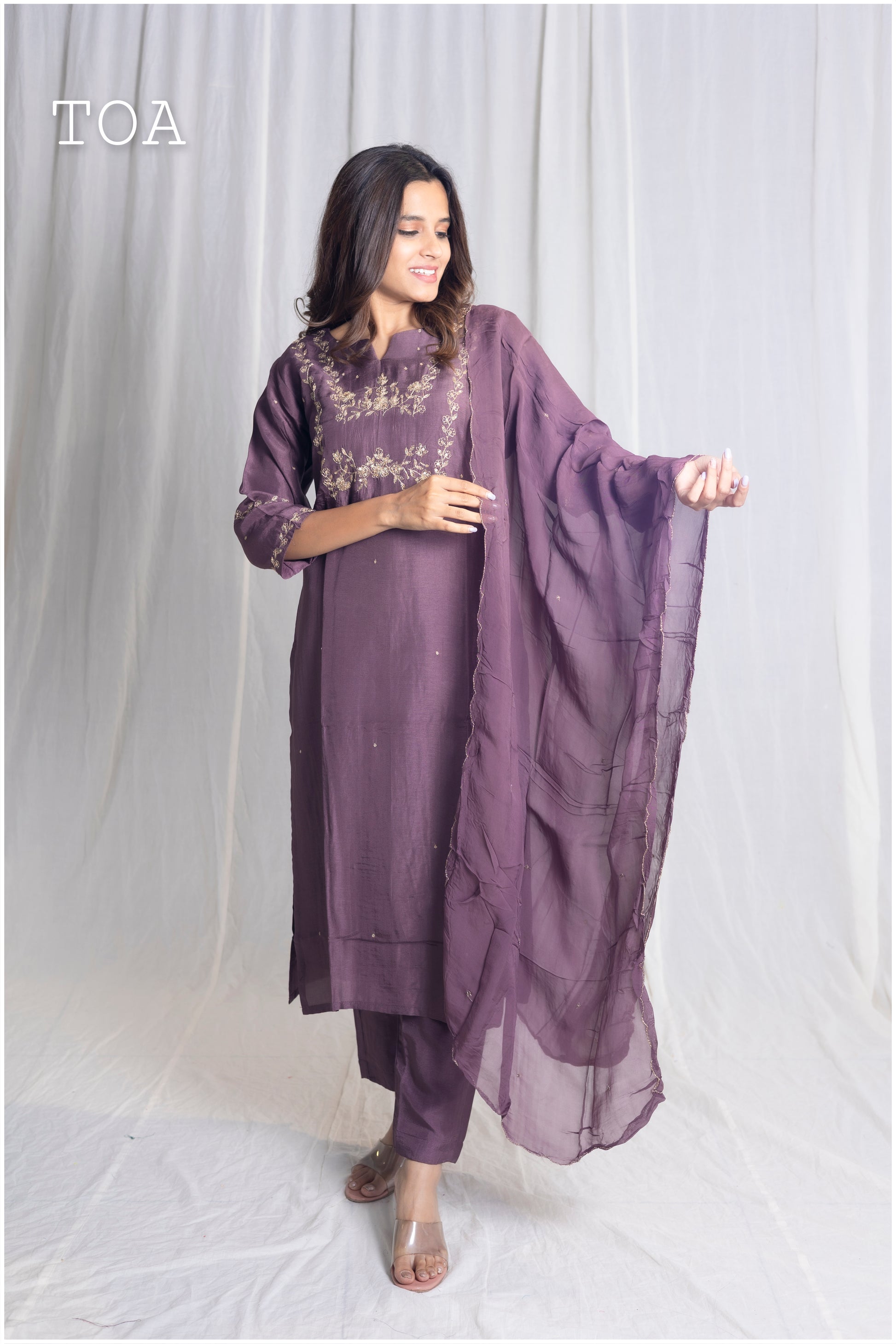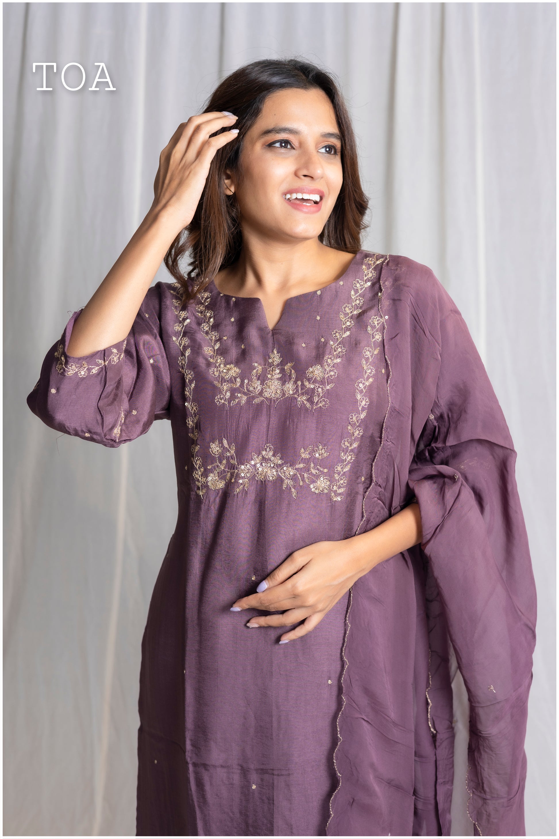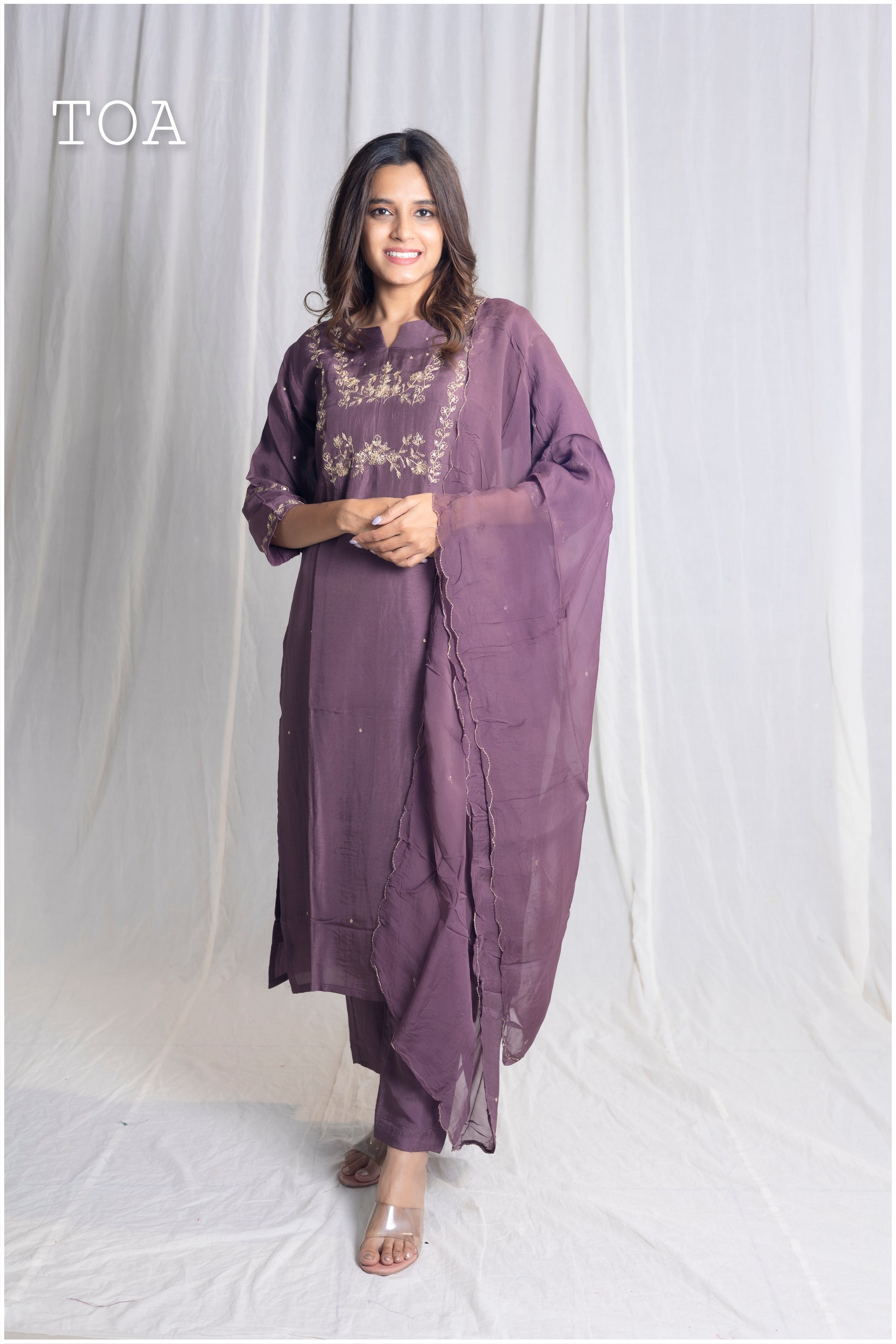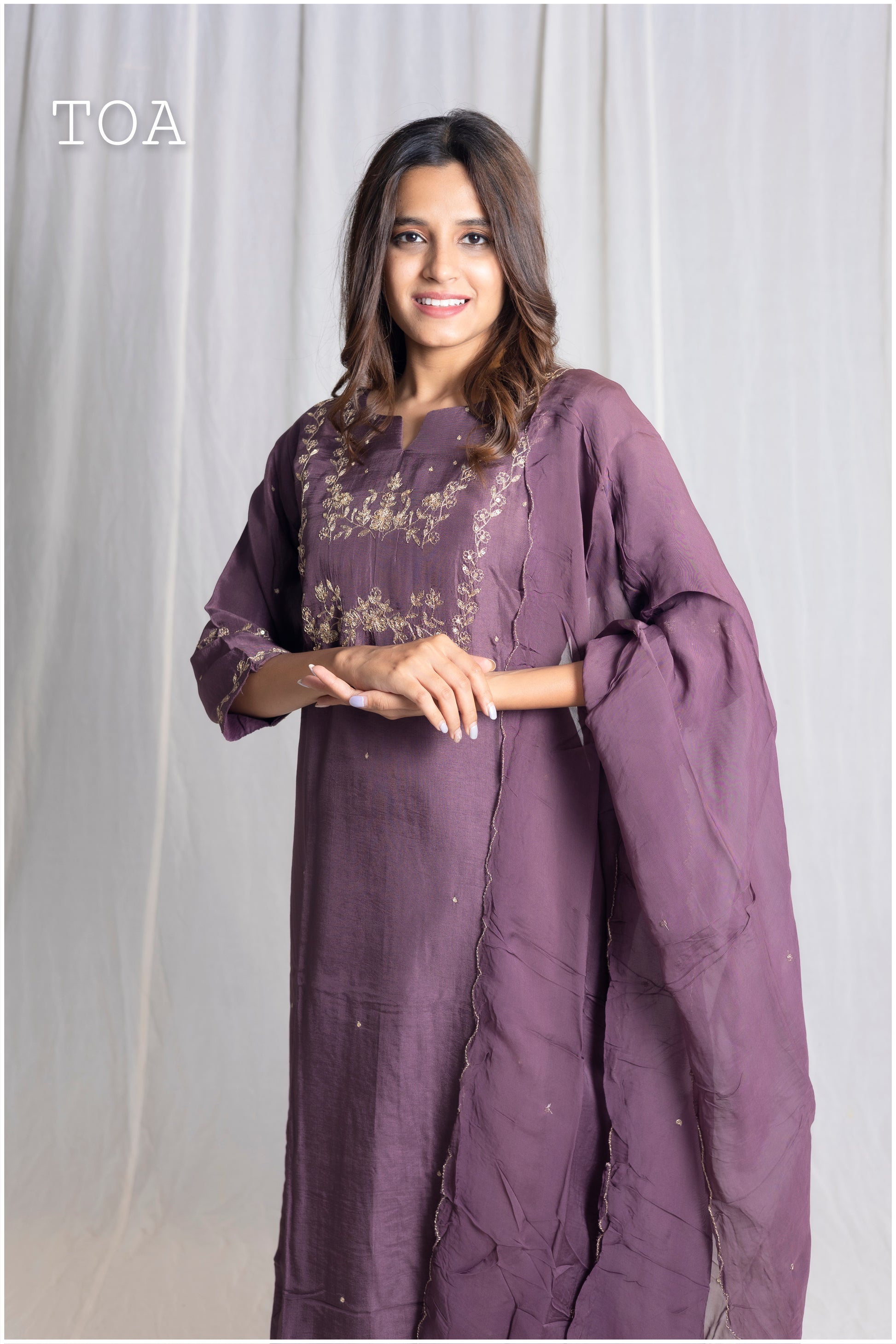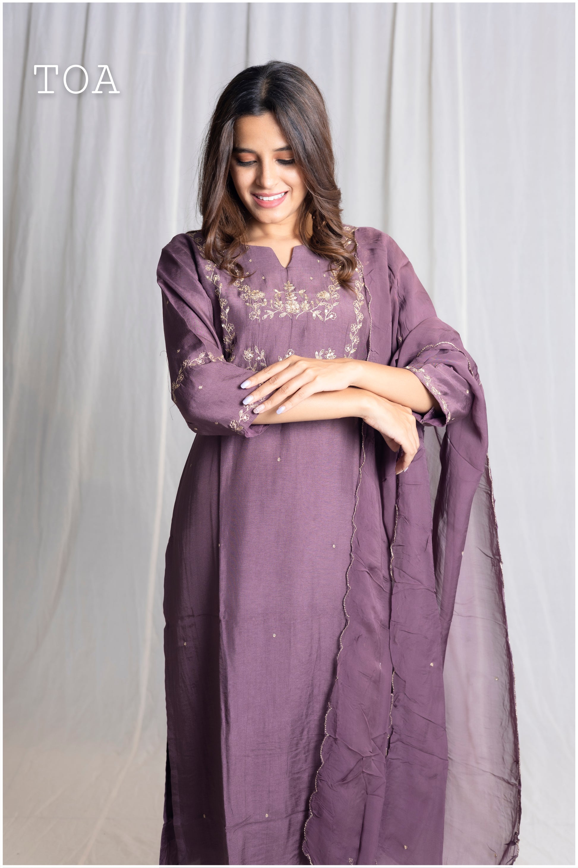 “Embrace elegance with this all-time favorite dark Mauve suit, crafted from luxurious Russian silk and adorned with intricate handwork in  sequins, resham, and aari.