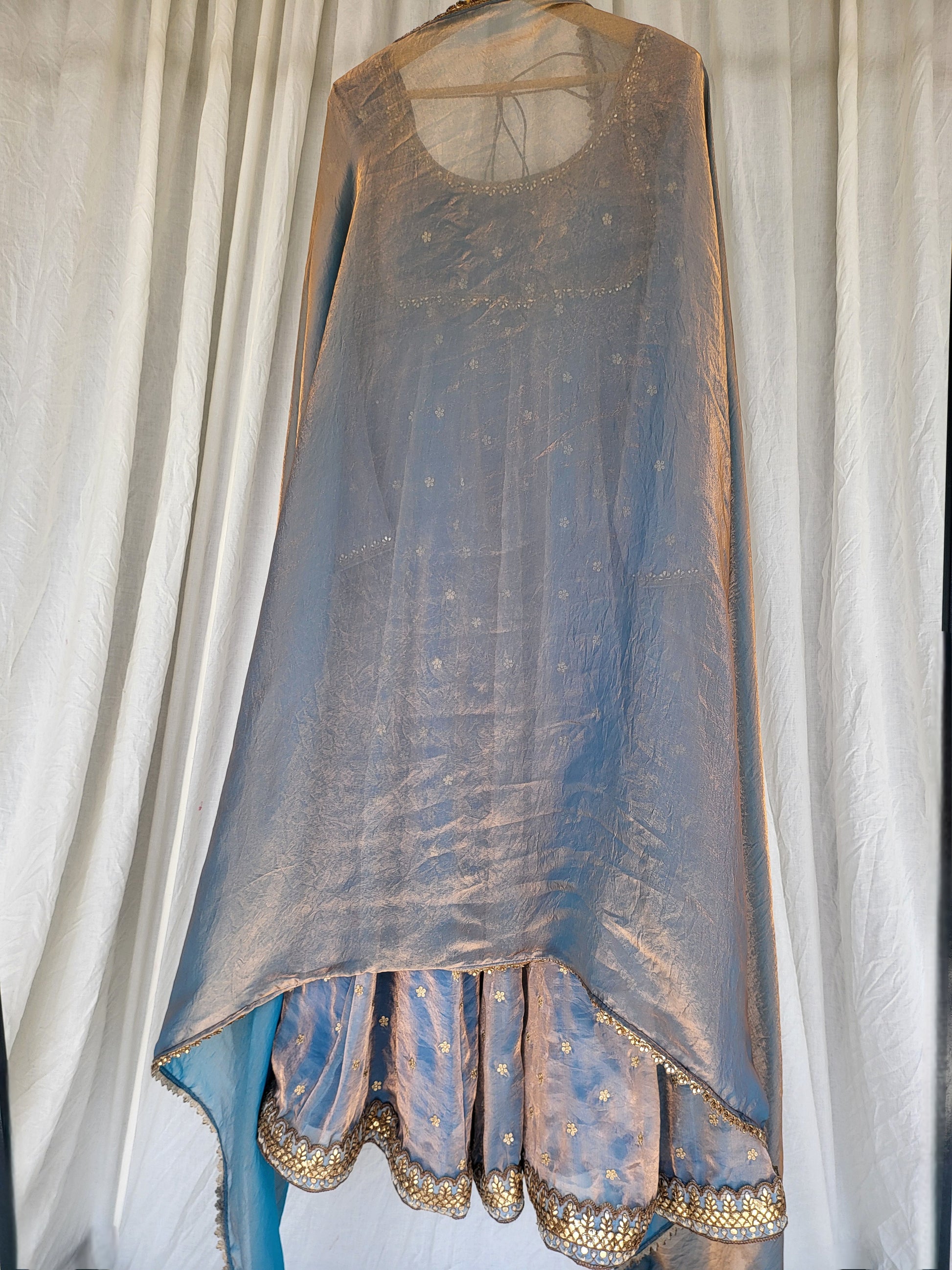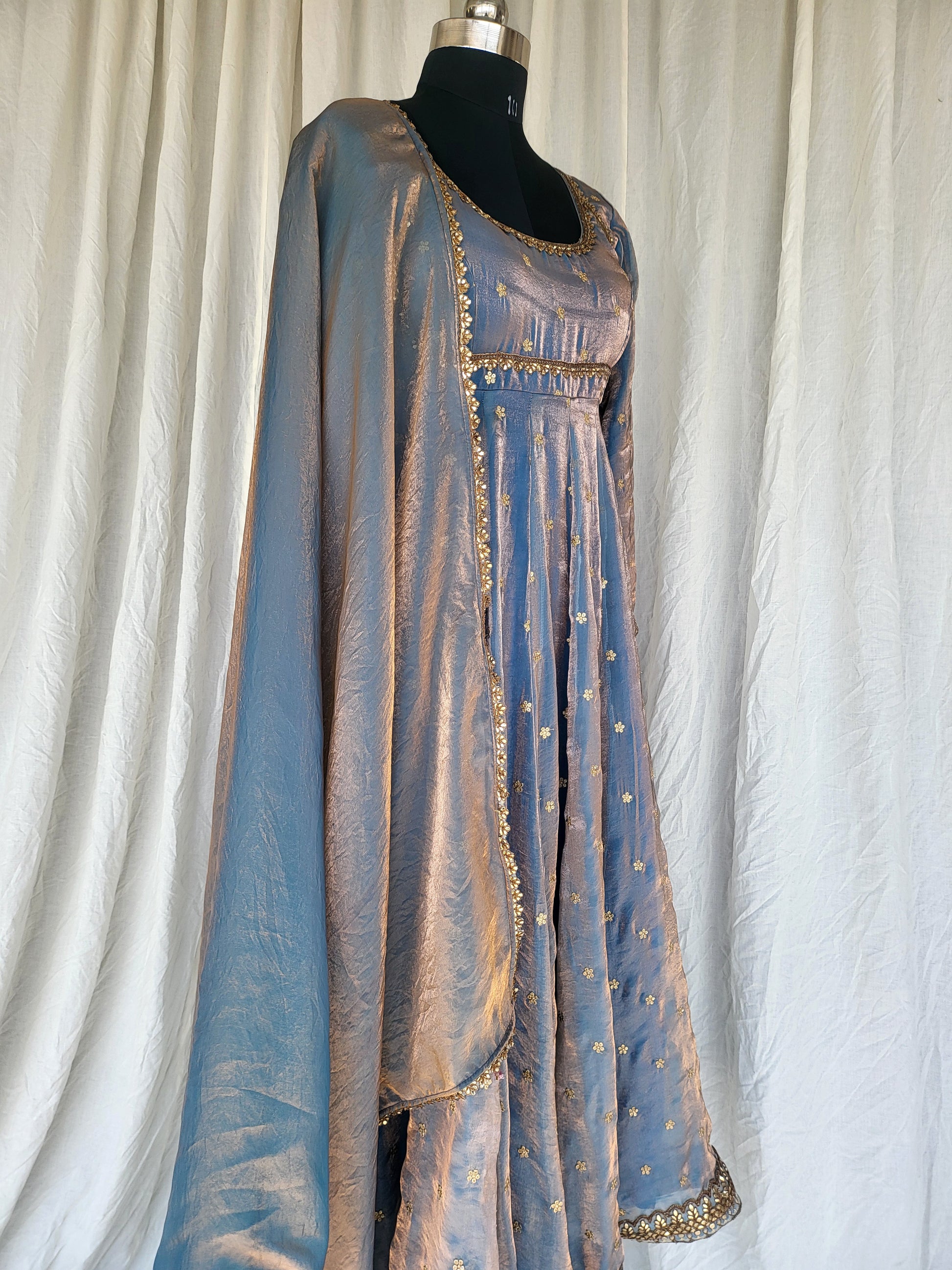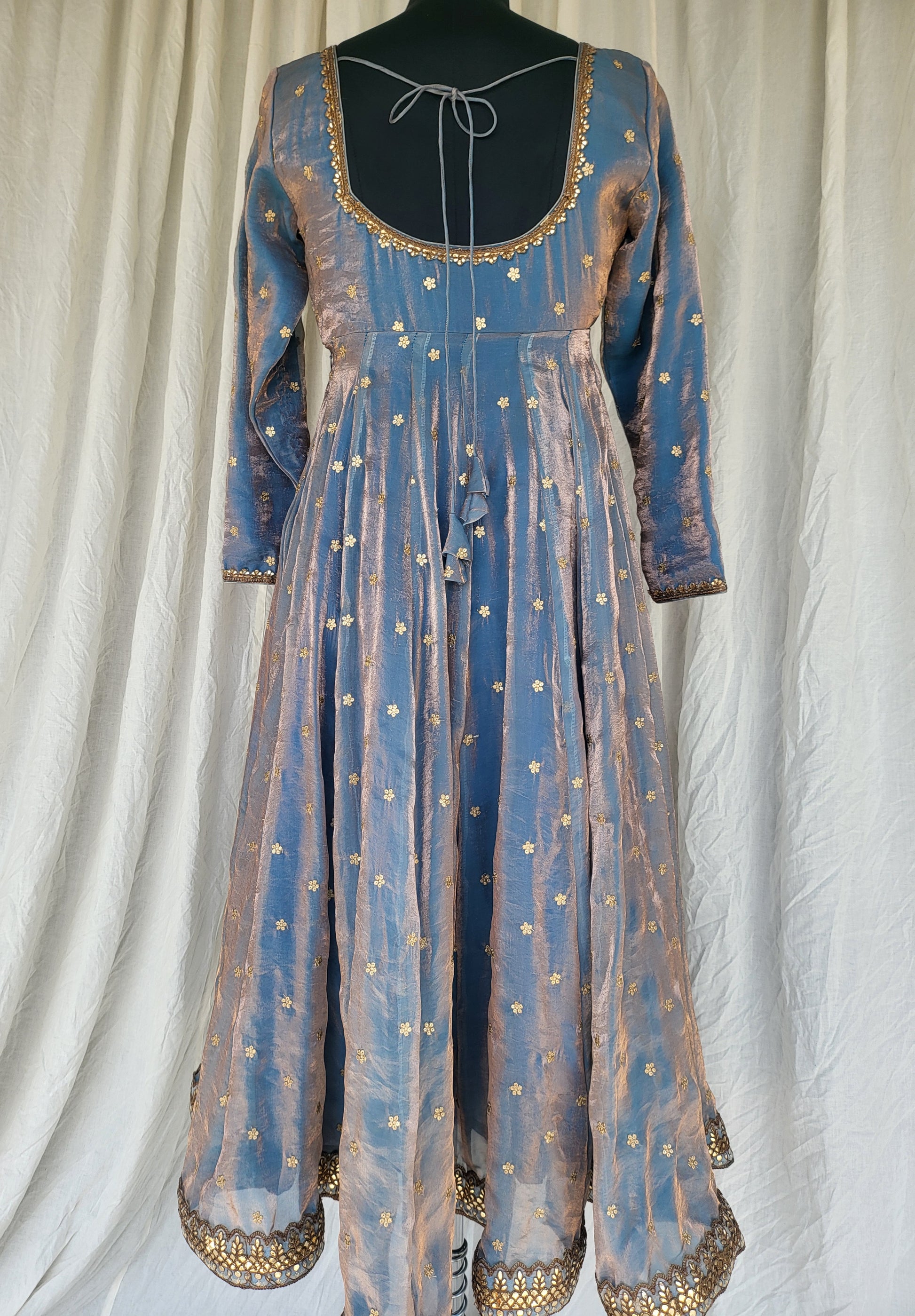 Elevate your style with our Kanjivaram Tissue Silk Anarkali, featuring all-over sequins, aari buttis, and Gotta Patti borders on the yoke, neckline, sleeves, and deep back with tassels. Paired with a soft Kanjivaram dupatta with bordered edges, this classy yet ethnic outfit is perfect for any occasion. it’s your ultimate go-to choice.
