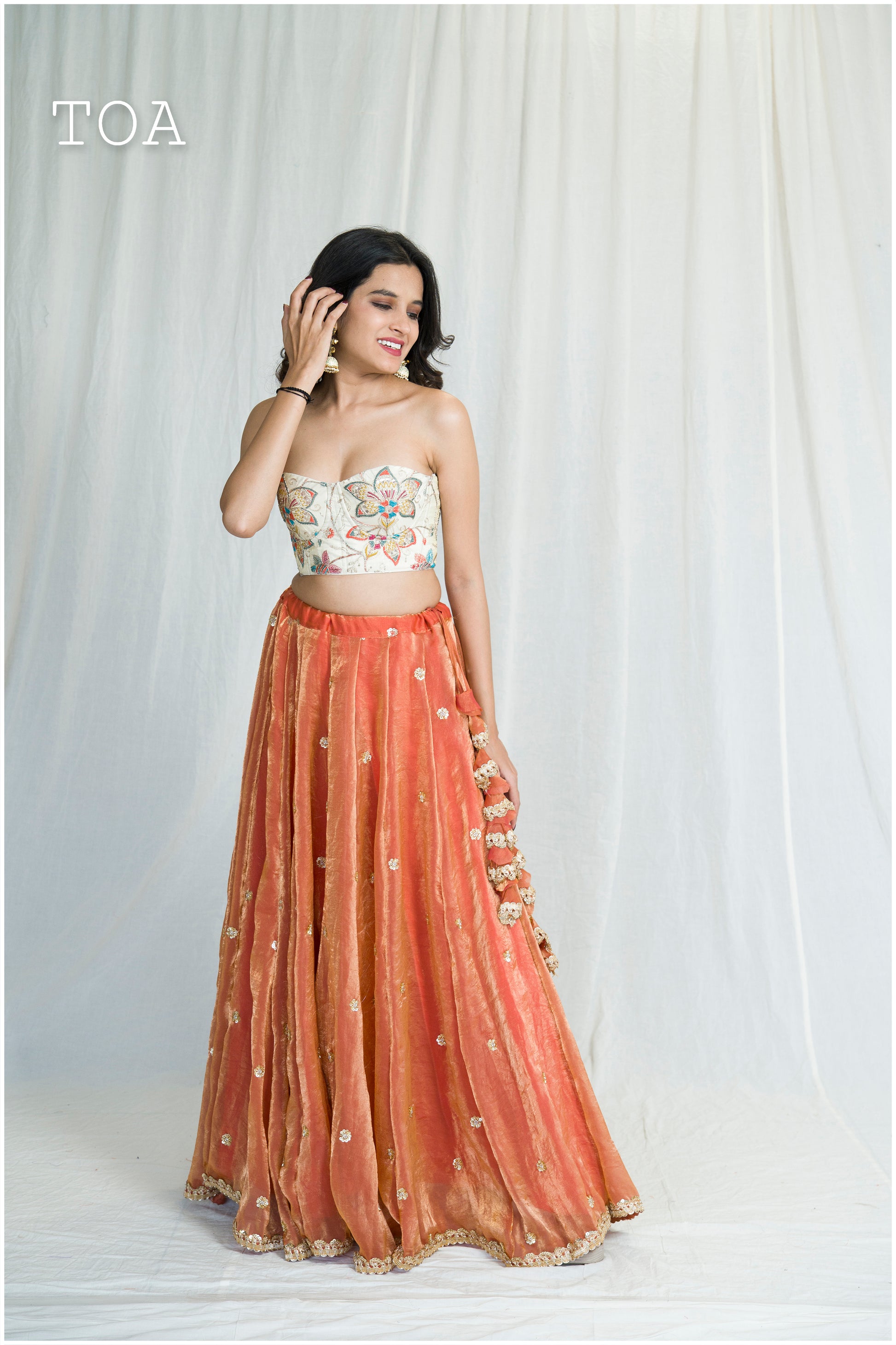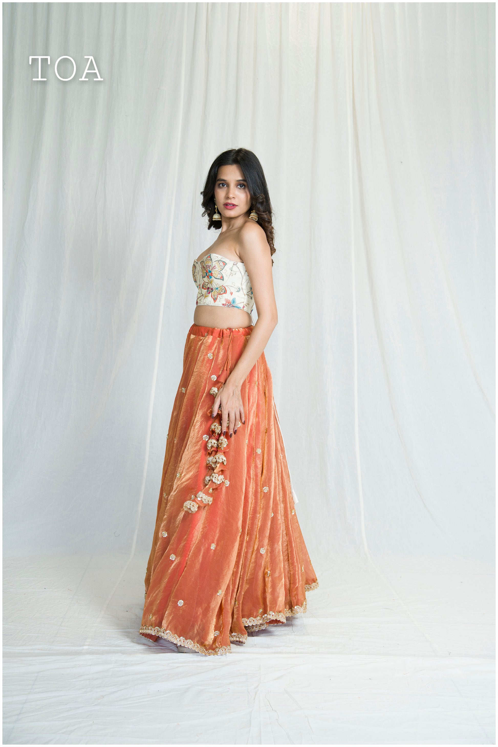 Rust Color Skirt: - Beautifully stitched into 24 panels (kallis) for a striking flare of over 9+ meters. - The skirt twirls beautifully, adding a touch of whimsy to your movements. - Features convenient pockets for added functionality.