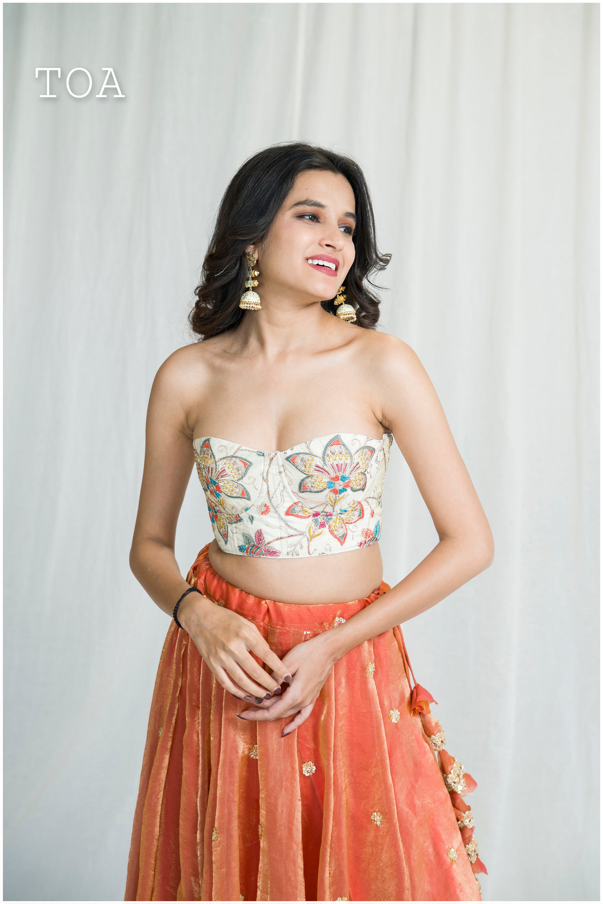 The Kanjivaram silk corset top boasts aari, pipe, resham and sequins work with stylish back strings.