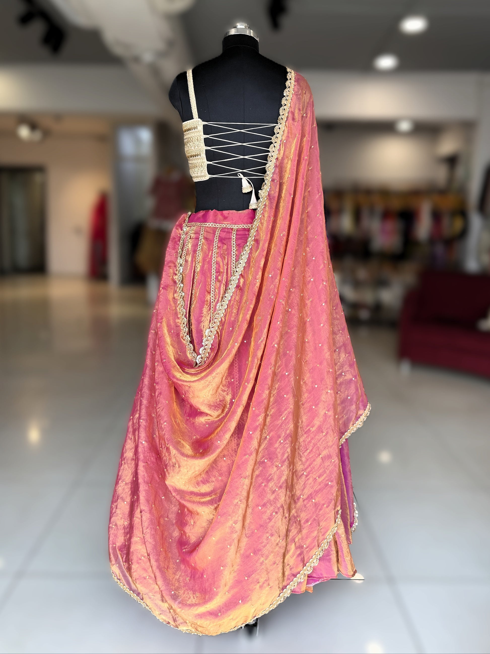 The dupatta completes the look with its pink kanjivaram tissue fabric, adorned with a beautiful scallpos and elegant outfit together with grace.