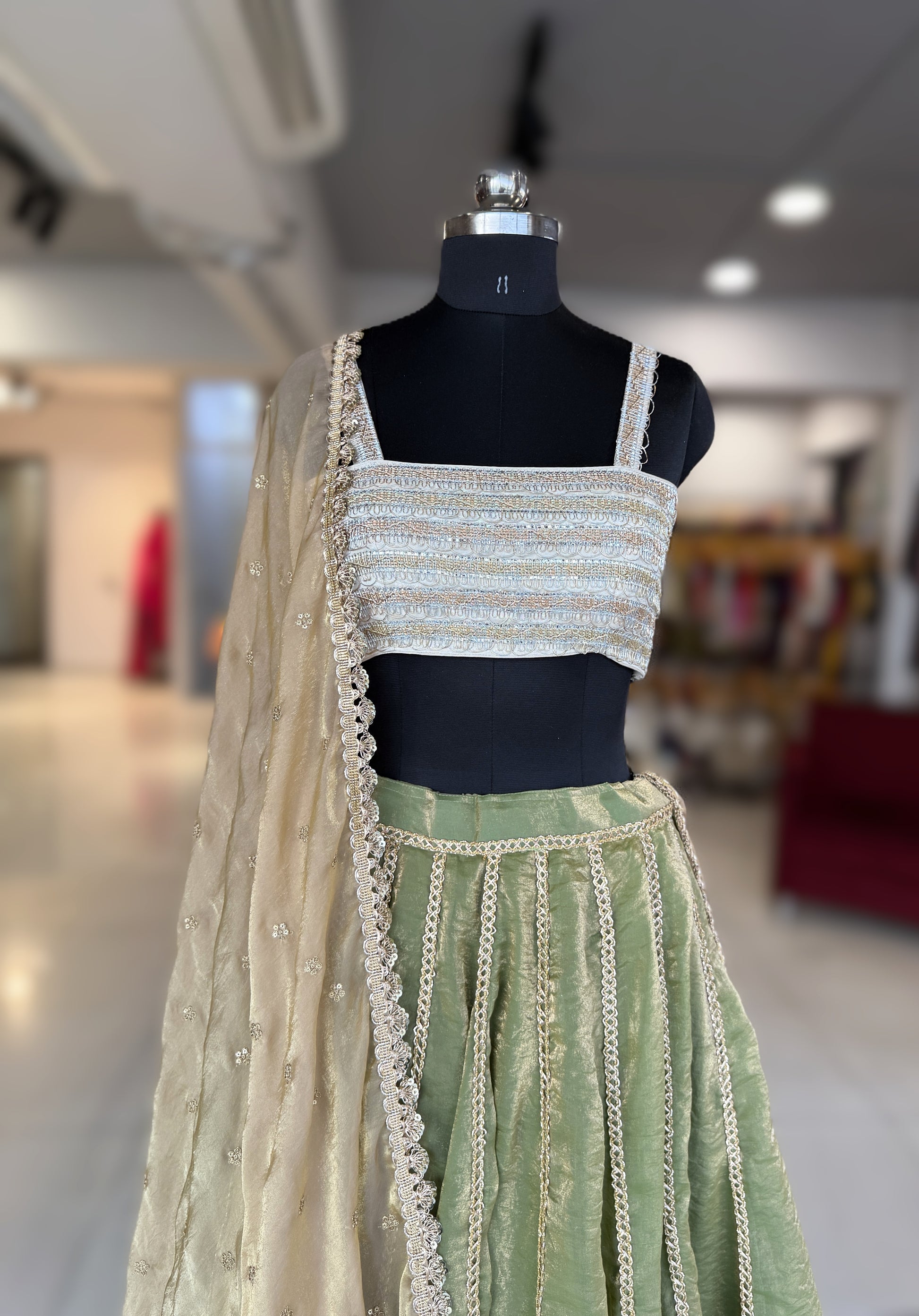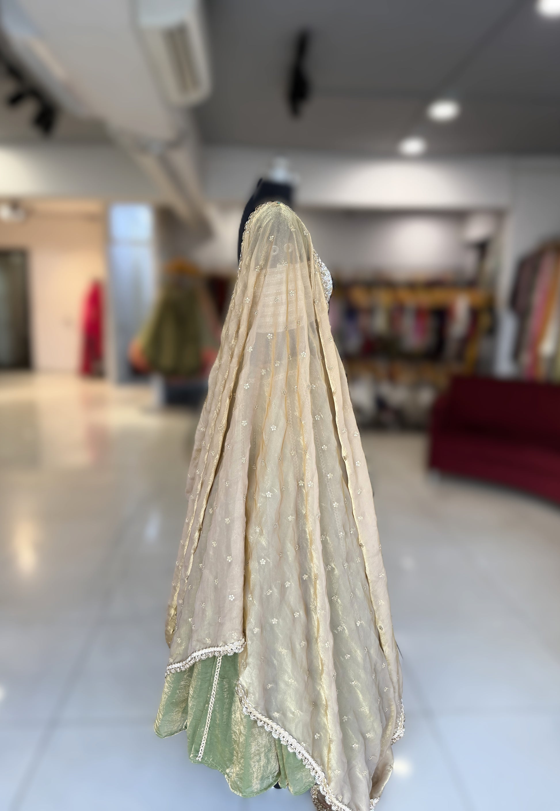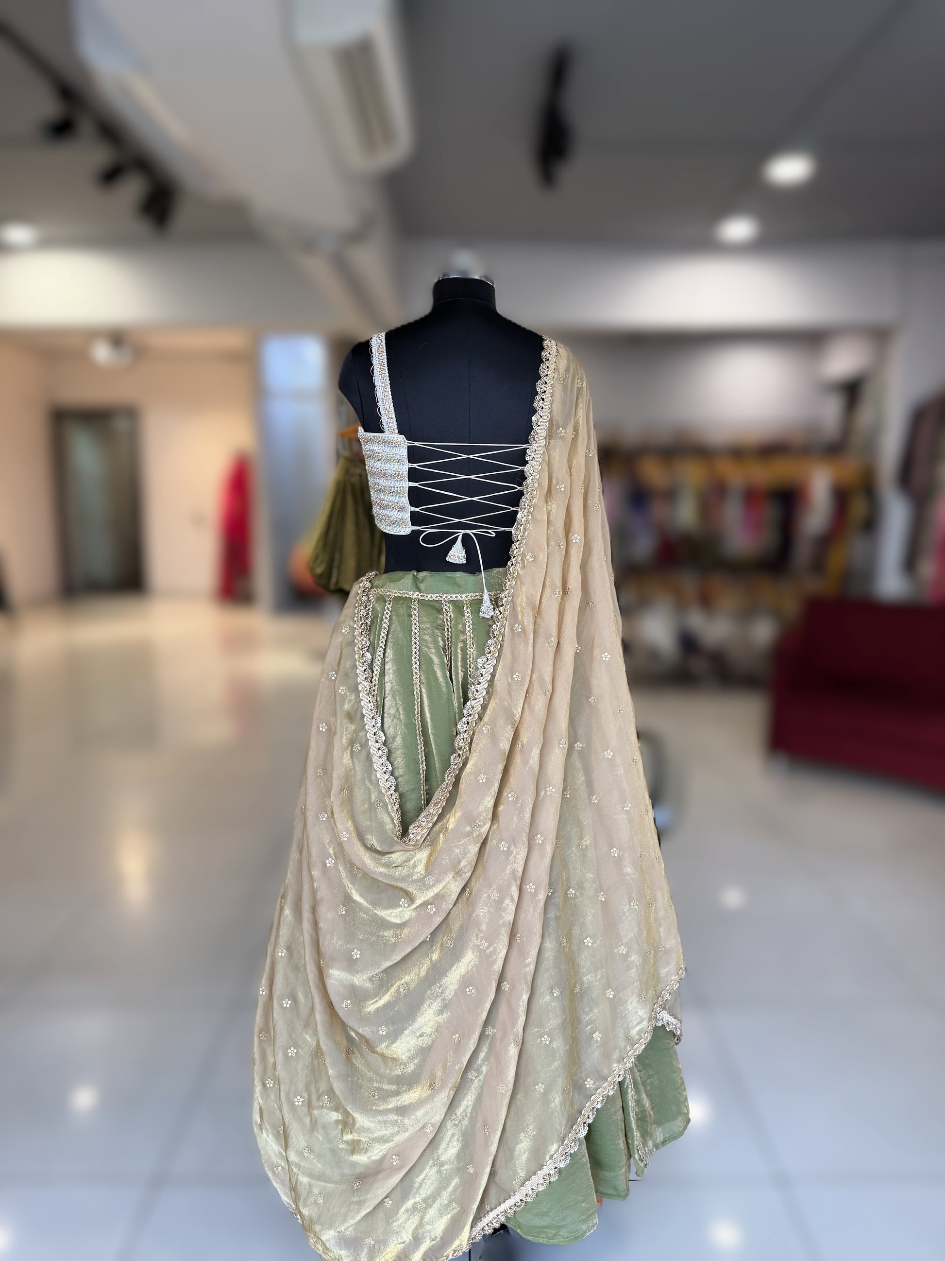 Expertly crafted from opulent Metallic Dual Tone Kanjivaram tissue silk, this stunning skirt boasts 24 skillfully tailored flares, creating a magnificent 9+ meter flare. The focal point of this masterpiece is its refined single-line zaridosi border, providing a sophisticated touch. With its blend of traditional appeal and timeless elegance, this skirt is a must-have for any celebratory or nuptial event.