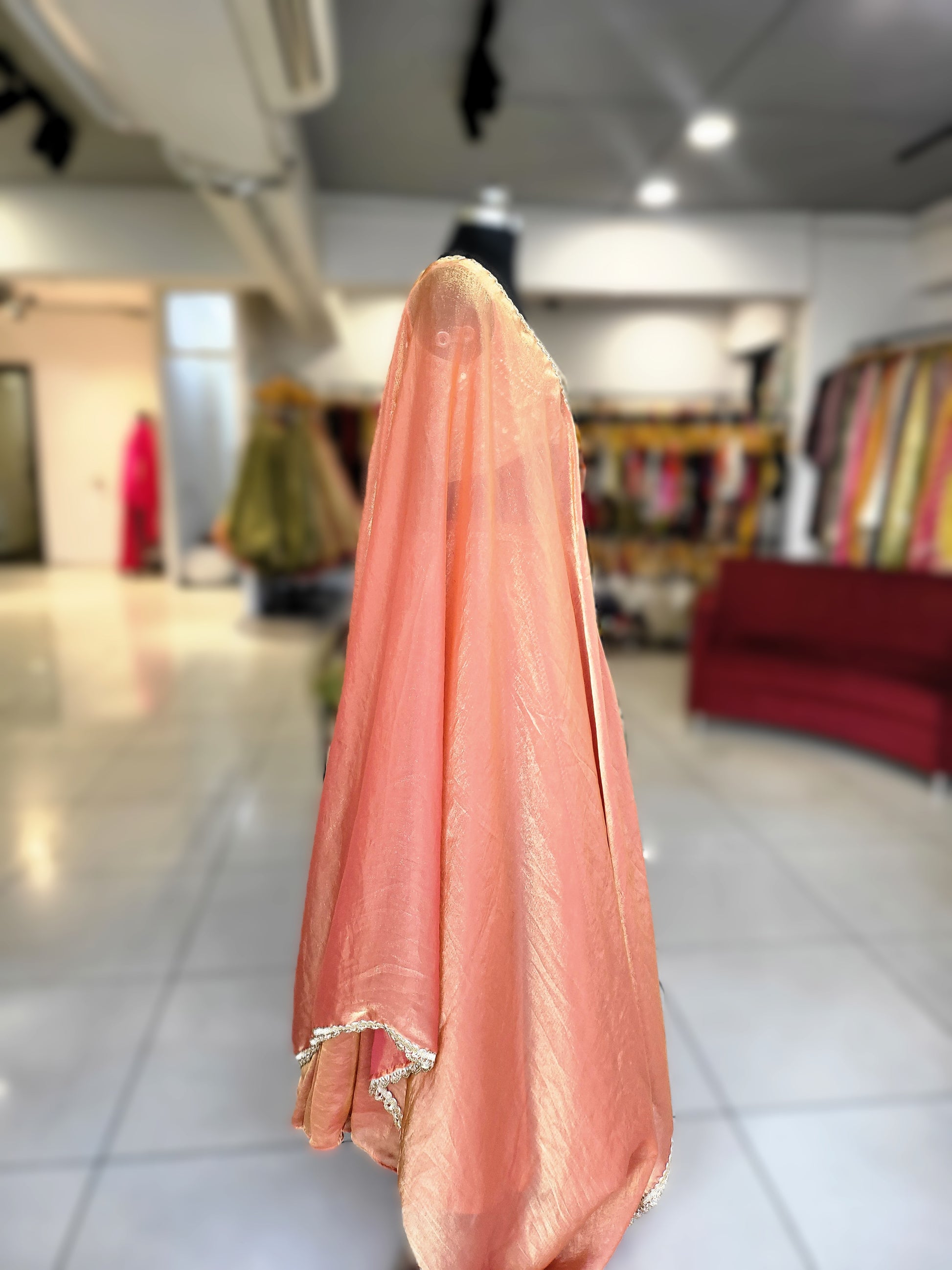 The dupatta completes the look with its rust kanjivaram tissue  fabric, adorned with a beautiful scallpos and elegant outfit together with grace.