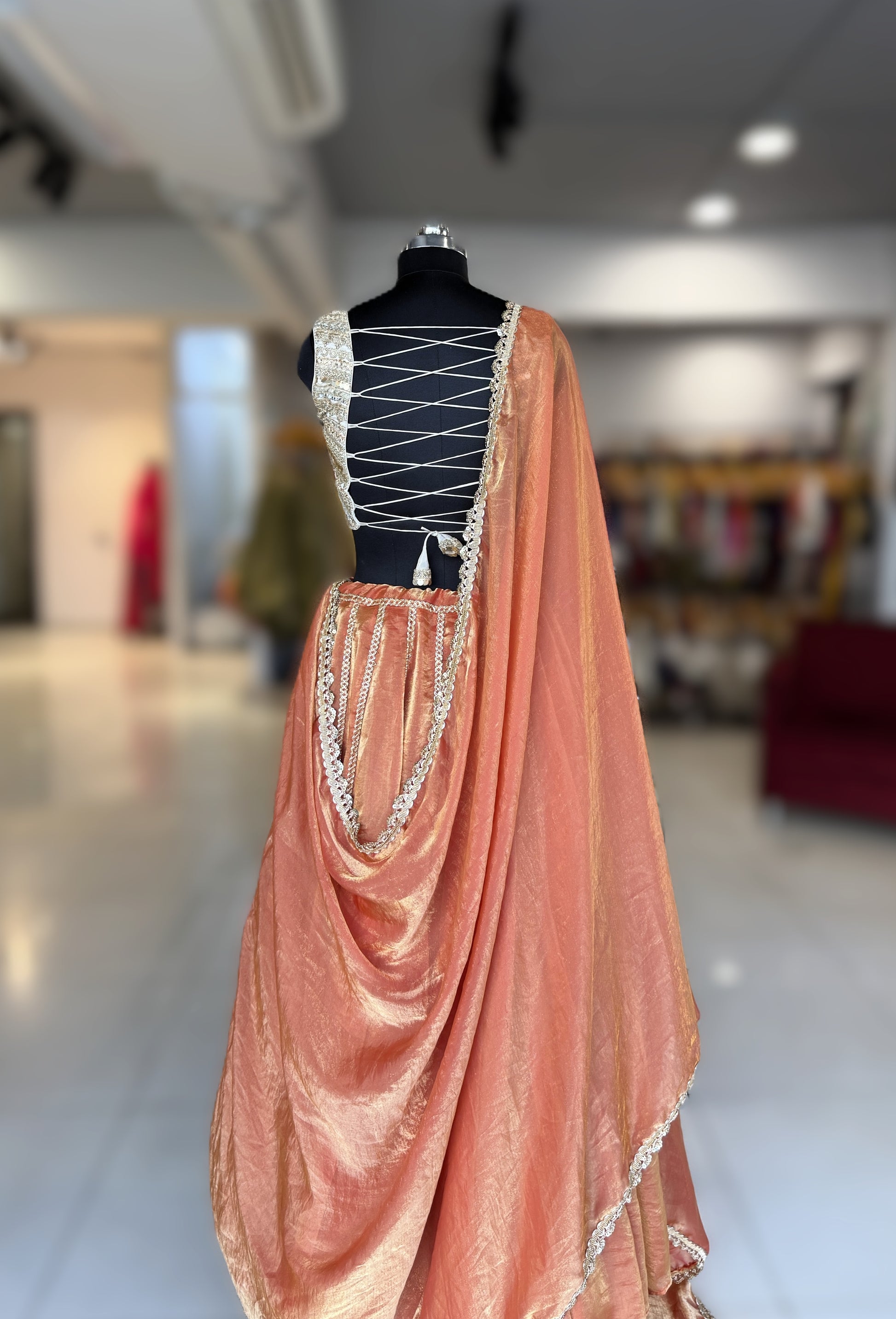 Expertly crafted from opulent Metallic Dual Tone Kanjivaram tissue silk, this stunning skirt boasts 24 skillfully tailored flares, creating a magnificent 9+ meter flare. The focal point of this masterpiece is its refined single-line zaridosi border, providing a sophisticated touch. With its blend of traditional appeal and timeless elegance, this skirt is a must-have for any celebratory or nuptial event.