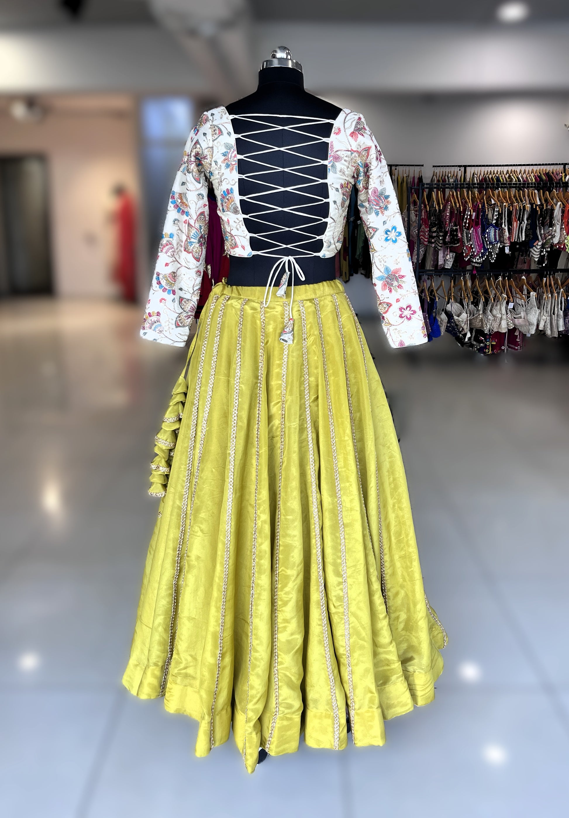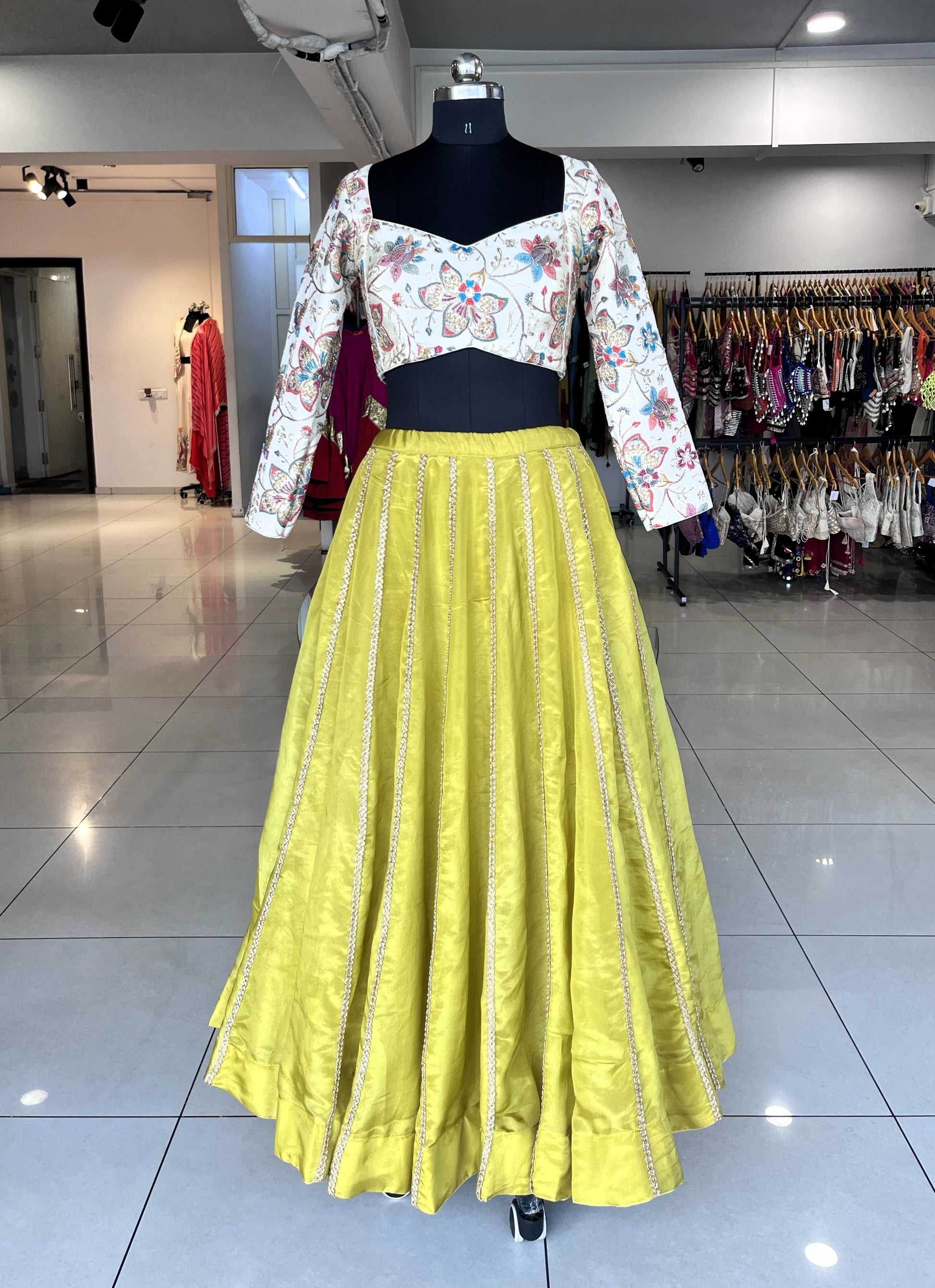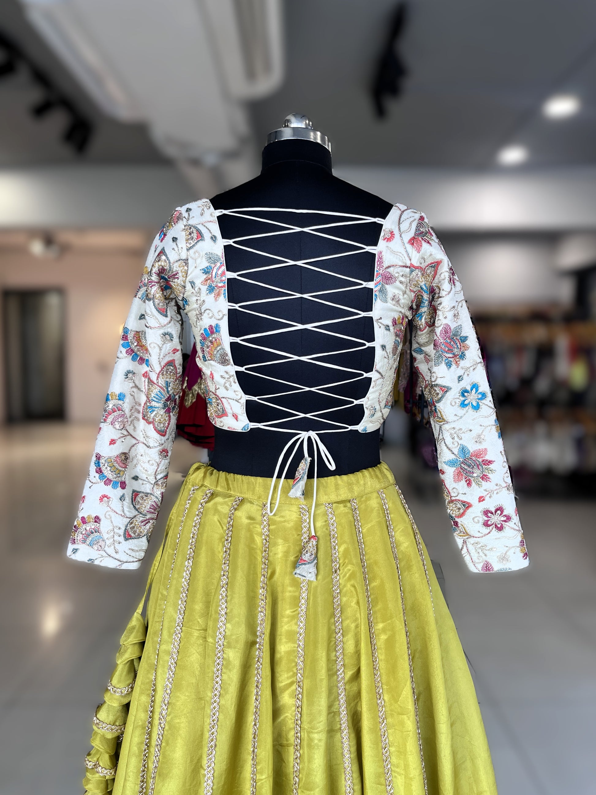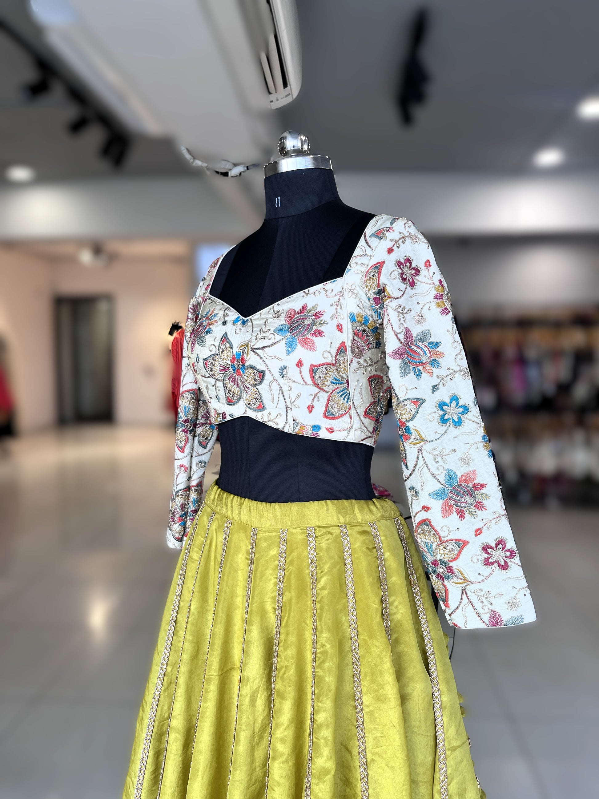 This exquisite top is crafted from premium kanjivaram tissue silk fabric and elevated with delicate handwork detailing. Every stitch adds a touch of artistry, giving the piece a refined and luxurious finish. Stylish, versatile, and beautifully made — this top blends timeless craftsmanship with modern design. This beautiful ensemble is adorned with delicate flower motifs, adding a soft, feminine charm to the look. The subtle handcrafted accents bring texture, charm, and a graceful sparkle, making it perfect for festive occasions, celebrations, or elegant evening wear.