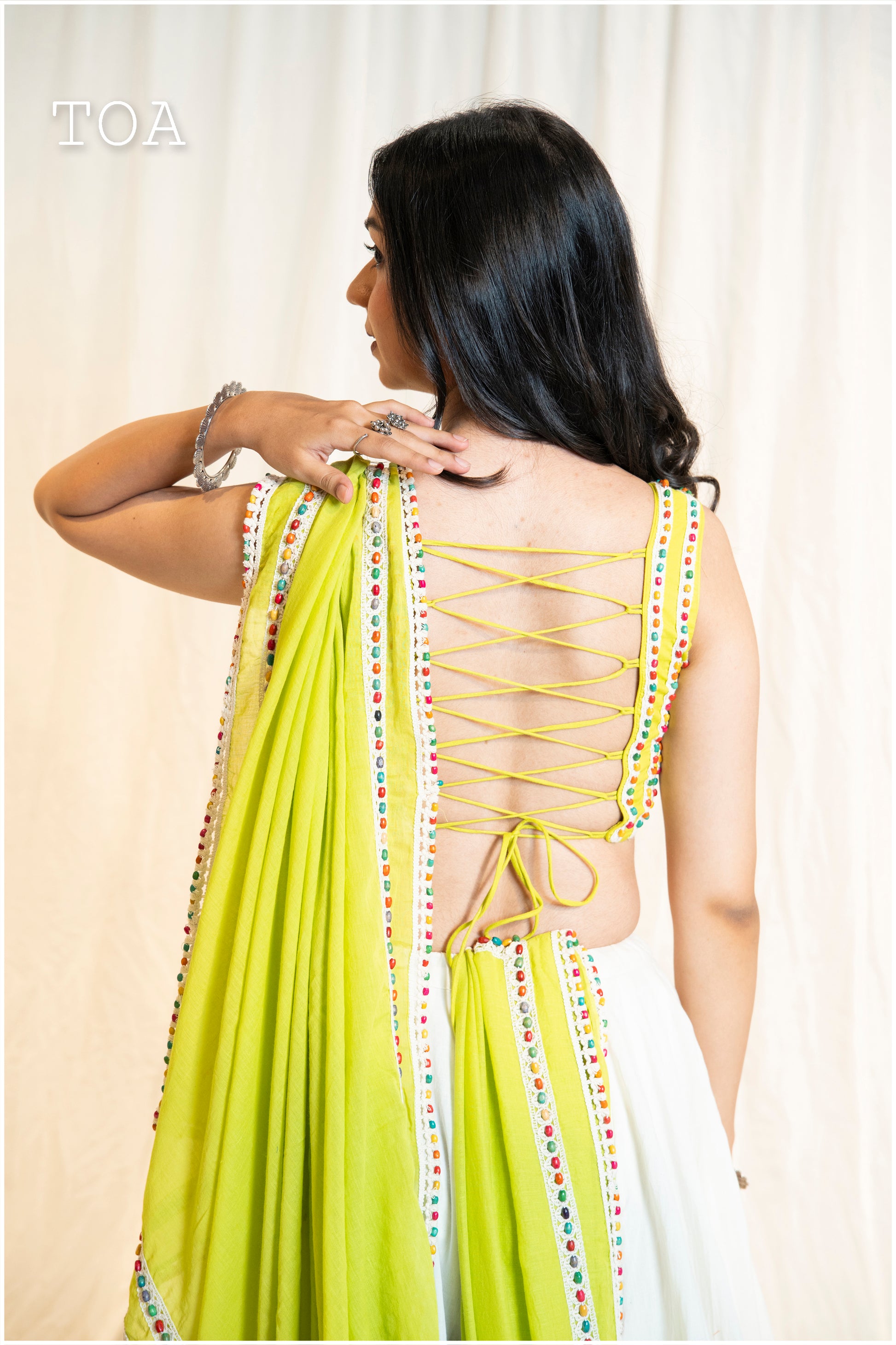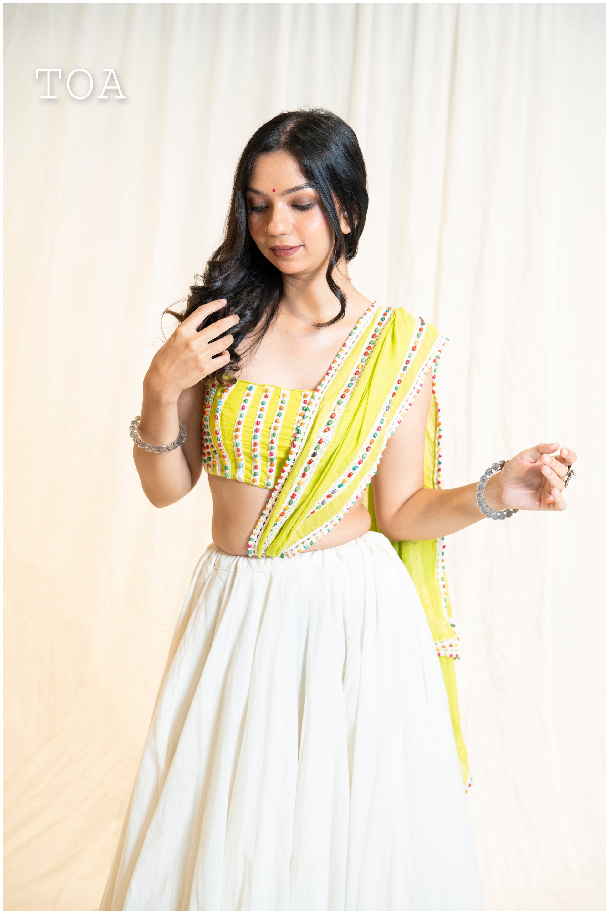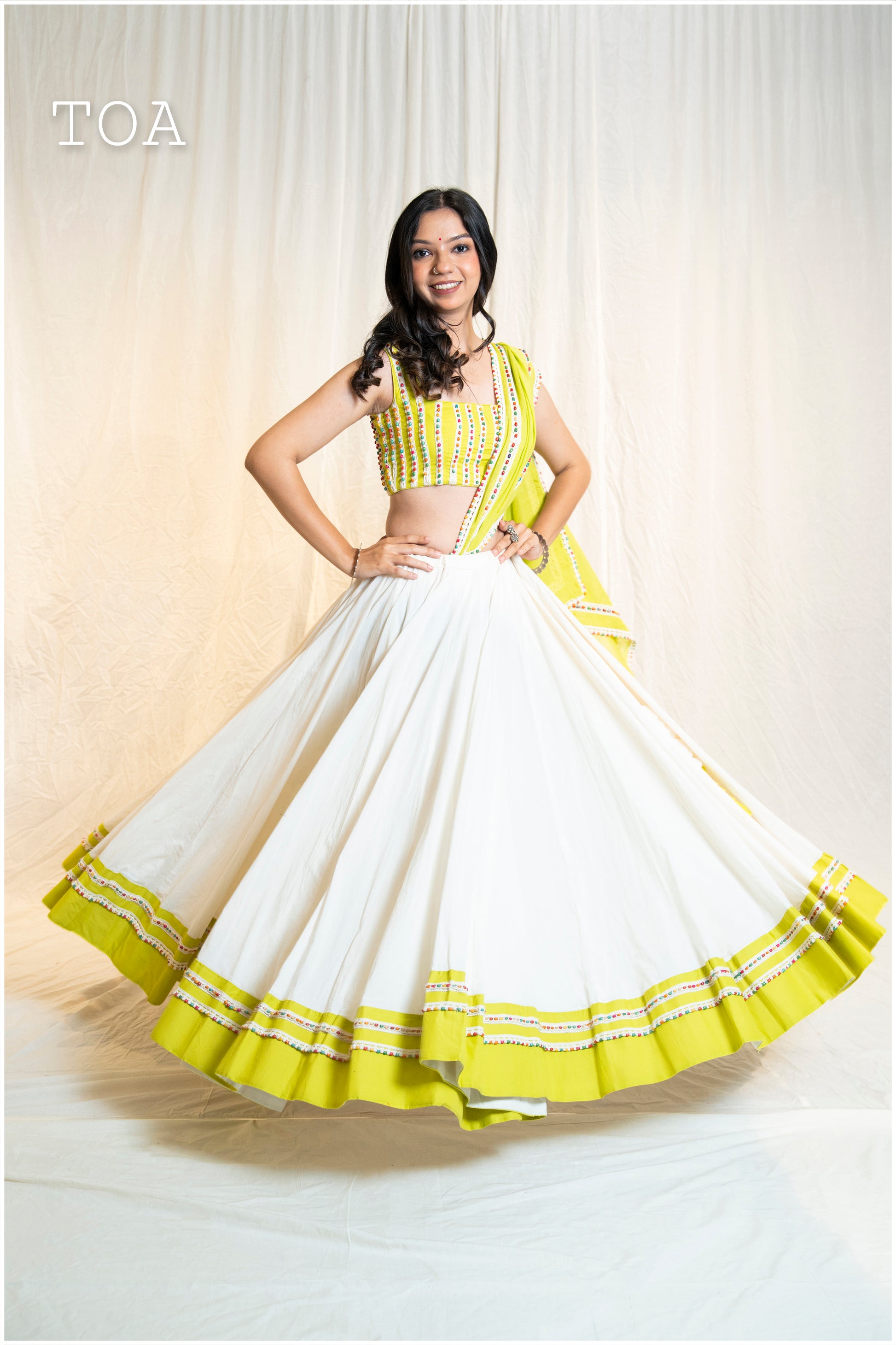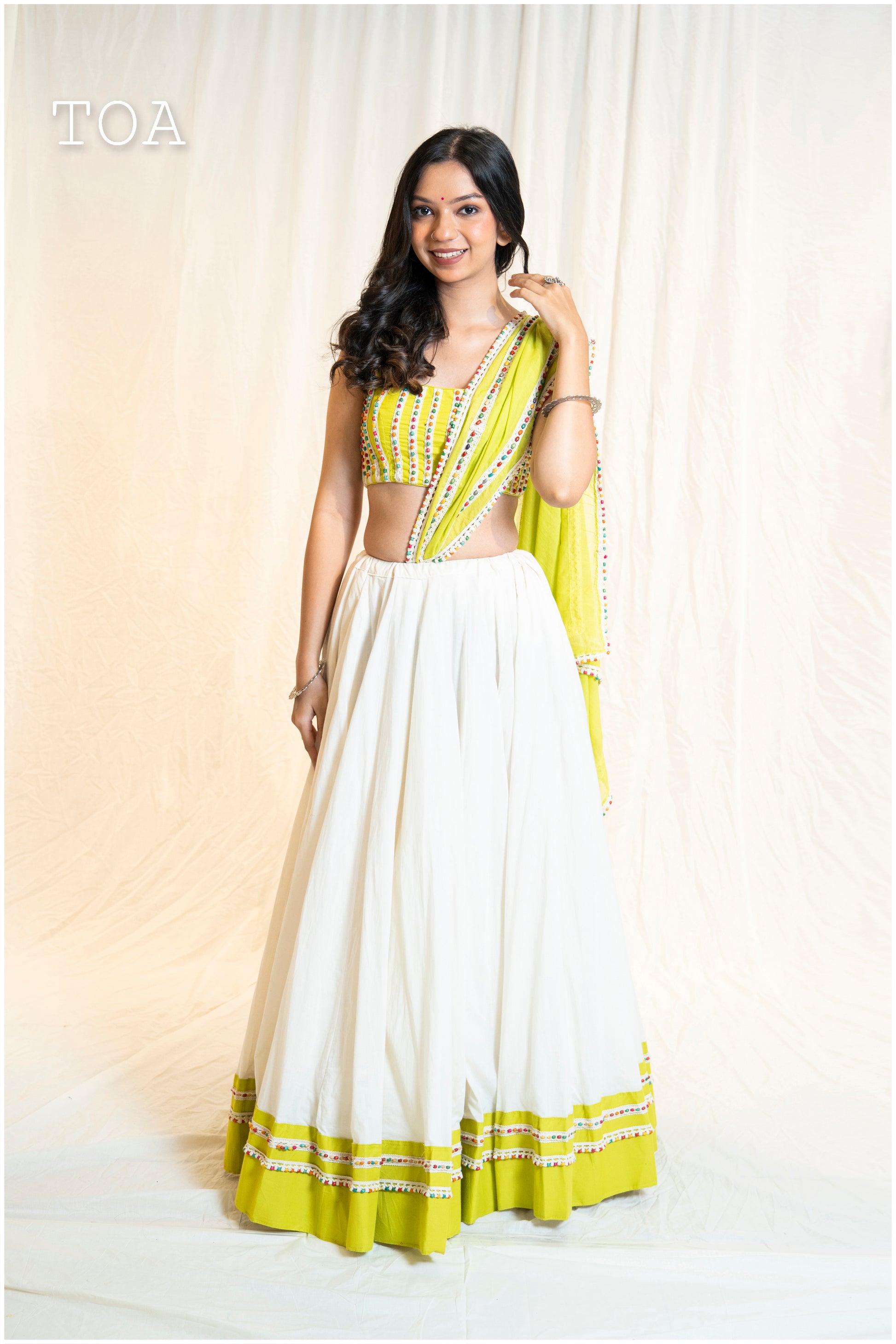 Crafted from premium cambric fabric, this blouse features an elegant Lucknowi-style border adorned with detailed multi-wooden bead handwork. Its modern fusion design includes back strings, creating a bold and stylish look. Built-in padding ensures a smooth and flattering fit. Versatile and chic, it pairs beautifully with skirts, flared trousers, or festive sets. The accompanying cambric cotton skirt is highly sought after, with 24 meticulously made kallis that create a dramatic flare over 9 meters long. Contrasting horizontal colors accentuate its graceful movement. Equipped with a discreet zip pocket and delicate decorative hangings, this skirt blends comfort, sophistication, and craftsmanship. The dupatta is crafted from mul cotton, featuring wooden multi-bead Lucknowi border detailing for a refined finish.