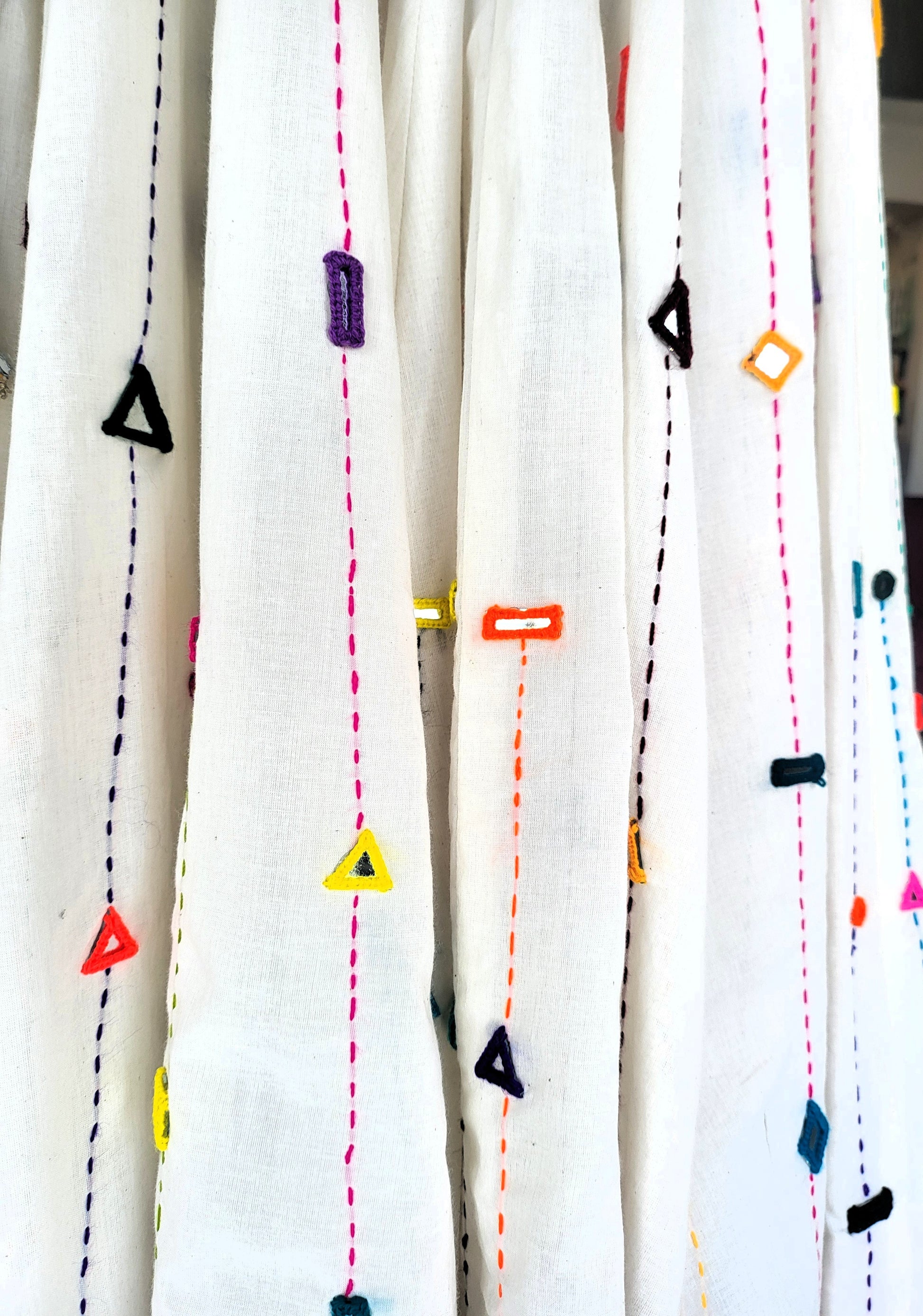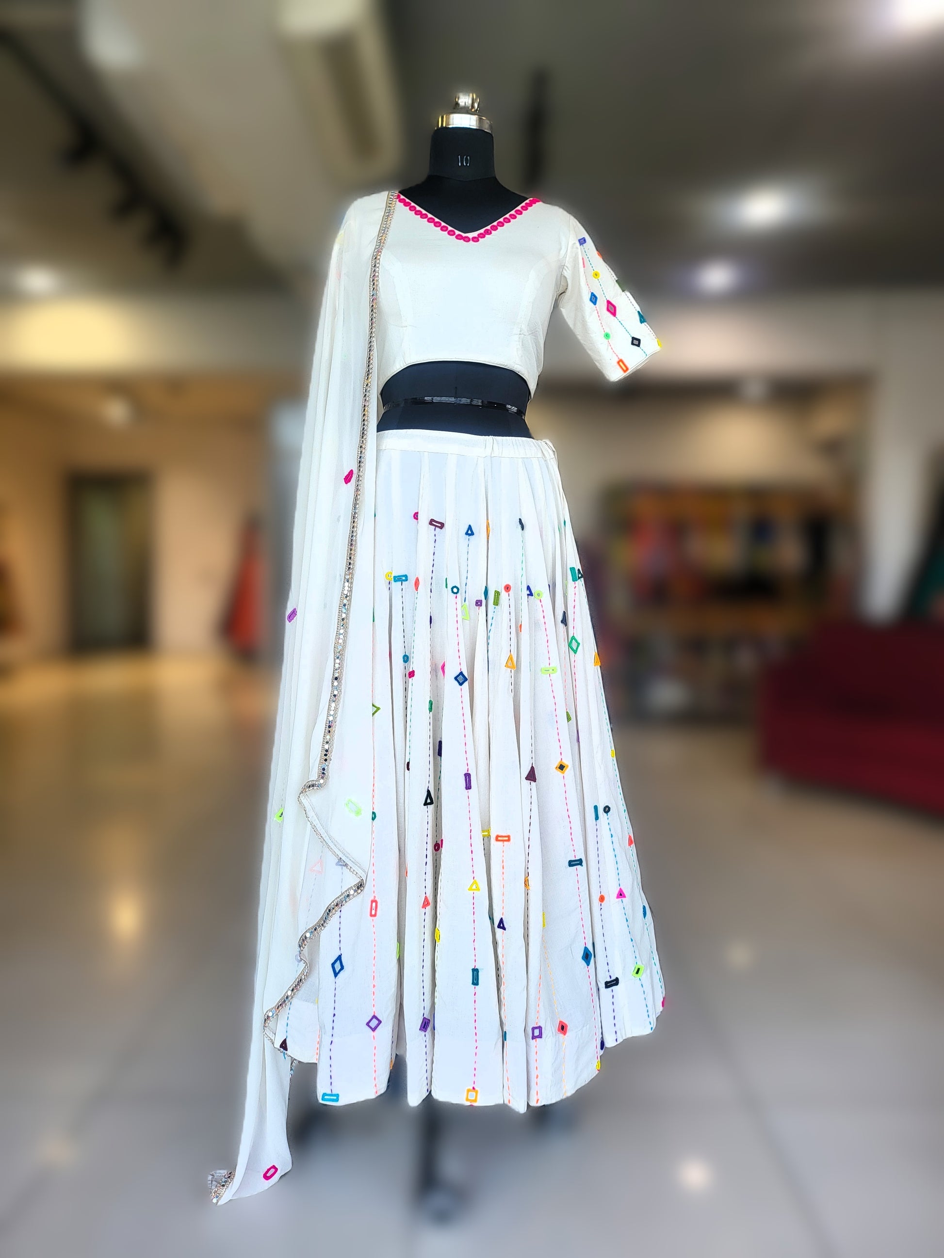 The dupatta adds the final touch of elegance — made in lightweight georgette, hand-dyed in the same off white color with multi hand mirror work. Finished with playful hanging borders on all edges, it elevates the entire look.