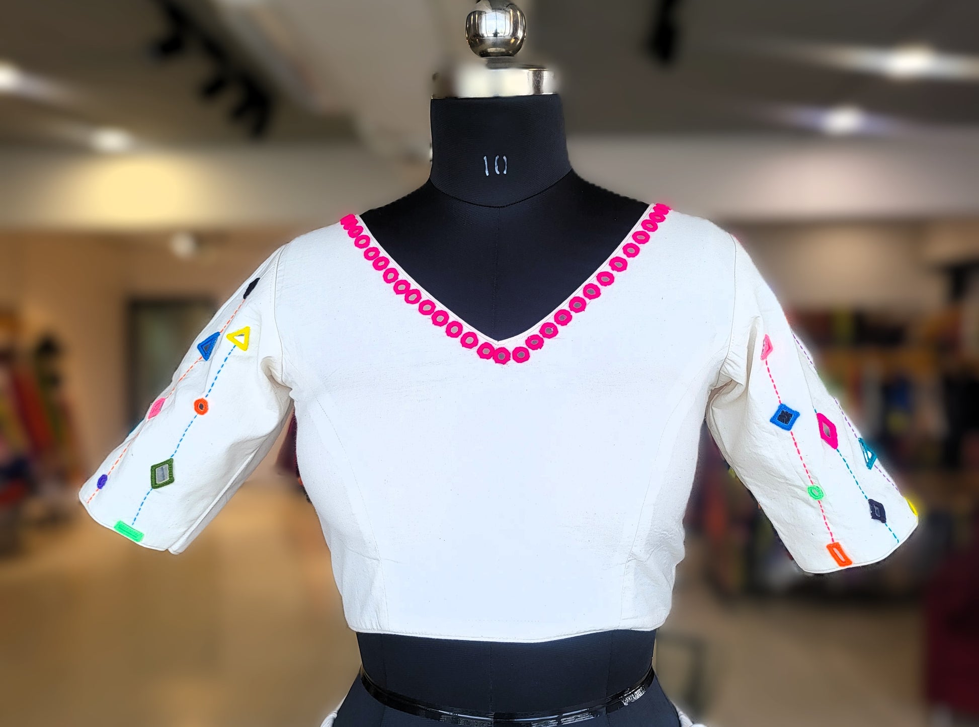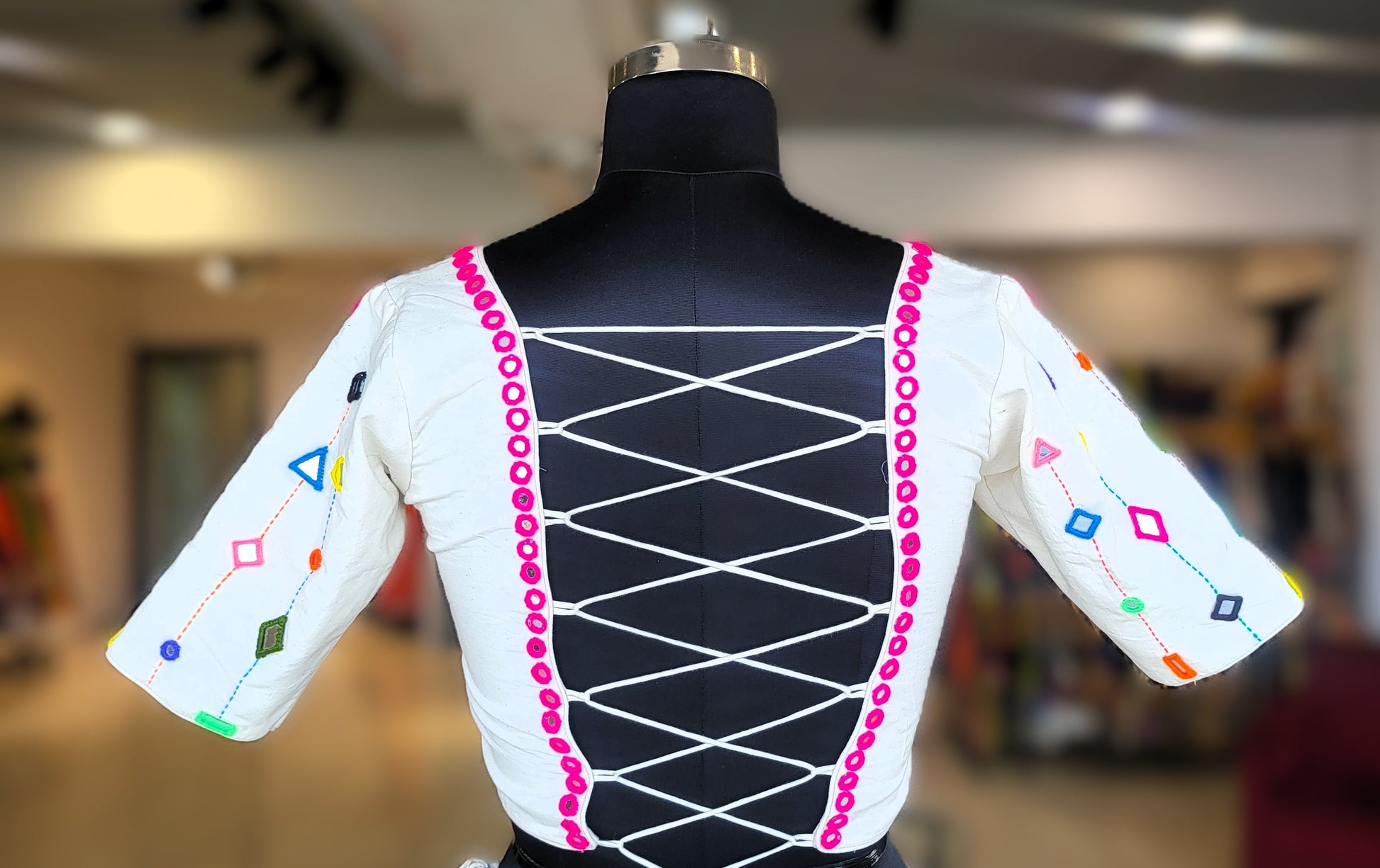 The blouse, also in cambric, Multi mirrors mirror work throughout. Designed in a chic style with back strings, it gives the perfect backless look and impeccable fit.