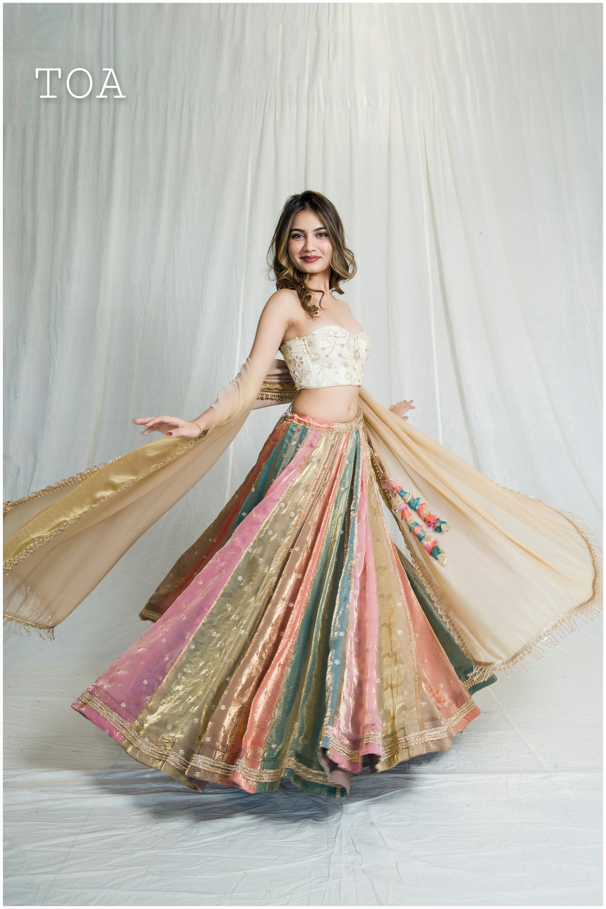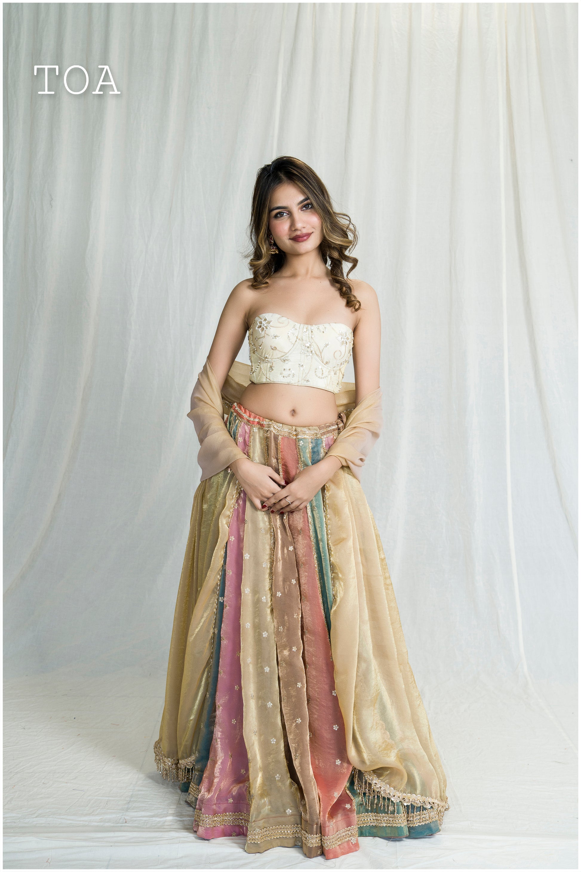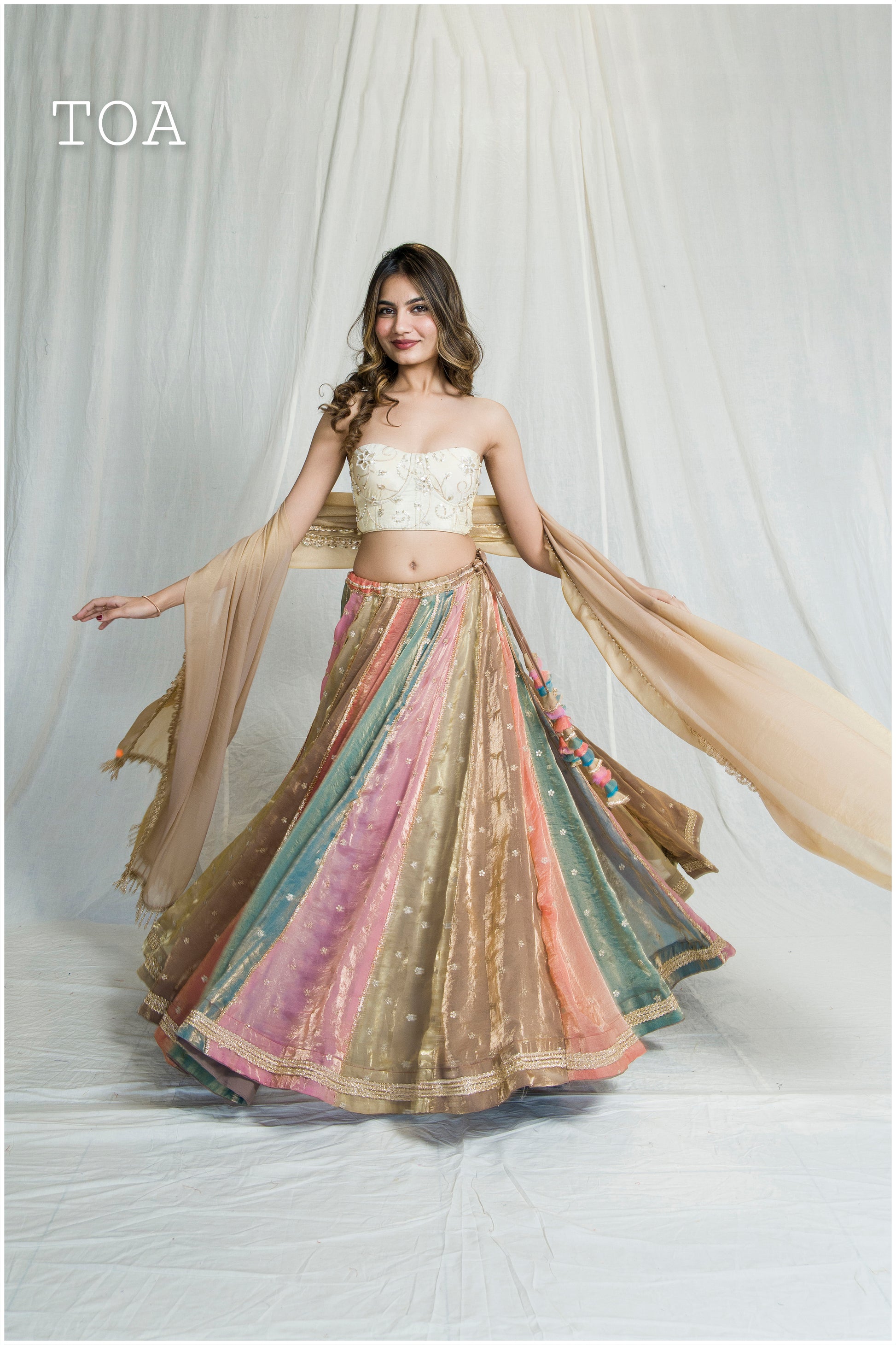 The skirt is crafted from luxurious Kanjivaram tissue silk, adorned with delicate sequin buttis all over. A rich zardoshi border enhances the hem, while the vibrant multi-color palette adds a regal charm—perfect for a graceful twirl that catches every eye.