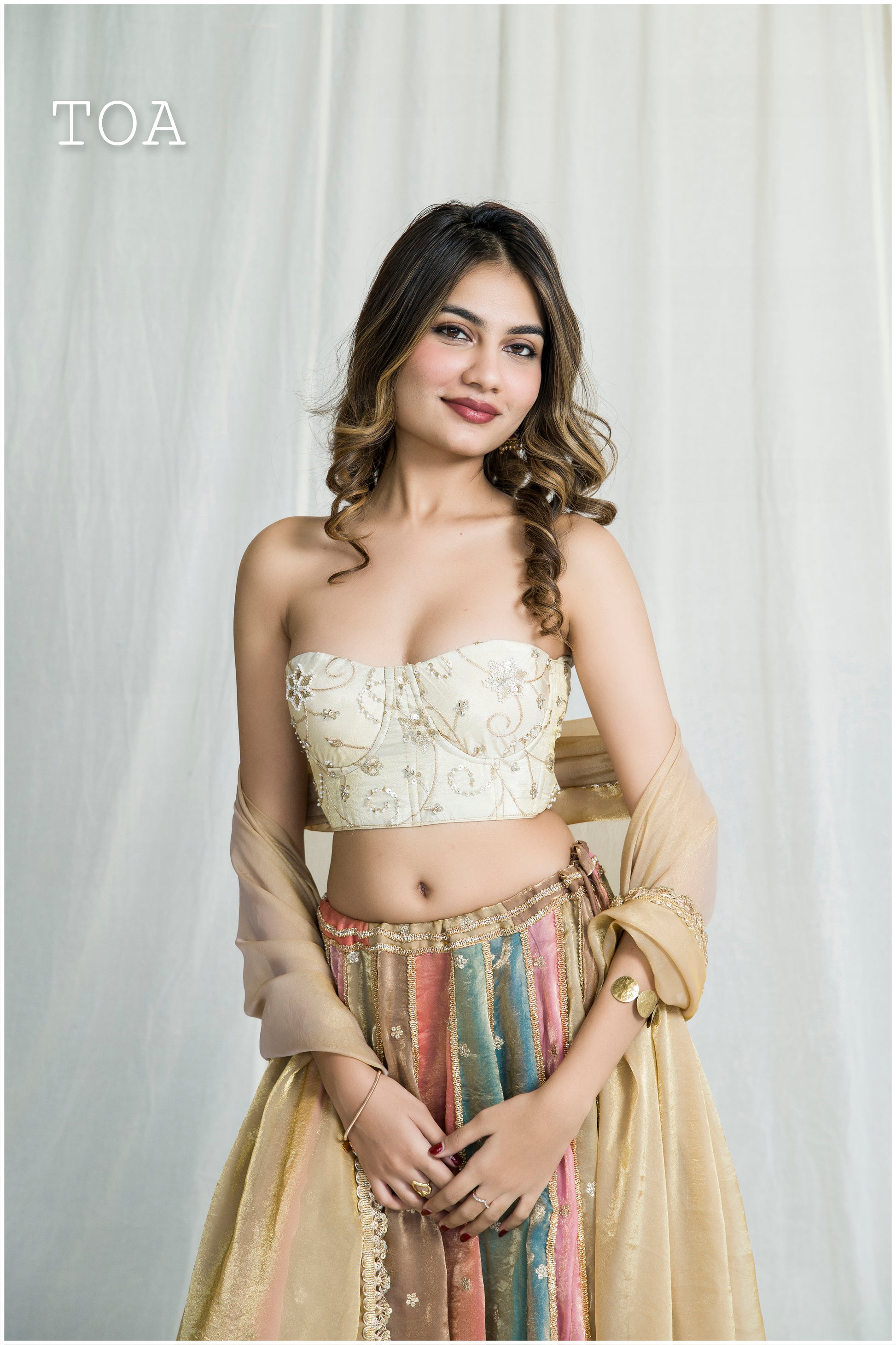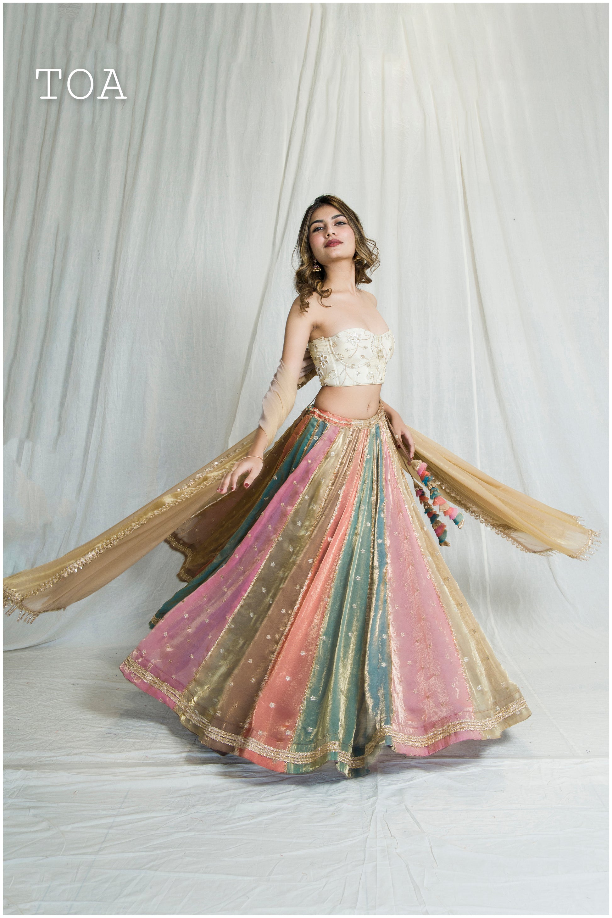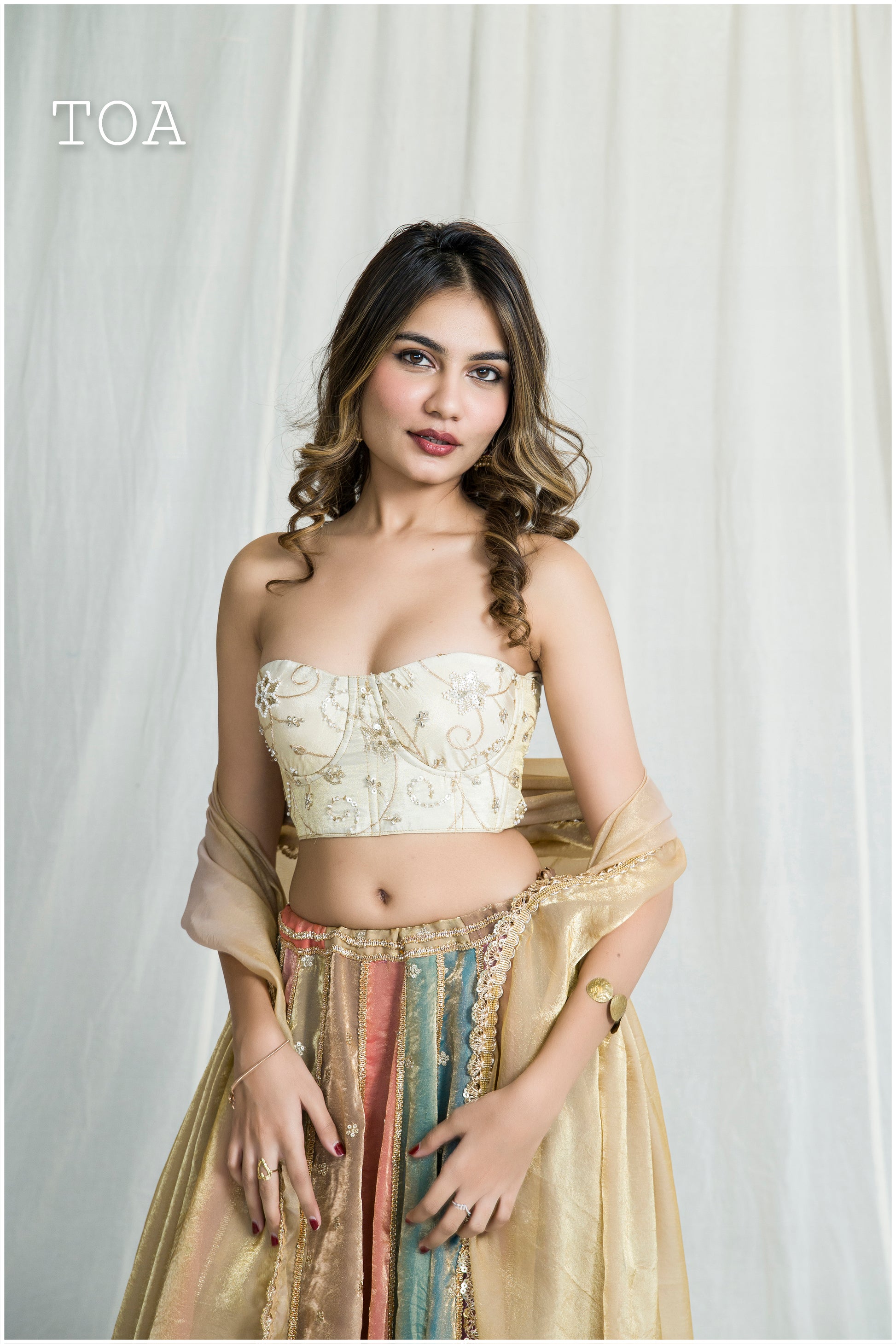 The skirt is crafted from luxurious Kanjivaram tissue silk, adorned with delicate sequin buttis all over. A rich zardoshi border enhances the hem, while the vibrant multi-color palette adds a regal charm—perfect for a graceful twirl that catches every eye.