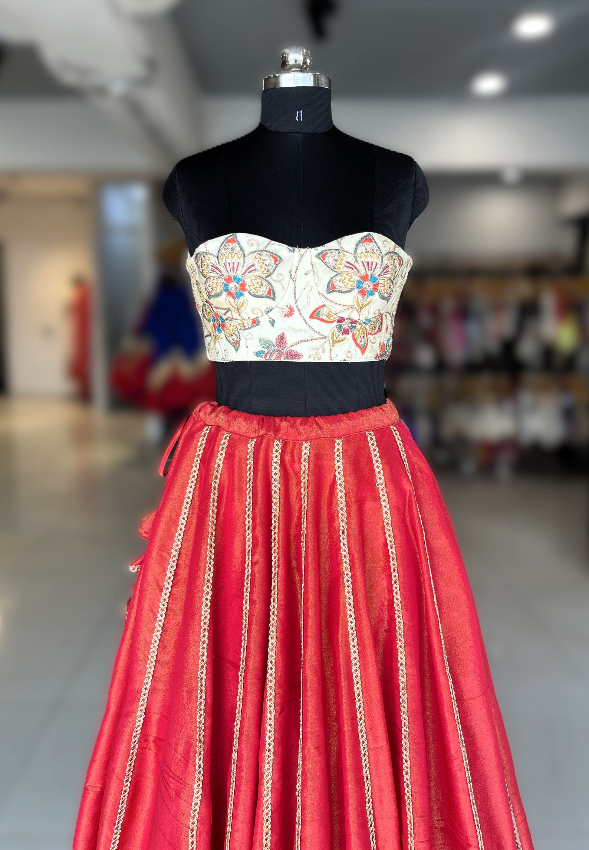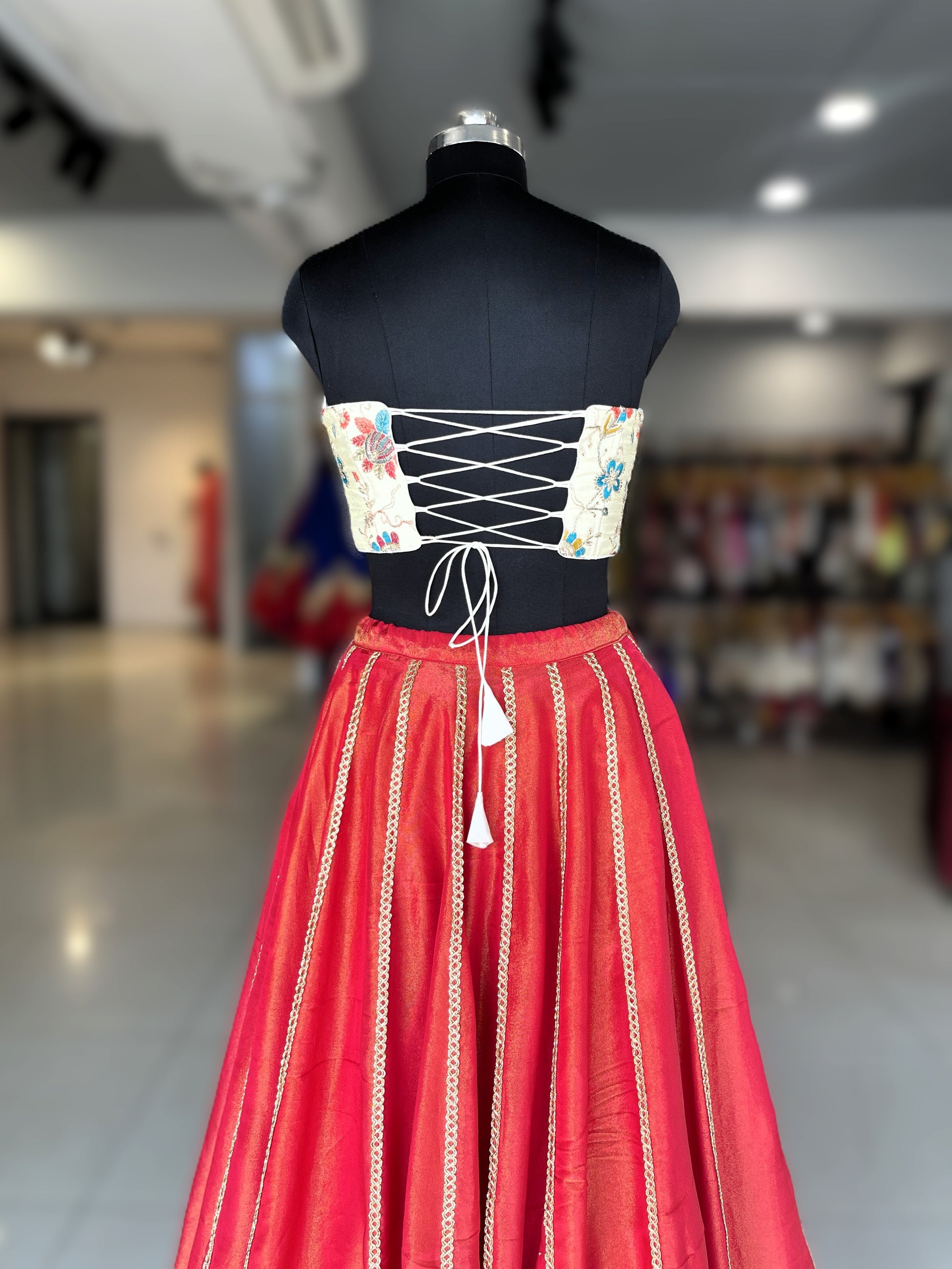 Paired with it is a structured corset adorned with intricate Multi resham and mix work all over, adding just the right touch of elegance and sparkle.