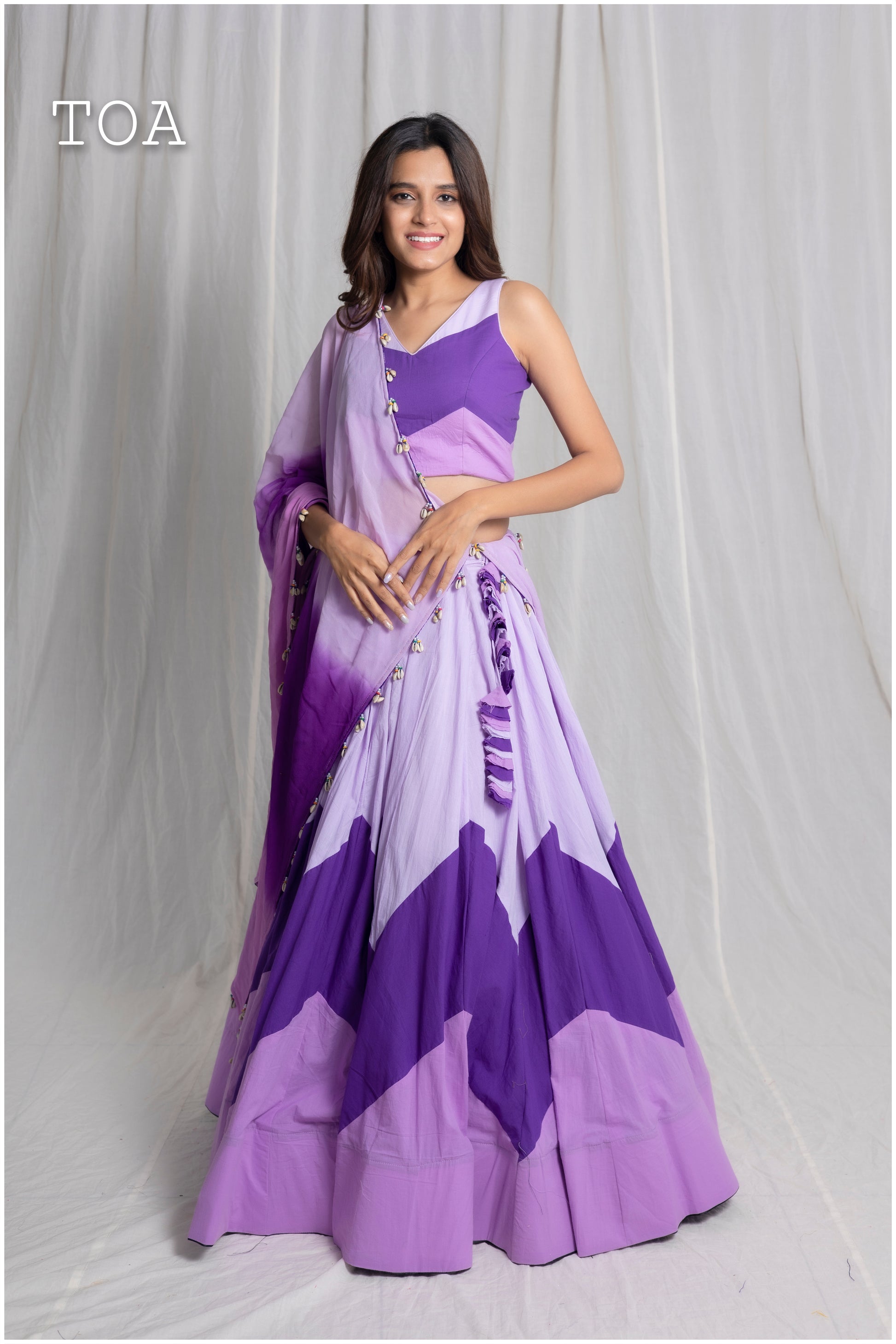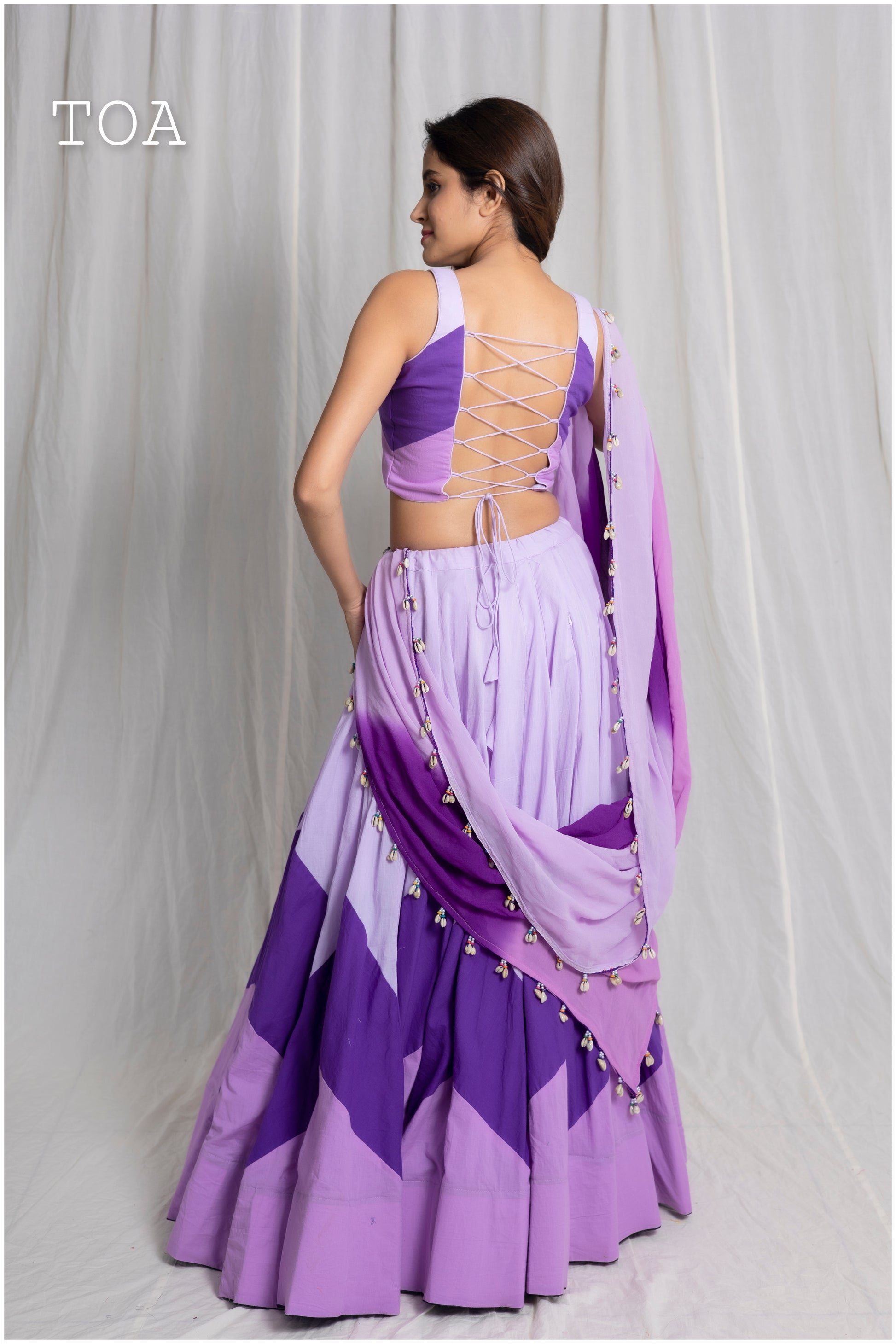 • Dupatta: Made of blended georgette, the dupatta is hand-dyed in three shaded colors, enhancing its royal appeal. A shells border along all edges completes the look with sophistication.