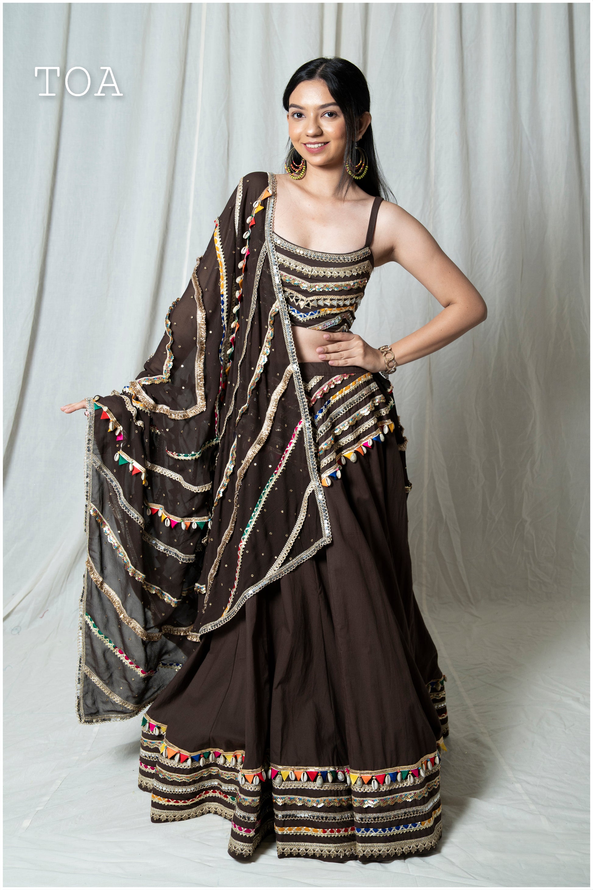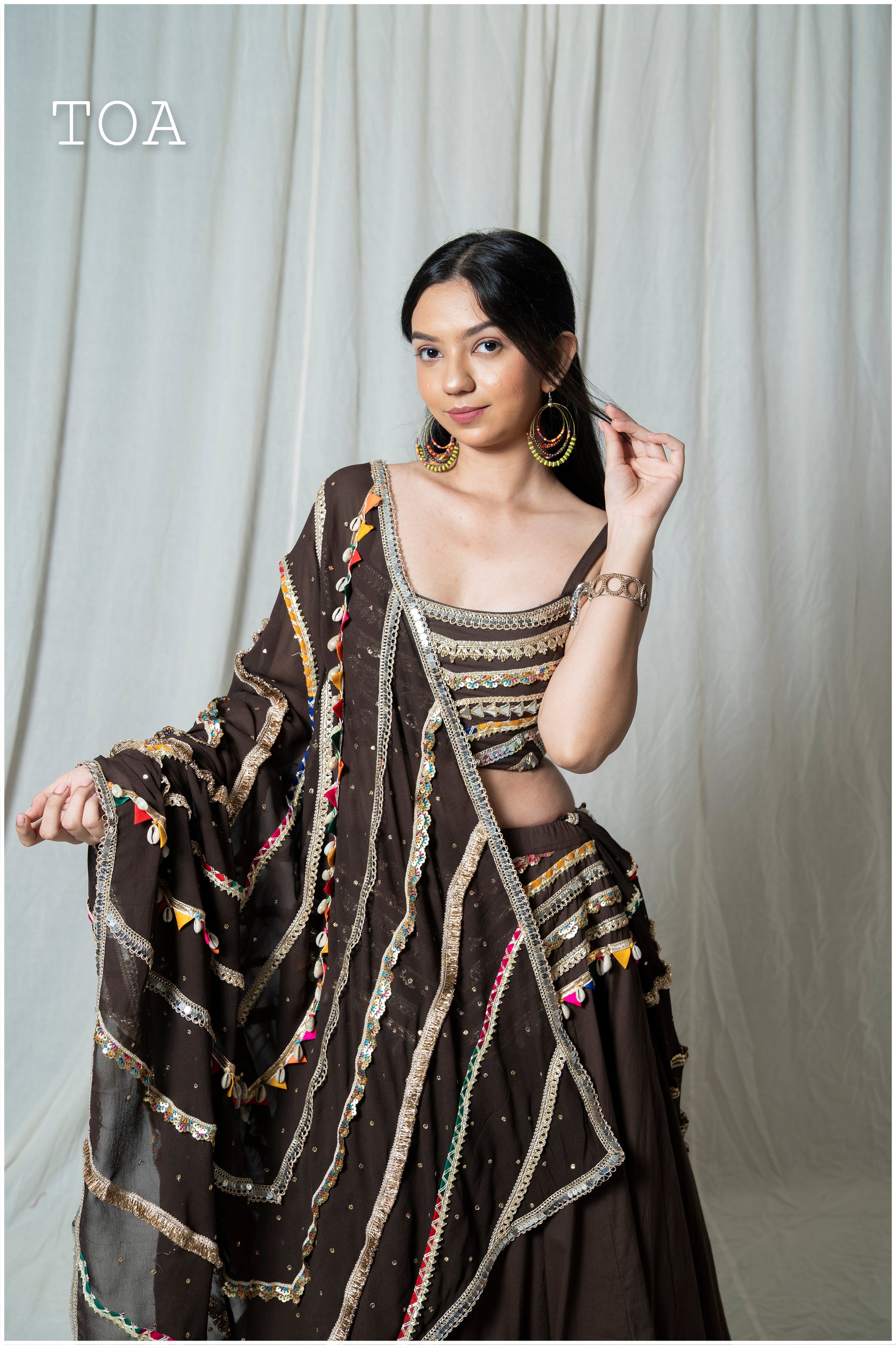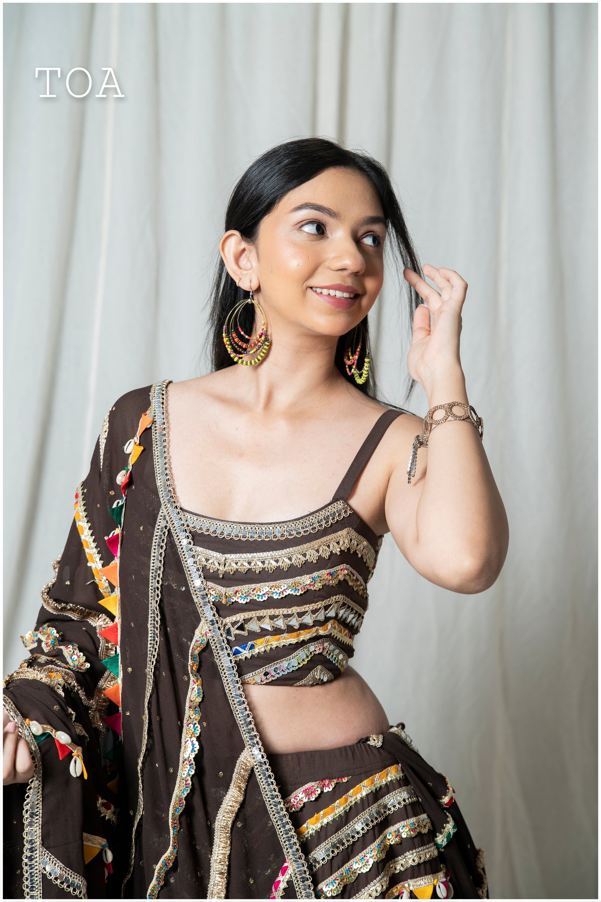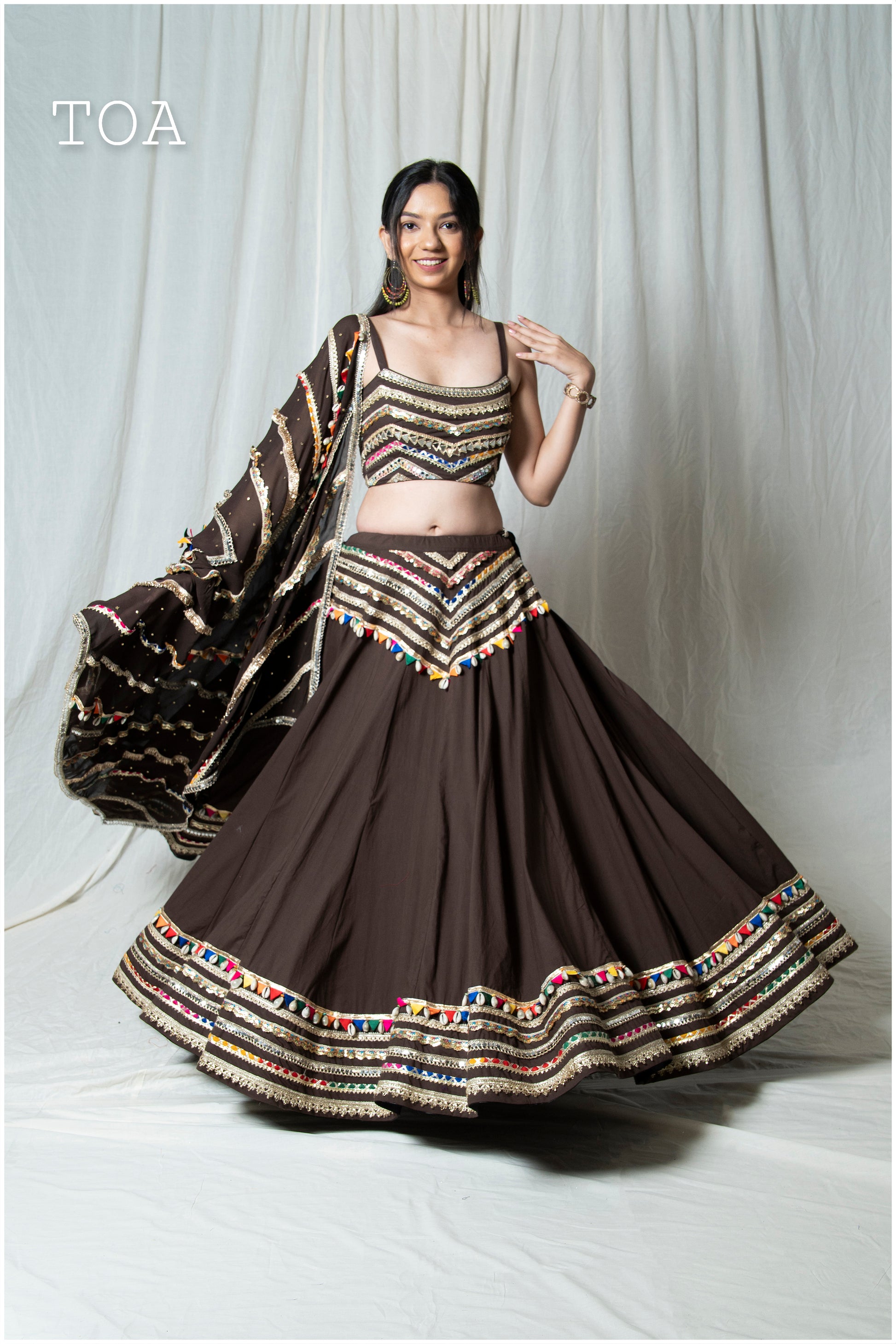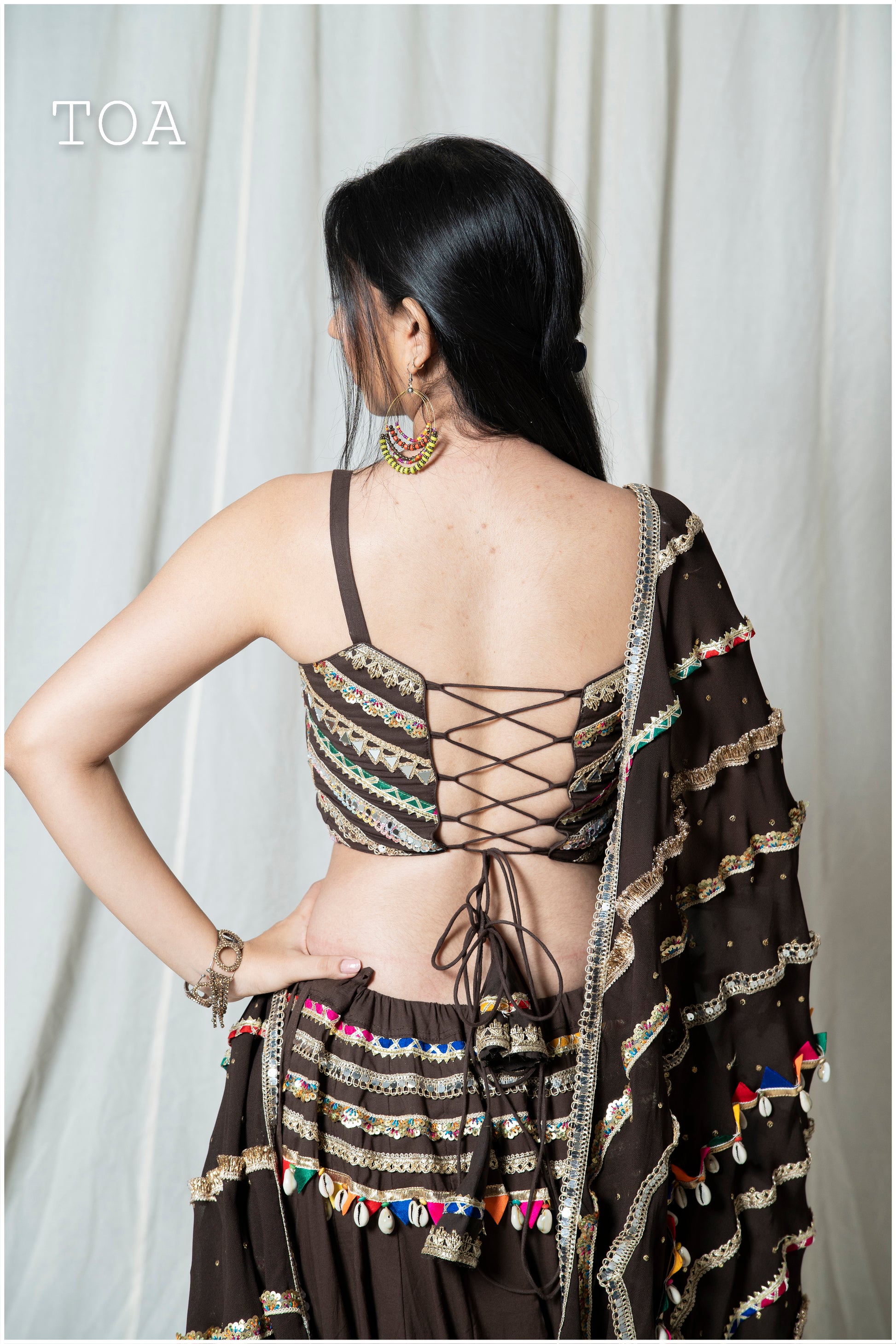The skirt, crafted from pure cambric fabric, features a stunning 24-kalli flare with over 9+ meters of volume—a dream for every twirl. Adorned with multiple borders in varying shapes, the placement is intentionally random, creating a unique, eclectic yet classy visual effect. And yes, it comes with pockets—because style should always meet functionality.