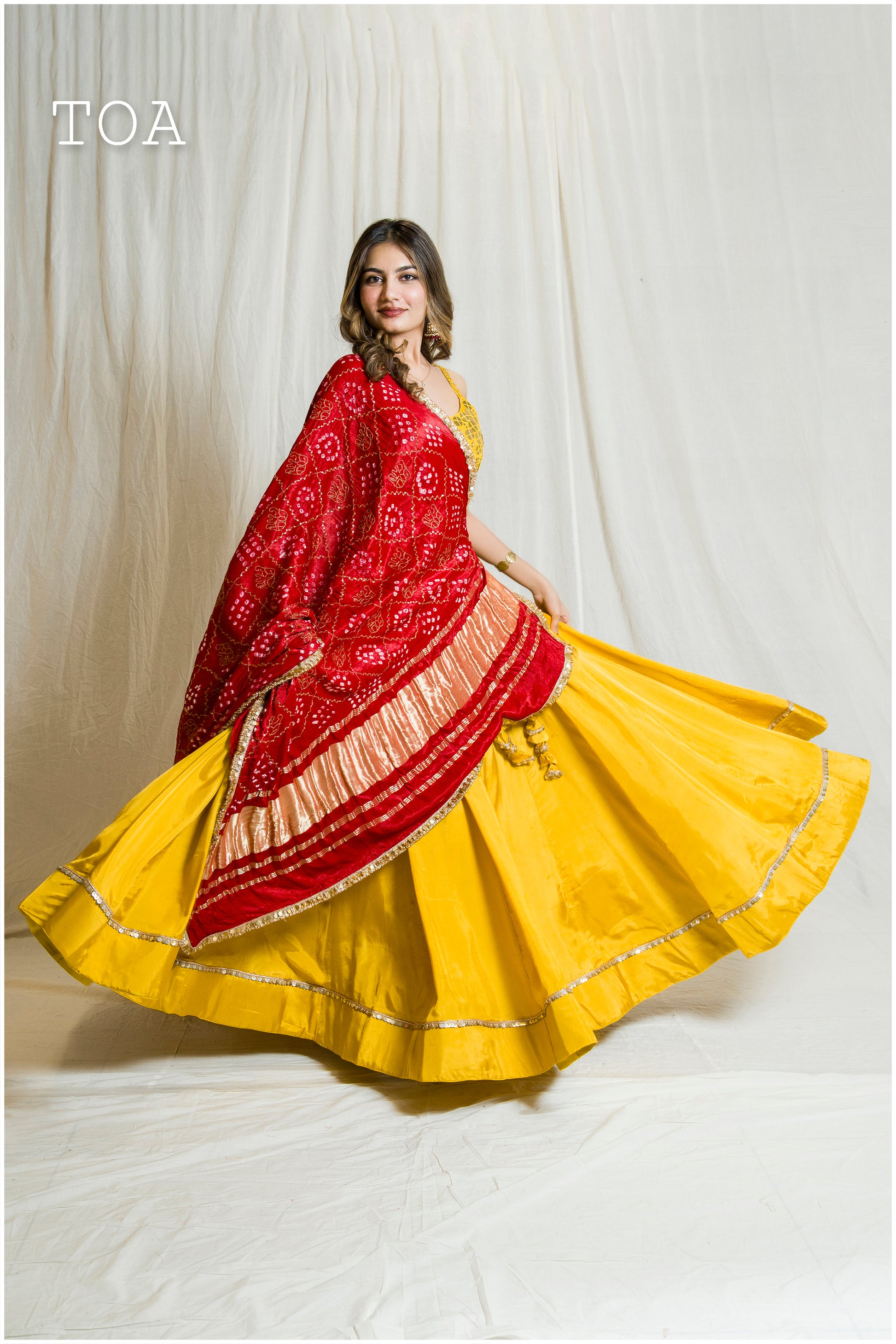 The skirt, stitched from premium Russian Silk fabric, features an impressive 24-kali construction, offering a grand flare of over 9 meters. Detailed with a delicate coin border at the hem, the skirt comes alive beautifully when you twirl, creating an unforgettable statement.