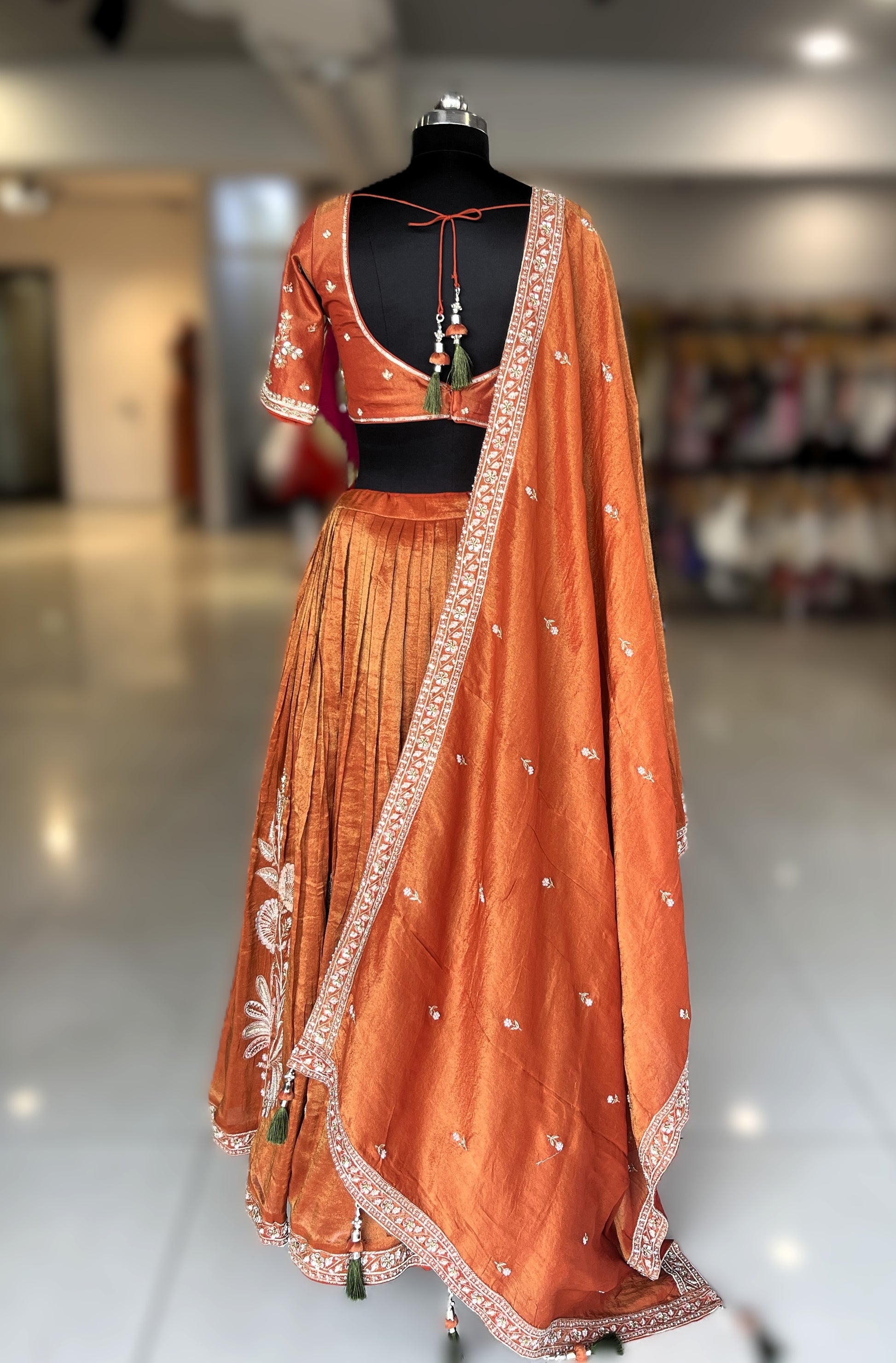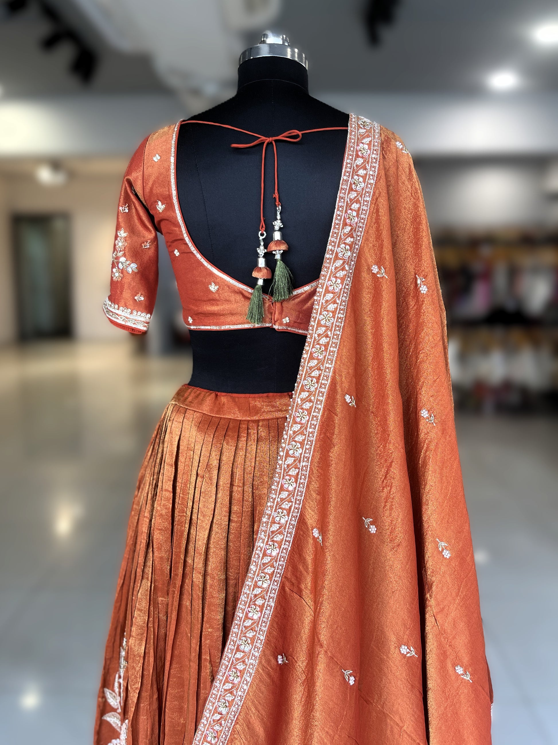 Introducing a beautiful Rust Lehenga Set, handcrafted from luxurious Kanjivaram tissue silk fabric. The natural shimmer of the tissue fabric makes it perfect for festive occasions, weddings, and grand celebrations. The blouse is designed with a stylish backless pattern the blouse and waistline, adding a unique charm. Perfect to flaunt at any wedding or festive celebration.