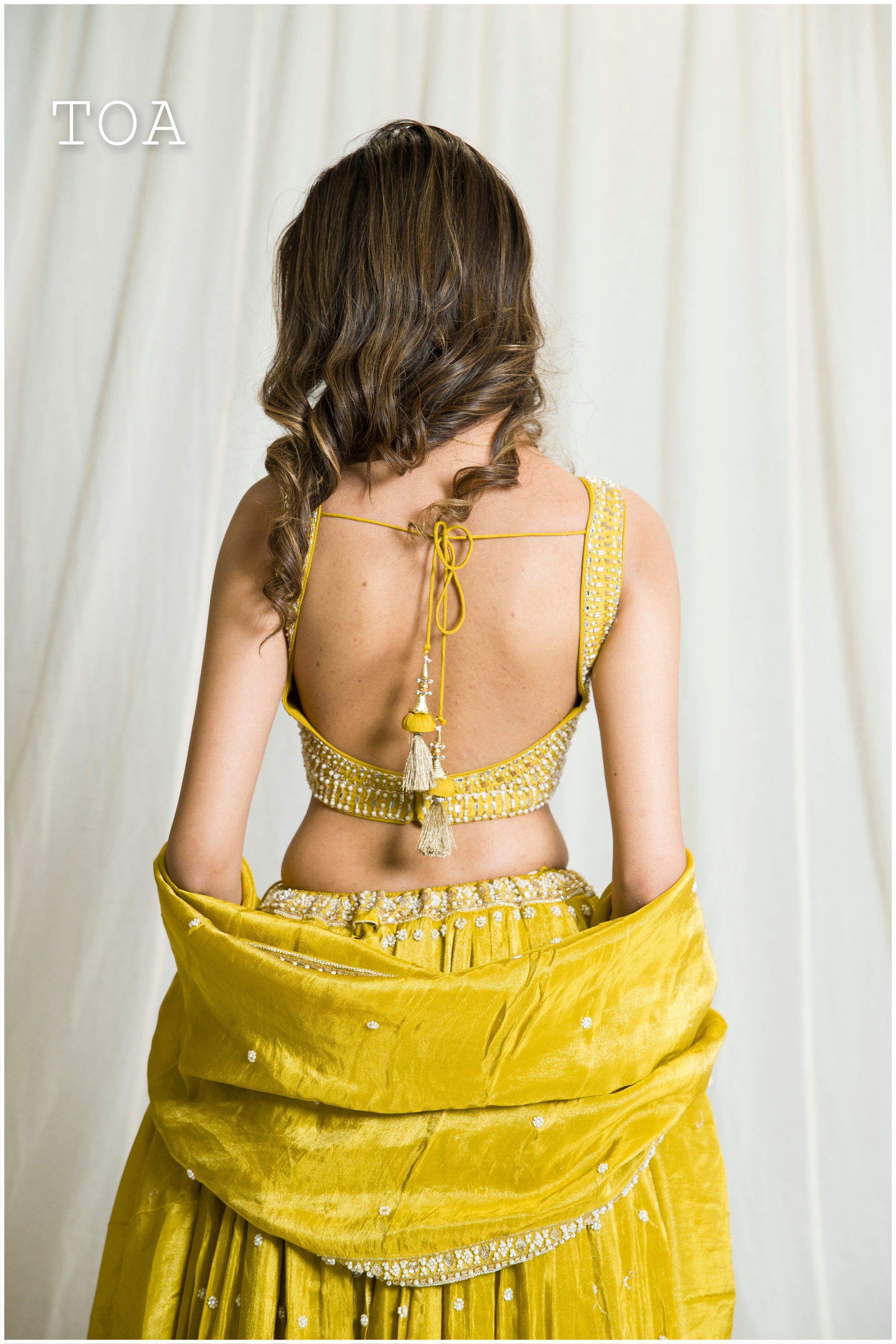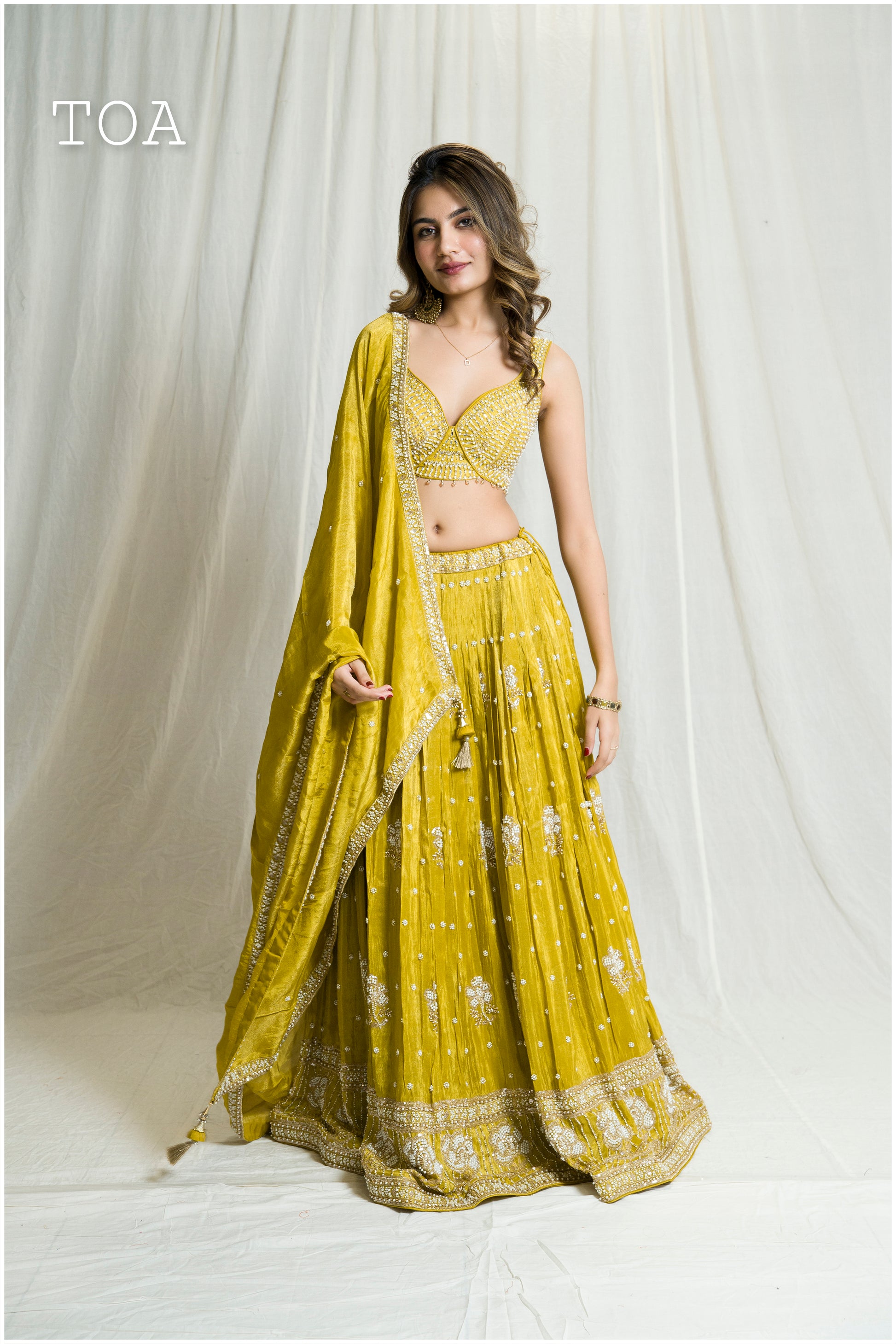 Introducing a beautiful dry mehendi-coloured lehenga set, handcrafted on luxurious Kanjivaram silk fabric with intricate mix handwork of resham, zardoshi, and more. This 3-piece set includes a designer blouse, flared skirt, and dupatta — perfect to flaunt at any wedding festivity and make you feel like a true diva.