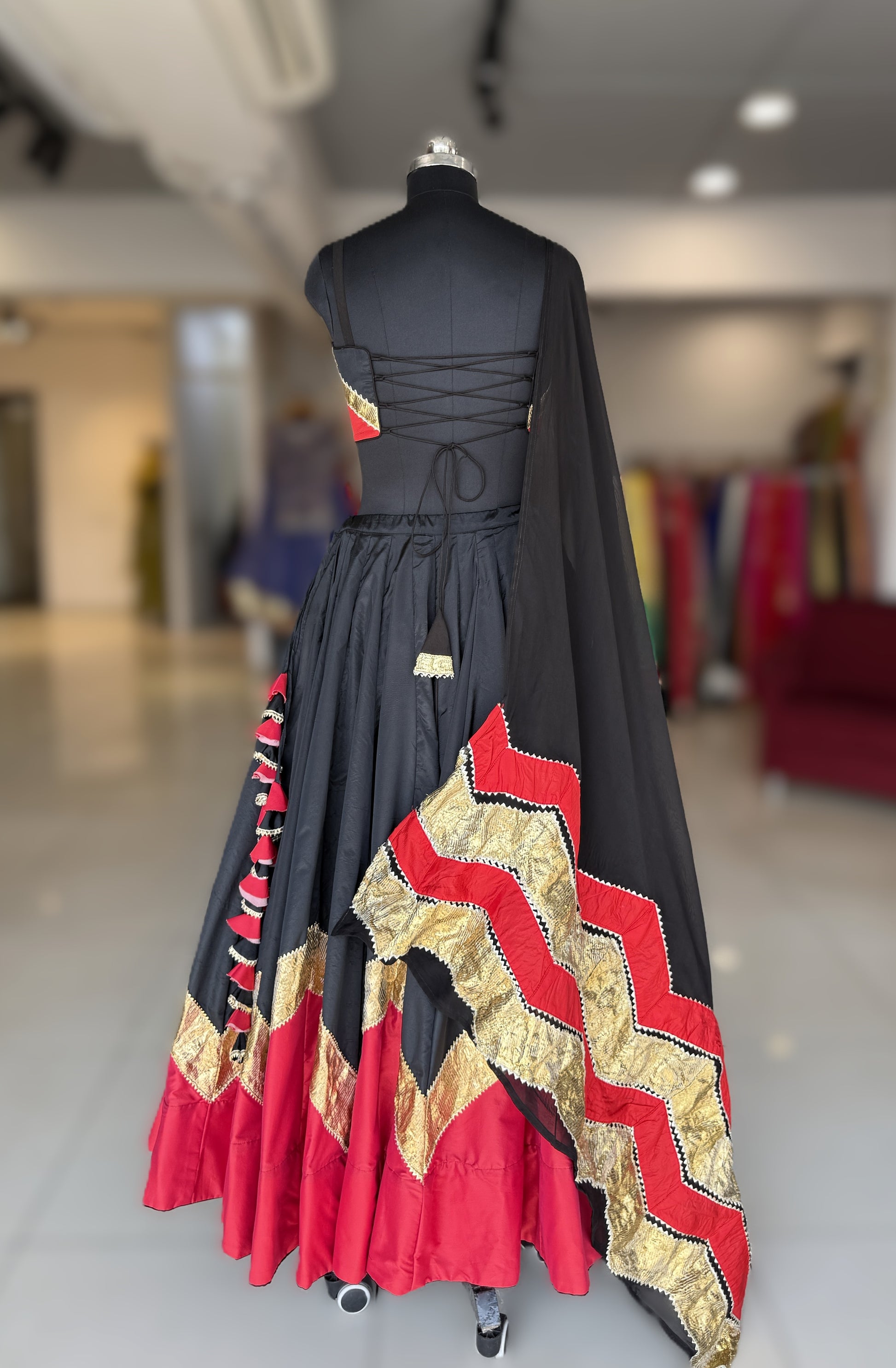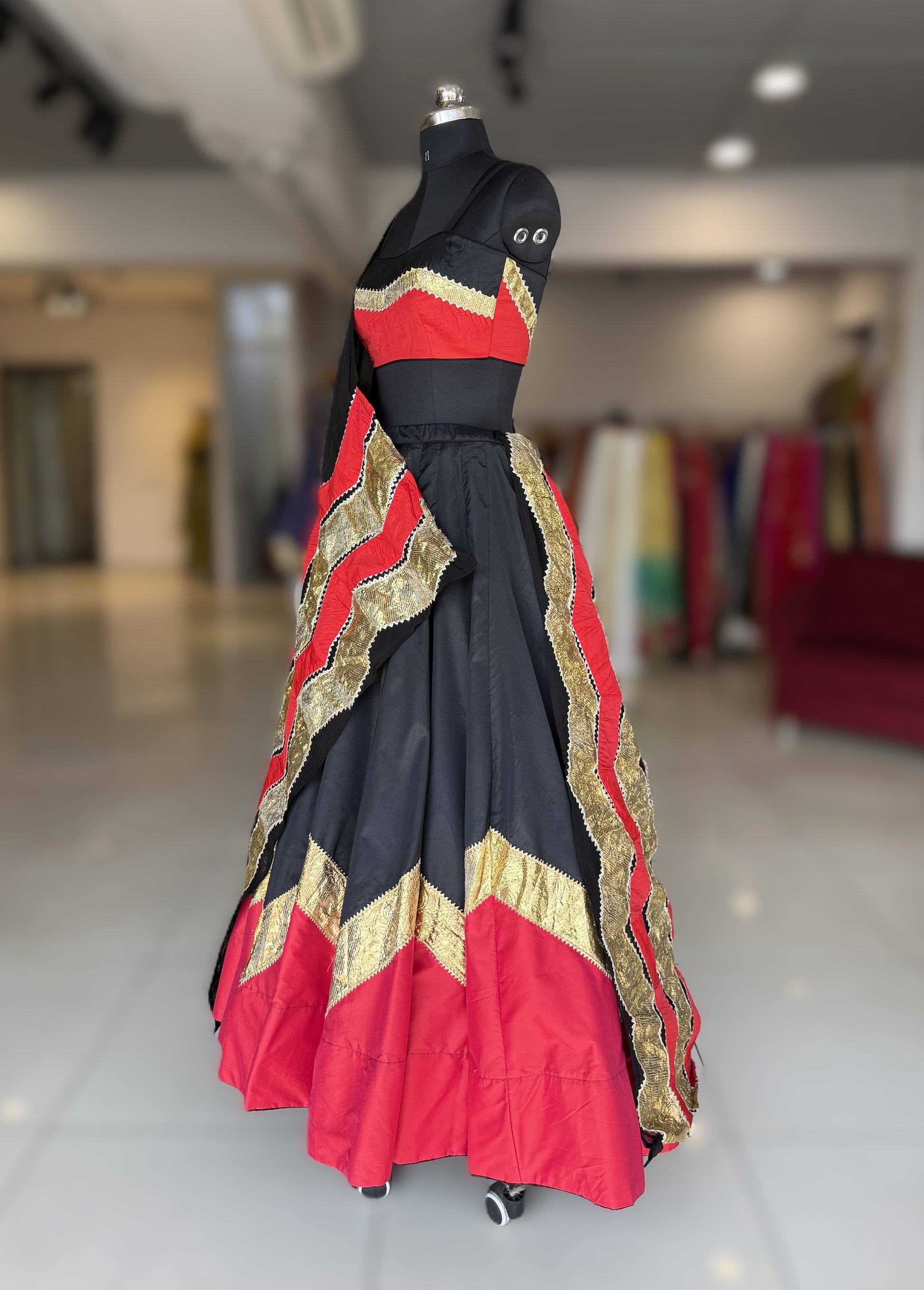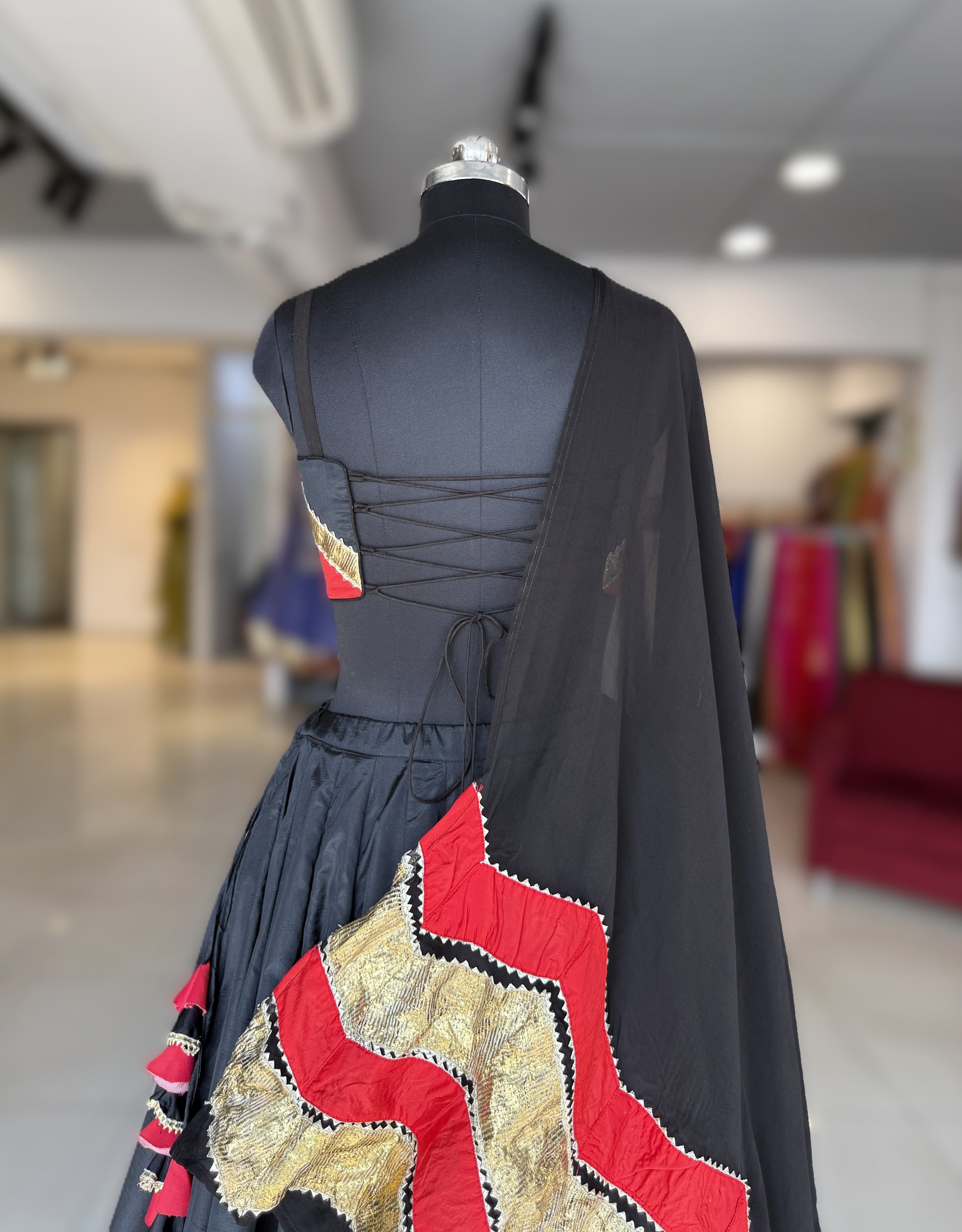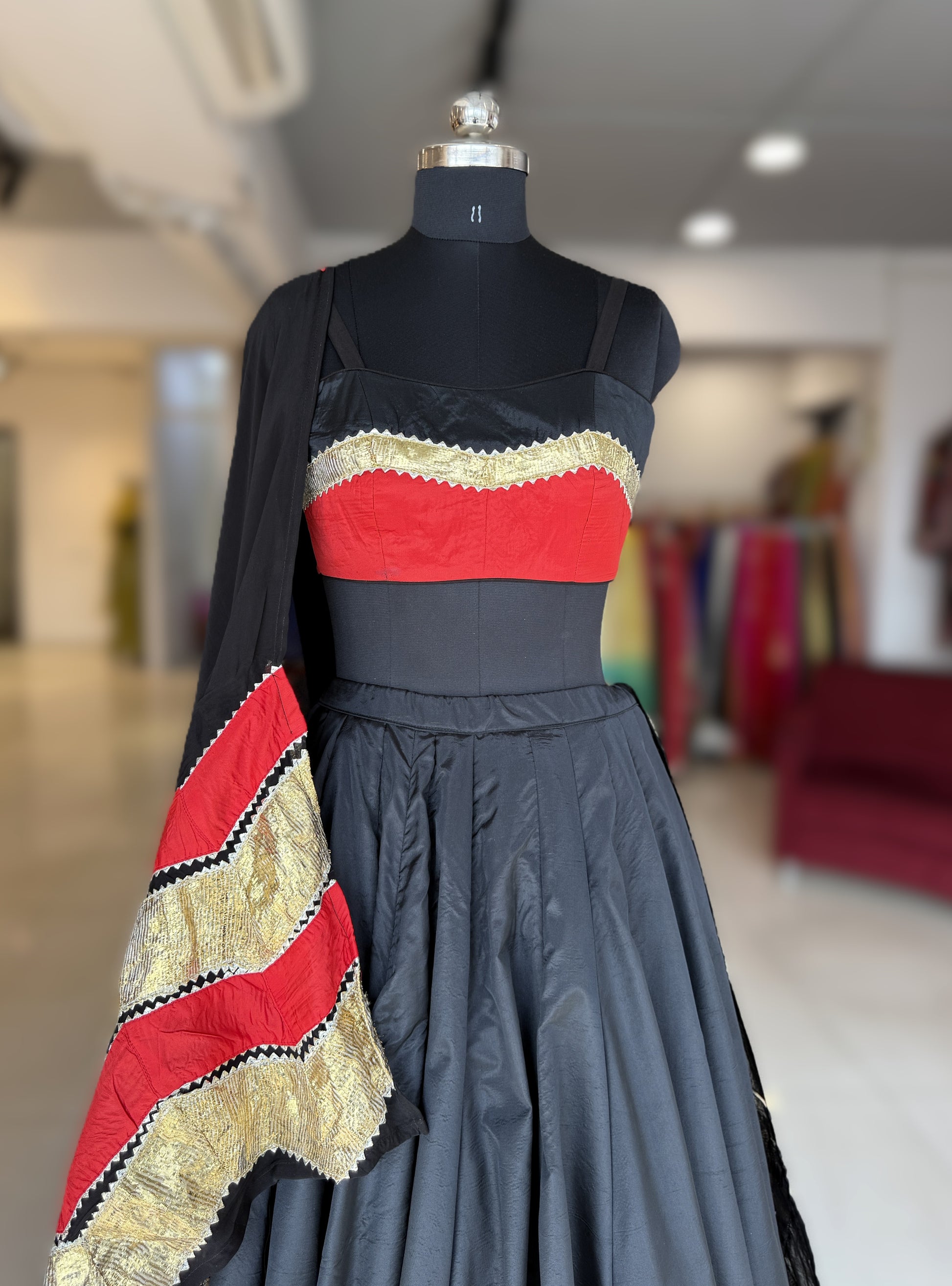 Dupatta : Paired with a flowy black organza dupatta, the look is elevated with a striking red silk panel adorned in a classic golden lampi lehriya pattern. The contrast of sheer organza with vibrant red silk creates a dramatic yet sophisticated charm, while the lehriya detailing adds movement and artisanal elegance to the ensemble.