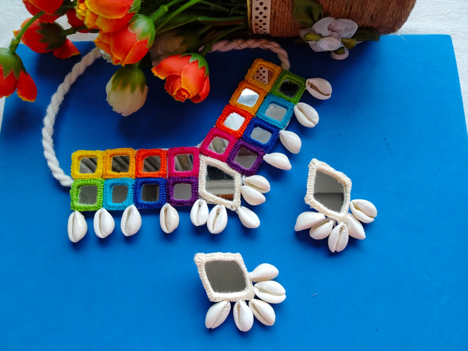 This vibrant rainbow choker necklace features authentic mirror hand embroidery and delicate shell detailing, adding a unique artisanal charm. It is finished with a wooden adjustable dori, allowing for a customizable and comfortable fit. Perfect for enhancing traditional or contemporary outfits with a touch of handcrafted elegance.