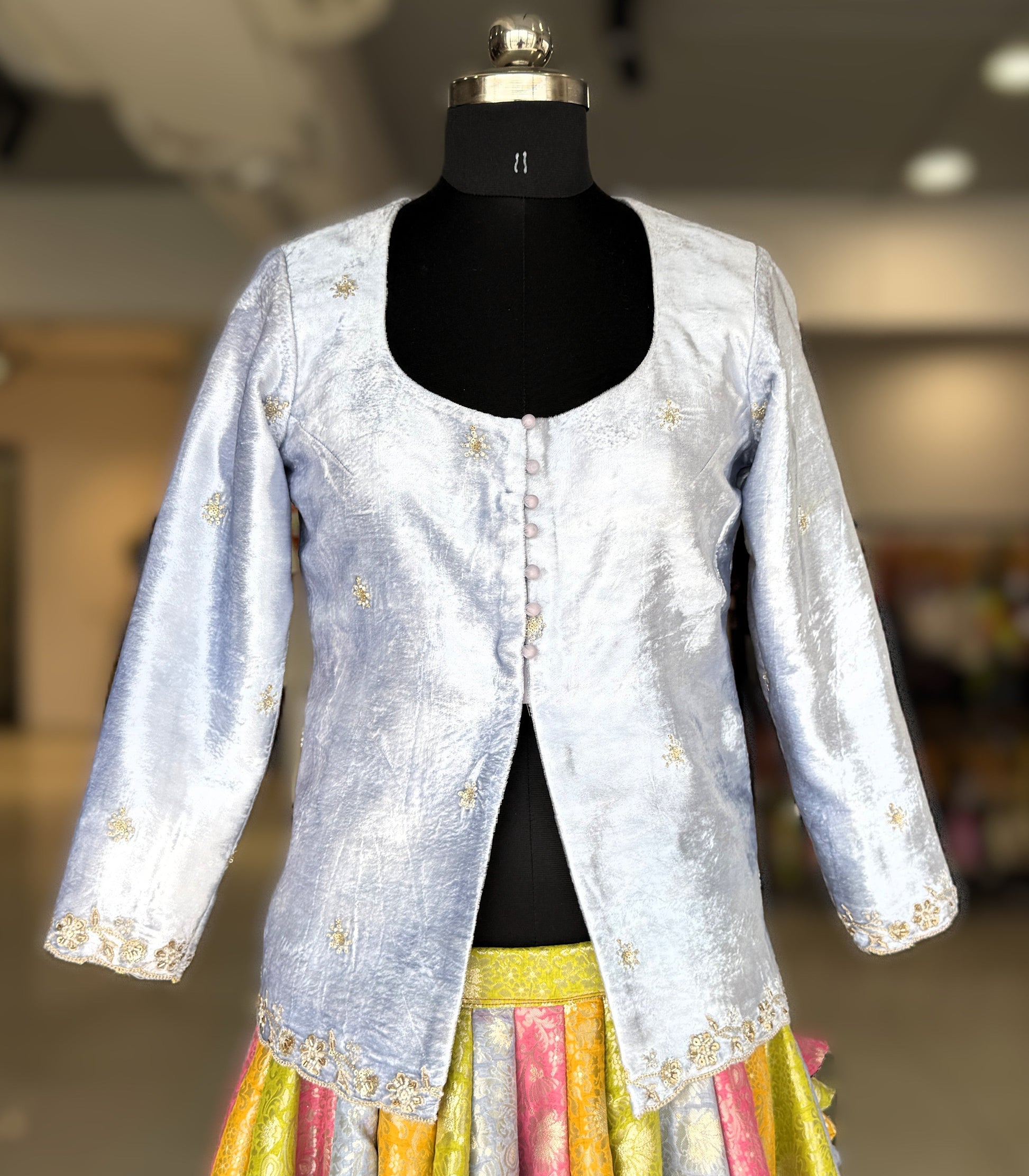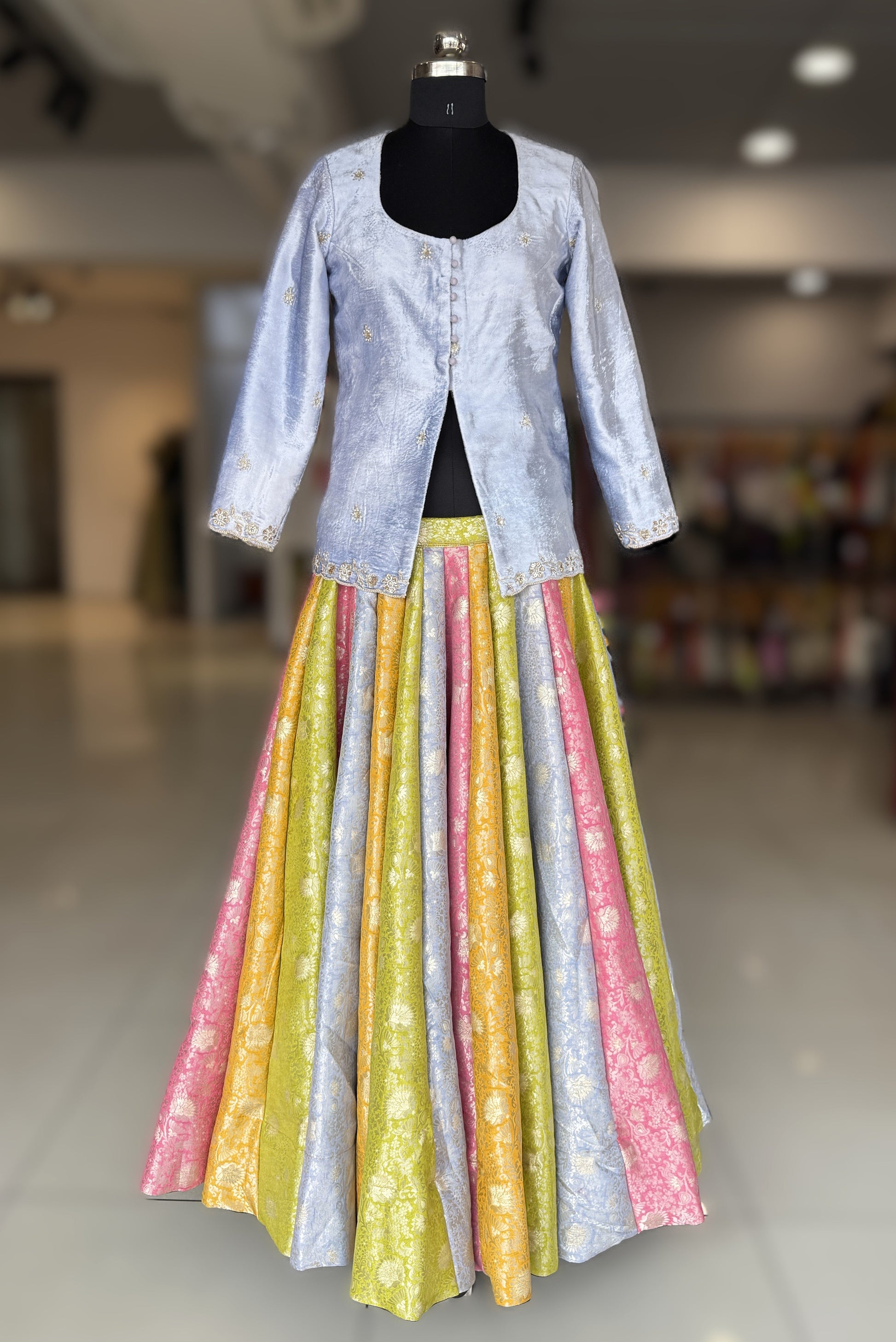 Experience the perfect fusion of traditional craftsmanship and contemporary elegance with this curated ensemble. The skirt showcases authentic Khinkhab Banarasi weaving across 24 kaliis, delivering over 9 meters of fluid fabric that moves with graceful intention. Its voluminous construction creates a mesmerizing twirl, ideal for weddings and celebrations. The coordinating Elsa blue velvet top features meticulous hand embroidery, combining luxurious texture with artisanal precision. The structured silhouette and refined neckline work in harmony, creating a sophisticated silhouette that honors heritage while embracing modern sensibilities. Together, these pieces form a versatile foundation for festive occasions and special moments.